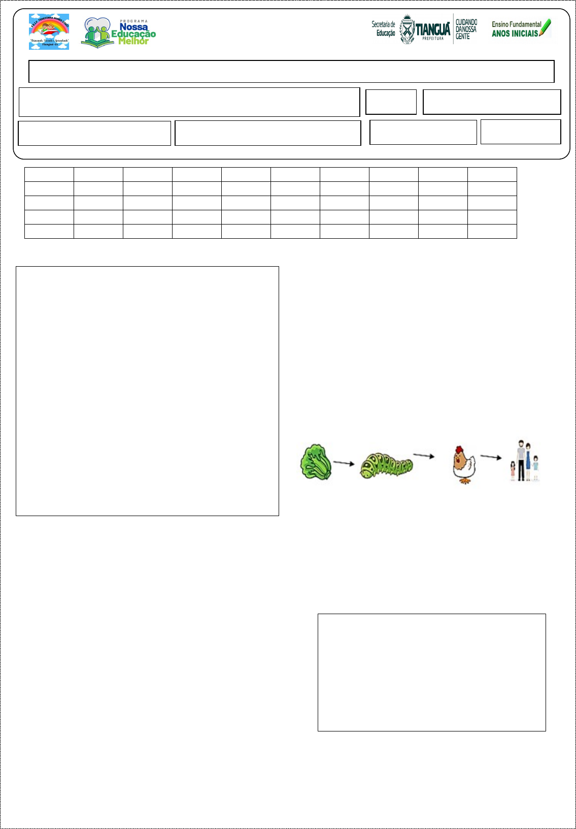 E. E. F. TEREZINHA NUNES DINIZ “Brincando, Vivendo e Aprendendo” INEP: 23271060 – Bairro Santo Antônio ANÁLISE DE APRENDIZAGEM DE CIÊNCIAS - II BIMESTRE ALUNO(A):___________________________________________ Nº: DATA:____/_____/2025 PROFESSOR (A): ANO: 4ºano A ( ) B ( ) C ( ) D ( ) TURNO: M ( ) T ( ) NOTA:____ 01 02 03 04 05 06 07 08 09 10 A A A A A A A A A A B B B B B B B B B B C C C C C C C C C C D D D D D D D D D D Leia o texto e responda as questões a seguir.Cadeia alimentar é uma sequência de seres vivos que dependem uns dos outros para sobreviver e produzir energia. A cadeia alimentar possui um fluxo de energia, que começa nos produtores, que são as plantas, dirige-se aos consumidores, como os animais herbívoros e os carnívoros e chega aos decompositores, como fungos e as bactérias, passando por vários níveis tróficos. O ciclo recomeça após os decompositores reciclarem a matéria orgânica. Com a extinção de algumas espécies de animais e vegetais, estão ocorrendo cada vez mais problemas nas cadeias alimentares e por consequência, prejuízos para o ecossistema. A caça predatória de animais, a poluição das águas, do ar e a contaminação dos rios são os fatores que influenciam diretamente na cadeia alimentar. 01 – A definição de cadeia alimentar é: A ( ) espécies de animais que entraram em extinção. B ( ) sequência de seres vivos que dependem uns dos outros para sobreviver e produzir energia. C ( ) caça de predatória de animais. D ( ) sequência de células presente nas folhas das plantas. 02 - Sobre os produtores, é CORRETO afirmar que: A ( ) são seres considerados a base da cadeia alimentar. B ( ) são seres que se alimentam de outros seres. C ( ) são seres que se alimenta dos consumidores. D ( ) são seres desnecessário na cadeia alimentar. 03 - Os decompositores são organismos que aproveitam os restos da matéria morta de outros seres e finalizam o ciclo dentro da cadeia alimentar, assim sendo, qual dos seres abaixo pertencem este grupo? A ( ) Plantas e coelho. B ( ) Rato e aves. C ( ) Humano e cobra. D ( ) Fungos e bactéria. 04 - Observe a imagem para responder à questão: · Dentre os seres listado na cadeia alimentar acima, qual deles corresponde um produtor? A ( ) O humano. C ( ) A galinha. B ( ) A alface. D ( ) A lagarta. Leia e responda as questões a seguir. Nas transformações reversíveis o material pode voltar a ser como era antes de ser transformado, o caso da água. Nas transformações reversíveis não há possibilidade do material retomar ao que era antes, o ocorre quando colocamos fogo em folha de papel ou mesmo cozinhamos um ovo. 05 - Marque a opção que mostra uma transformação reversível. A ( ) carne assada. C ( ) picolé. B ( ) ovo cozido. D ( ) cinzas de árvore. 06 - Observe as imagens abaixo. · Dessas imagens, a que apresenta uma transformação irreversível está indicada pelo número A ( ) 1. B ( ) 2. C ( ) 3. D ( ) .4 07 - Os estados da água, respectivamente representados, são: A ( ) quente, frio e morno. B ( ) gelo, gasosa, morna. C ( ) derretendo, congelada e fria. D ( ) sólido, líquido e gasoso. 08 - Os materiais se modificam ao longo do tempo. As mudanças podem ser provocadas pelo ser humano, por outros seres vivos, ou por outros fatores, como a ação da água, do vento, do gelo e do fogo. As transformações nos materiais podem ser reversíveis ou irreversíveis. · O ovo cozido, ele é uma: A ( ) Transformação reversível. B ( ) Transformação Irreversível. C ( ) Mistura Homogênea. D ( ) Combustão. · 09 - Observe, na imagem abaixo, a transformação de alguns cubos de chocolate em banho maria. · Nessa imagem, a transformação dos cubos de chocolate é causada por: A ( ) umidade. B ( ) luz do sol. C ( ) aquecimento. D ( ) resfriamento. 10 - As transformações reversíveis e não reversíveis desempenham papéis fundamentais na vida do ser humano em diversos aspectos como: ciclo da água e produção de alimentos, tecnologia e conforto, construção e fabricação, impacto ambiental e desenvolvimento sustentável. · É um exemplo de transformação reversível: A ( ) rasgar um papel. B ( ) congelar água para fazer gelo. C ( ) queimar uma folha. D ( ) cortar uma árvore para fazer papel. Boa Sorte! image3.png image4.png image5.png image1.png image2.png image6.jpeg image15.png image7.png image8.png image9.png image10.jpeg image11.png image12.png image13.png image14.png