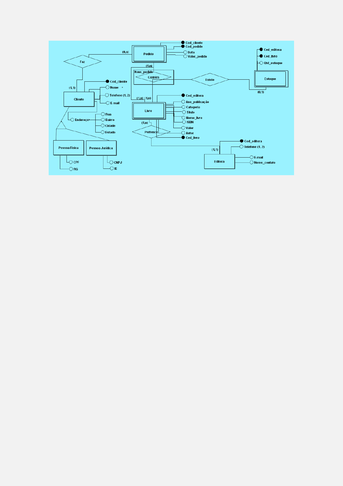 Entidades: id_cliente (PK), nome, endereco, telefone, email. id_produto (PK), nome_produto, descricao, preco_unitario. id_pedido (PK), id_cliente (FK), data_pedido, total_pedido. id_pedido (FK), id_produto (FK), quantidade, preco_item. Relacionamentos: Cliente 1:N Pedido Pedido 1:N Item_Pedido Produto N:1 Item_Pedido 2. Projeto Lógico Tabela Cliente: id_cliente INT PK nome VARCHAR(255) endereco VARCHAR(255) telefone VARCHAR(20) email VARCHAR(255) Tabela Produto: id_produto INT PK nome_produto VARCHAR(255) descricao TEXT preco_unitario DECIMAL(10, 2) Tabela Pedido: id_pedido INT PK id_cliente INT FK data_pedido DATE total_pedido DECIMAL(10, 2) Tabela Item_Pedido: id_pedido INT PK, FK id_produto INT PK, FK quantidade INT preco_item DECIMAL(10, 2) 3. Modelo Relacional (MR): CREATE TABLE Cliente ( id_cliente INT PRIMARY KEY, nome VARCHAR(255), endereco VARCHAR(255), telefone VARCHAR(20), email VARCHAR(255) CREATE TABLE Produto ( id_produto INT PRIMARY KEY, nome_produto VARCHAR(255), descricao TEXT, preco_unitario DECIMAL(10, 2) CREATE TABLE Pedido ( id_pedido INT PRIMARY KEY, id_cliente INT, data_pedido DATE, total_pedido DECIMAL(10, 2), FOREIGN KEY (id_cliente) REFERENCES Cliente(id_cliente) CREATE TABLE Item_Pedido ( id_pedido INT, id_produto INT, quantidade INT, preco_item DECIMAL(10, 2), PRIMARY KEY (id_pedido, id_produto), FOREIGN KEY (id_pedido) REFERENCES Pedido(id_pedido), FOREIGN KEY (id_produto) REFERENCES Produto(id_produto)