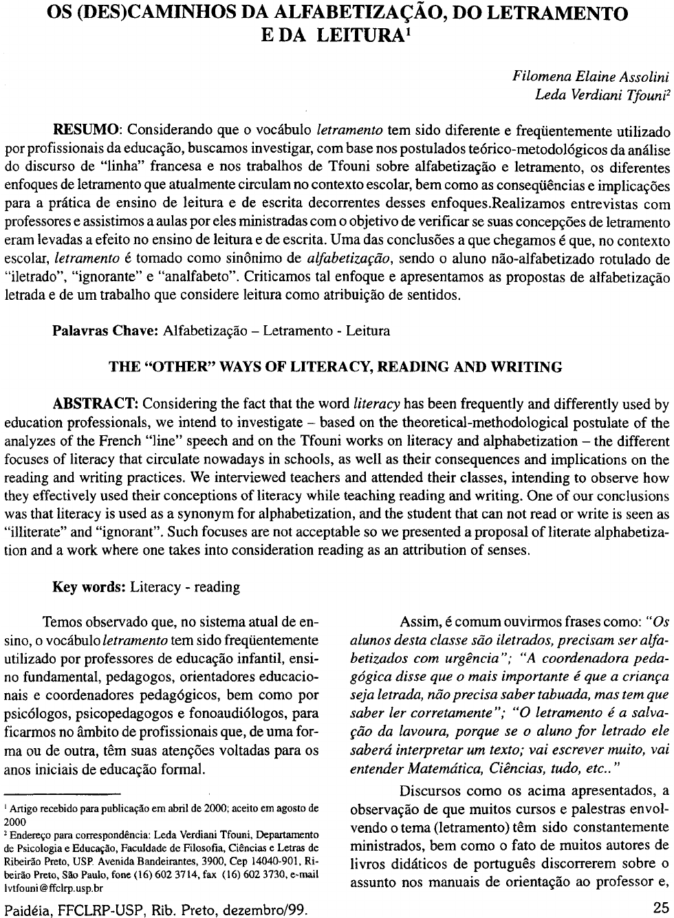 (DES)CAMINHOS DA ALFABETIZAÇÃO, DO LETRAMENTO E DA Filomena Elaine Assolini Leda Verdiani Tfouni² RESUMO: Considerando que o vocábulo letramento tem sido diferente e freqüentemente utilizado por profissionais da educação, buscamos investigar, com base nos postulados teórico-metodológicos da análise do discurso de "linha" francesa e nos trabalhos de Tfouni sobre alfabetização e letramento, os diferentes enfoques de letramento que atualmente circulam no contexto escolar, bem como as conseqüências e implicações para a prática de ensino de leitura e de escrita decorrentes desses enfoques. Realizamos entrevistas com professores e assistimos a aulas por eles ministradas com o objetivo de verificar se suas concepções de letramento eram levadas a efeito no ensino de leitura e de escrita. Uma das conclusões a que chegamos é que, no contexto escolar, letramento é tomado como sinônimo de alfabetização, sendo o aluno não-alfabetizado rotulado de "iletrado", "ignorante" e "analfabeto". Criticamos tal enfoque e apresentamos as propostas de alfabetização letrada e de um trabalho que considere leitura como atribuição de sentidos. Palavras Chave: Alfabetização Letramento Leitura THE "OTHER" WAYS OF LITERACY, READING AND WRITING ABSTRACT: Considering the fact that the word literacy has been frequently and differently used by education professionals, we intend to investigate based on the theoretical-methodological postulate of the analyzes of the French "line" speech and on the Tfouni works on literacy and alphabetization the different focuses of literacy that circulate nowadays in schools, as well as their consequences and implications on the reading and writing practices. We interviewed teachers and attended their classes, intending to observe how they effectively used their conceptions of literacy while teaching reading and writing. One of our conclusions was that literacy is used as a synonym for alphabetization, and the student that can not read or write is seen as "illiterate" and "ignorant". Such focuses are not acceptable so we presented a proposal of literate alphabetiza- tion and a work where one takes into consideration reading as an attribution of senses. Key words: Literacy reading Temos observado que, no sistema atual de en- Assim, é comum ouvirmos frases como: "Os sino, o vocábulo letramento tem sido freqüentemente alunos desta classe são iletrados, precisam ser alfa- utilizado por professores de educação infantil, ensi- betizados com urgência"; "A coordenadora peda- no fundamental, pedagogos, orientadores educacio- gógica disse que o mais importante é que a criança nais e coordenadores pedagógicos, bem como por seja letrada, não precisa saber tabuada, mas tem que psicólogos, psicopedagogos e fonoaudiólogos, para saber ler "O letramento é a salva- ficarmos no âmbito de profissionais que, de uma for- ção da lavoura, porque se aluno for letrado ele ma ou de outra, têm suas atenções voltadas para os saberá interpretar um texto; vai escrever muito, vai anos iniciais de educação formal. entender Matemática, Ciências, tudo, etc.." Discursos como os acima apresentados, a Artigo recebido para publicação em abril de 2000; aceito em agosto de observação de que muitos cursos e palestras envol- 2000 vendo o tema (letramento) têm sido constantemente Endereço para correspondência: Leda Verdiani Tfouni, Departamento de Psicologia e Educação, Faculdade de Filosofia, Ciências e Letras de ministrados, bem como o fato de muitos autores de Ribeirão Preto, USP. Avenida Bandeirantes, 3900, Cep 14040-901, Ri- livros didáticos de português discorrerem sobre o beirão Preto, São Paulo, fone fax e-mail lvtfouni@ffclrp.usp.br assunto nos manuais de orientação ao professor e, Paidéia, FFCLRP-USP, Rib. Preto, dezembro/99. 25ainda, a abordagem sobre letramento, apresentada nos cas, formações discursivas, sentido e protagonistas Parâmetros Curriculares Nacionais P.C.N(s), ou seja, do discurso. "(...) como produto da participação em práticas soci- No que diz respeito ideológicas, ais que usam a escrita como sistema simbólico e podemos afirmar, com base em Haroche, Henry e tecnologia" (1997, p.23) motivou-nos a investigar Pêcheux (1971), que "(...) elas constituem um con- como o termo letramento tem sido tratado pela e na junto complexo de atividades e representações, que instituição escolar, assim como as conseqüências e não são nem individuais, nem universais, mas se re- implicações para uma prática pedagógica de ensino portam mais ou menos diretamente às posições de de leitura e escrita decorrentes desse tratamento, nas classe, em conflito umas com as outras" (p. 102). séries iniciais do ensino fundamental. Dessas formações ideológicas fazem parte, enquan- Para alcançar nosso objetivo, ou seja, verifi- to componentes, uma ou mais formações discursivas car os enfoques de letramento que atualmente circu- interligadas. lam na escola e as práticas pedagógicas que se efeti- As formações discursivas, por sua vez, são vam a partir desses enfoques, valemo-nos dos pos- concebidas por Pêcheux (1990) como aquilo que, tulados teóricos e metodológicos da análise do dis- "(...) numa formação ideológica dada, isto é, a partir curso de "linha" francesa e dos trabalhos de Tfouni de uma posição dada numa conjuntura dada, deter- (1994, 1995, 1996) sobre letramento e alfabetização. minada pelo estado de luta de classes, determina o Cumpre ressaltar, por fim, que este trabalho que pode e deve ser dito". (p. 160). não se restringe a denunciar os usos (e abusos) do Dentro desse contexto, gostaríamos de desta- vocábulo letramento, mas se preocupa também em car que, na perspectiva discursiva, os sentidos não apresentar propostas teóricas que possam contribuir nascem "do nada", eles são, isto sim, sócio-histori- com os educadores de maneira geral, no sentido de camente construídos. Decorre daí o porquê de levá-los