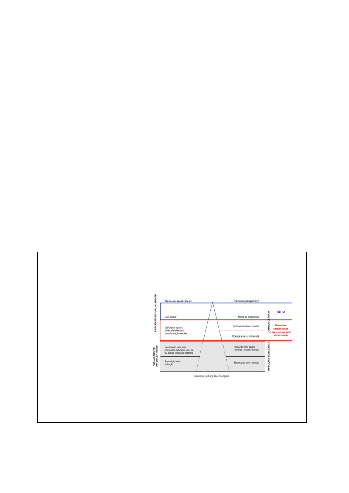 Patogênese das infecções virais Patogênese das infecções virais ● Assim que acontece a infecção, inicia-se a patogênese, está relacionada a interação de fatores virais e do hospedeiro, que levam à produção de doença, o que faz com que determinadas infecções sejam mais ou menos patogênicas (fatores que vão depender do vírus - virulência de microrganismos e do hospedeiro - idade, estado nutricional) - um vírus patogênico tem que ser capaz de infectar e causar doença em um hospedeiro suscetível ● Infecção viral; - Localizada (restrita àquele local de entrada - herpesvírus, lesão no epitélio ou na mucosa ) ou disseminada, sintomática ou assintomática, aguda ou crônica (que os indivíduos não conseguem eliminar os agentes infecciosos - HIV, Hepatite B alta chance de cronificar em indivíduos de menor idade) - Algumas infecções virais podem causar uma síndrome; grupo de sinais e sintomas específicos Conceito iceberg das infecções Só conseguimos ver o que está à vista dos nossos olhos, mas uma infecção está em nível microscópico. Pacientes sintomáticos (desenvolver a doença e apresentar sintomas), depende dos aspectos do vírus e do hospedeiro para caracterizar se esses sintomas serão mais leves ou mais graves, então o que determina se a doença será leve, moderada ou severa é o equilíbrio entre os fatores patógeno e do hospedeiro. E a pontinha do iceberg são aqueles que vão a óbito e na base estão os que não desenvolveram a doença ou estão assintomáticos Emanuele Dionizio Este material está vinculado à docência em Virologia e está sendo divulgado aos alunos do 5° período como complementação em seus estudos. Não está autorizado a divulgação desse material Condições para o desenvolvimento de uma infecção viral 1. Penetrar no hospedeiro pela via adequada - entrada no hospedeiro, diferentes portas de entrada no organismo, cada vírus vai ter preferência por cada via que vai levá-lo para dentro de sua célula alvo (tropismo) 2. Realizar replicação primária em tecidos próximos à entrada - iniciar sua biossíntese, formar partículas virais Replicação Primária - o vírus entrou, chegou na célula de tropismo e começou sua replicação, se dá naqueles tecidos que estão próximo a porta de entrada 3. Escapar dos mecanismos naturais de defesa do organismo (pele íntegra, acidez, mecanismos inatos defesa que precisam ser burlados para que a infecção aconteça) 4. Disseminar-se para os tecidos e órgãos alvo - existem vírus que precisam ir além para chegar na célula, geralmente essa disseminação se dá por via vasos linfáticos e depois sanguíneo 5. Replicar eficientemente nas células alvo 6. Produzir ou não injúria tecidual 7. Gerar a progênie viral que vai infectar novas células ou indivíduos Etapas do desenvolvimento da doença viral 1. Transmissão (diferentes rotas de entrada) 2. Disseminação até seu órgão alvo 3. Replicação 4. Lesão (que pode ocorrer, sintomatologia - presença de sintomas) 5. Doença 6. Excreção do vírus Vias de transmissão Horizontal ● Individuo - individuo intraespecífica - da mesma espécie interespecífica - de espécies diferentes Contato direto ● Indivíduo infectado para indivíduo susceptível (no caso de uma infecção intraespecifica) ● interespecífica - raiva Emanuele Dionizio Este material está vinculado à docência em Virologia e está sendo divulgado aos alunos do 5° período como complementação em seus estudos. Não está autorizado a divulgação desse material Contato indireto ● Contato com sangue contaminado (agulhas, seringas): exposição mucosa ou percutânea ● fômites, aerossóis, gotículas ● vetores (geralmente artrópodes) Vertical/perinatal ● mãe para filho ● vertical - via placenta ● perinatal - na hora do parto ou através da amamentação Ex.; a mãe possui herpes genital (tipo 2), quando o bebe passa pelo canal genital, tem contato com lesões que possuem as partículas virais e é infectado (herpes simples) Rotas de entrada Mecanismos de entrada ● pele (integra) grande barreira de proteção, arranhões, feridas, picadas ● mucosas ● sexual ● conjuntival ● inalação ou ingestão Zoonoses - infecções adquiridas de animais e transmitidas através de um vetor que podem ser artrópodes, mamíferos Ex.: Febre amarela (transmissões indiretas através do vetor) Pacientes que fazem o compartilhamento de seringas podem ter dupla/tripla infecção Ortomixovirus - influenza Transmissão enteral - ingestão de alimentos e/ou água contaminados Conjuntivites Emanuele Dionizio Este material está vinculado à docência em Virologia e está sendo divulgado aos alunos do 5° período como complementação em seus estudos. Não está autorizado a divulgação desse material Emanuele Dionizio Este material está vinculado à docência em Virologia e está sendo divulgado aos alunos do 5° período como complementação em seus estudos. Não está autorizado a divulgação desse material Porta de entrada Características Pele (íntegra) Camada epidérmica queratinizada - barreira da imunidade inata (natural) Picada de artrópode (vetor): Arbovírus Pequenas lesões: HPV, HSV, HBV Mordida de animal: Rabdovírus Iatrogênica (intervenção humana - ex.: compartilhando seringas): HBV, HCV, HIV ● O vetor inocula o vírus a nível de derme onde se tem vasos linfáticos e vasos sanguíneos, por onde o vírus pode circular Mucosa do Trato Respiratório Mecanismos de proteção ● Muco, movimentos ciliares (da região mais interna para externa) Infecções respiratórias localizadas Rinovírus, Parainfluenza, Influenza, Coronavírus, RSV, muitos Adenovírus e alguns enterovírus Doenças generalizadas - porta de entrada o sistema respiratório, vão para a corrente sanguínea para irem para outros órgãos, infectar outras células Vírus da caxumba, sarampo, rubéola, catapora e varíola Mucosa do Trato Digest