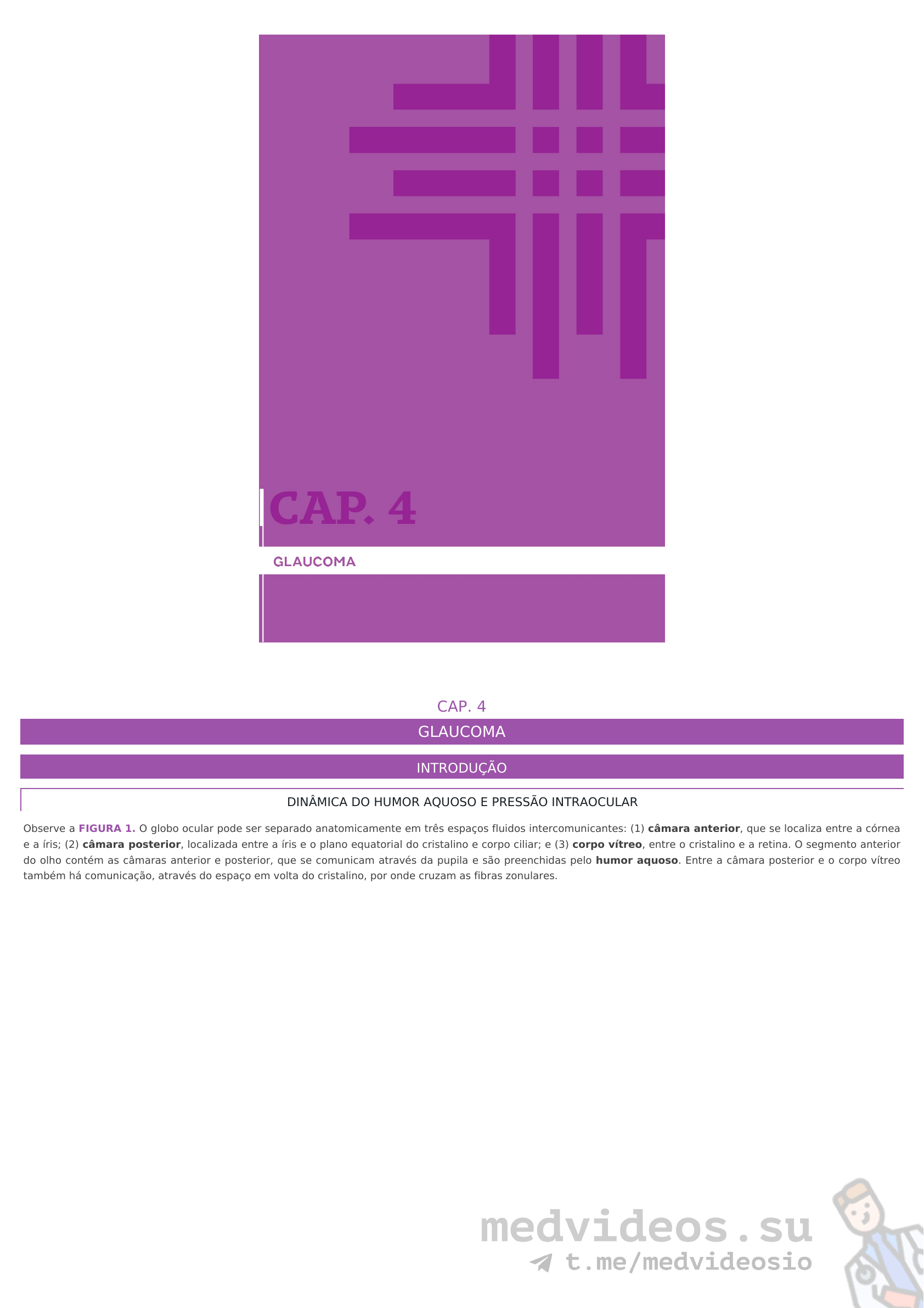 CAP. 4 GLAUCOMA INTRODUÇÃO DINÂMICA DO HUMOR AQUOSO E PRESSÃO INTRAOCULAR Observe a O globo ocular pode ser separado anatomicamente em três espaços fluidos intercomunicantes: (1) câmara anterior, que se localiza entre a córnea e a íris; (2) câmara posterior, localizada entre a íris e o plano equatorial do cristalino e corpo ciliar; e (3) corpo vítreo, entre o cristalino e a retina. O segmento anterior do olho contém as câmaras anterior e posterior, que se comunicam através da pupila e são preenchidas pelo humor aquoso. Entre a câmara posterior e o corpo vítreo também há comunicação, através do espaço em volta do cristalino, por onde cruzam as fibras zonulares. FIGURA 1. O humor aquoso está em constante renovação, existindo um perfeito equilíbrio entre a sua produção e drenagem. PRODUÇÃO DO HUMOR AQUOSO O humor aquoso é produzido pelas células do epitélio duplo do corpo ciliar, sendo lançado na câmara posterior do olho, entre a íris e o cristalino. As células do corpo ciliar secretam sódio, cloreto e bicarbonato (HCO3) que carreiam água por mecanismo osmótico. Cerca de 70% do sódio secretado acompanha a secreção de bicarbonato que, por sua vez, depende da ação da anidrase carbônica, uma enzima intracelular que converte CO2 + H2O em H2CO3, que prontamente se dissocia em H+ + HCO3. Agora você também pode compreender o uso da acetazolamida (Diamox) no glaucoma, um fenômeno geralmente não bem explicado nos principais livros-texto. A acetazolamida é um inibidor da anidrase carbônica e, portanto, inibe a secreção de bicarbonato pelo corpo ciliar, com isso reduzindo a produção de humor aquoso e consequentemente a pressão intraocular. As catecolaminas também influem na regulação da secreção de humor aquoso pelo corpo ciliar, por mecanismos não conhecidos. O efeito beta-adrenérgico aumenta enquanto que o efeito alfa-2-adrenérgico reduz a produção de humor aquoso. Não é por acaso que colírios de betabloqueadores e de alfa-2-agonistas são utilizados para reduzir a produção de humor aquoso e assim baixarem a pressão intraocular no glaucoma! Os alfa-2-agonistas também agem aumentando a drenagem do humor aquoso (ver adiante). DRENAGEM DO HUMOR AQUOSO Em condições normais, cerca de 80–95% da drenagem do humor aquoso ocorre no ângulo de filtração iridocorneano, a chamada “via convencional”, e os 5–20% restantes por uma “via alternativa”, através do fluxo uveoescleral. Via Convencional (ângulo de filtração iridocorneano): este mecanismo é fundamental para o entendimento do glaucoma e a sua terapia. Observe novamente a o fluxo do humor aquoso é direcionado da câmara posterior para a câmara anterior através da pupila. Uma vez na câmara anterior, este líquido é drenado por tecidos do ângulo de filtração iridocorneano. Neste local existe uma estrutura denominada rede trabecular (trabeculado corneoescleral), que acompanha toda a circunferência da junção iridocorneana em conjunto com mais duas estruturas: o esporão escleral, interpondo-se entre a rede trabecular e a raiz da íris, e o canal de Schlemm, um microvaso de drenagem. O humor aquoso é filtrado na rede trabecular, ganhando o canal de Schlemm, de onde flui para o plexo venoso episcleral. Fig. 1: Anatomia da câmara anterior e posterior do olho e o fluxo normal de produção e drenagem do humor aquoso (via convencional e via alternativa). FIGURA 1... Agentes colinérgicos (mióticos), como o colírio pilocarpina, aumentam a drenagem do humor aquoso por esta via por aumentar a contração do músculo ciliar e do esfíncter da pupila, provocando tensão do esporão escleral e consequentemente a “abertura” das trabéculas da rede trabecular, deste modo reduzindo a pressão intraocular. As fibras longitudinais do músculo ciliar ligam o esporão escleral ao estroma coroide, daí o seu efeito de abertura trabecular. O esfíncter da íris contrai para provocar a miose pupilar; a pupila miótica traciona a raiz da íris junto ao esporão escleral e as trabéculas. Agentes que provocam midríase, como os colírios cicloplégicos (usados em exames de refração e de fundoscopia), podem desencadear uma crise aguda de glaucoma em pacientes que apresentam o ângulo de filtração anatomicamente pequeno (ângulo fechado), provocando grandes aumentos da pressão intraocular! Este fenômeno não acontece nos indivíduos com glaucoma de ângulo aberto! São duas as explicações para a crise de glaucoma de ângulo fechado por essas drogas: (1) afrouxamento da raiz da íris, obstruindo a rede trabecular; e (2) bloqueio pupilar: a posição de meia-midríase coloca a íris em justo contato com cristalino, o que poderia provocar um bloqueio pupilar parcial ou total. Este bloqueio dificulta a passagem do humor aquoso entre a câmara posterior e anterior, criando um gradiente de pressão que desloca a íris anteriormente, provocando a obstrução do ângulo de filtração. Via Alternativa (uveoescleral): uma parte do humor aquoso (5–20%) é drenada sem passar pela rede trabecular, difundindo-se através de canais que correm pela raiz da íris e pelo músculo ciliar até alcançar o vasos da esclera Os análogos da prostaglandina Falfa, como o colírio de latanoprost, aumentam o fluxo do humor aquoso por esta via e atualmente são as drogas mais usadas no tratamento do glaucoma de ângulo aberto nos EUA. PRESSÃO INTRAOCULAR (PIO) A pressão intraocular de indivíduos hígidos costuma ser de 14 a 16 mmHg, embora a faixa considerada normal seja de 12–21 mmHg. Portanto, o aumento da PIO é definido quando acima de 21 mmHg. Um dos problemas na confiabilidade da medida da PIO é a sua variação circadiana, com níveis maiores de manhã (entre 08h e 11h) e menores de madrugada (entre 0h e 2h). O exame mais usado para medi-la é a tonometria de aplainação (ver adiante). Como o globo ocular não pode aumentar o seu volume, o aumento da quantidade de humor aquo