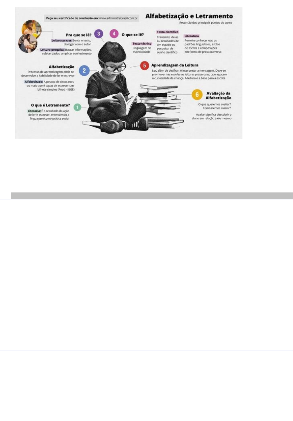 Questão 01 Fonte: Administra Brasil. Disponível em: https://i.pinimg.com/564x/7b/82/71/7b82716739aa33c7ccdcc4edadc66e4d.jpg Tendo por base a análise do infográfico acima e levando em consideração os conceitos que permeiam o processo de alfabetização e letramento, assinale a alternativa INCORRETA. CLIQUE NA SUA RESPOSTA ABAIXO A alfabetização é um processo complexo e abrangente, que busca inserir o indivíduo à comunicação interativa. O analfabetismo funcional é causa direta do letramento deficitário, já que busca única e exclusivamente o entendimento racional do mundo, sem relacionar a linguagem ao cotidiano. Além da importância da capacidade de leitura, é de interesse do processo linguístico que haja a formação do pensamento crítico e a aplicação da comunicação eficiente em momentos cotidianos. A linguística aplicada compreende que as dinâmicas sociais e comportamentais do ser humano interferem no processo de alfabetização e letramento. O entendimento do contexto social do aluno no processo de aprendizagem é fundamental para a eficácia do ensino, garantindo maior identificação com a linguagem. Questão 02 (ENADE - ADAPTADA) O conceito de letramento é muito difícil de ser especificado, porque remete tanto a um estado que acede um sujeito quanto às habilidades deste mesmo sujeito de movimentar- se num mundo povoado de textos, tanto como leitor quanto como autor de novos textos a enriquecer o patrimônio de enunciados concretos disponível em diferentes esferas da comunicação social de uma dada sociedade. Ainda que o conceito teórico não se limite aos processos de iniciação ao mundo da escrita, é particularmente estes processos de iniciação que têm sido aplicados por nós, como se “letramento” fosse o nome a se dar à iniciação dos sujeitos sociais num mundo a que, por este processo, passaria a ter acesso. Uma escola, qualquer que seja a escola, não poderia adotar níveis de letramento distintos para sujeitos sociais distintos, trabalhando para que alguns apenas cheguem a “respostas adequadas” ao seu contexto e levando outros a um letramento que lhes permita compreender as relações sociais, aprofundá-las ou trabalhar para modificá-las de forma crítica. Uma escola jamais poderá pôr como seus objetivos “respostas adequadas”, mas, sim, respostas críticas e, para chegar ao nível da crítica, é preciso definir-se como lugar de ensino-aprendizagem não da totalidade dos campos das atividades humanas (e, portanto, introdutora dos sujeitos sociais a todos os gêneros de discurso), mas de áreas socialmente privilegiadas que levem à constituição de sujeitos sociais críticos e eticamente responsáveis, no sentido de responsabilidade tal como cunhado por Bakhtin (2010): não uma responsabilidade moral para consigo mesmo, mas uma responsabilidade ética fundante da relação com a alteridade. (GERALDI, J. W. A produção dos diferentes letramentos. Bakhtiniana, São Paulo, v. 9, n. 2, p. 25-34, 2014. Adaptado). Com base no texto acima, avalie as afirmações a seguir. I.O letramento remete a um estado em que o sujeito é o produtor de enunciados nas diferentes esferas da comunicação e das relações sociais de uma sociedade. II.Os processos de iniciação ao mundo da escrita caracterizam o letramento, sendo fundamental ao ensino de todos os gêneros discursivos e textuais na escola. III.O autor do texto compreende o processo de letramento na perspectiva da formação de sujeitos críticos e eticamente responsáveis, não apenas com sua individualidade, mas com a responsabilidade ética fundante da relação do Eu com o Outro. IV.No âmbito escolar, os processos de letramento devem ser direcionados para que os estudantes alcancem as respostas adequadas ao seu contexto e, posteriormente, compreendam, de forma crítica, as relações sociais. É correto apenas o que se afirma em: CLIQUE NA SUA RESPOSTA ABAIXO II, III e IV. I e III. I e II. III e IV. I, II e IV. Questão 03 (ENADE) Com base em estudos recentes, podemos afirmar que alfabetização e letramento são processos construídos independentemente um do outro, de modo que cada um deles deve ser assumido em sua particularidade e de forma independente, especialmente PORQUE O processo motor da escrita na criança não é o mesmo que o do processo cognitivo da leitura, sendo que ambos os processos se dão por acumulação de informação, pela imitação de destrezas e habilidades repetitivas e em um saber enciclopédico. Acerca desse enunciado, assinale a opção correta. CLIQUE NA SUA RESPOSTA ABAIXO Tanto a primeira como a segunda asserção são proposições falsas. A primeira asserção é uma proposição verdadeira, e a segunda é uma proposição falsa. As duas asserções são proposições verdadeiras, mas a segunda não é uma justificativa correta da primeira. As duas asserções são proposições verdadeiras, e a segunda é uma justificativa correta da primeira. A primeira asserção é uma proposição falsa, e a segunda é uma proposição verdadeira. Questão 04 (UNESC - ADAPTADA) Magda Soares define letramento como “a participação em eventos variados de leitura e de escrita, e o consequente desenvolvimento de habilidades de uso da leitura nas práticas sociais que envolvem a língua escrita.” (SOARES, 2003, p. 16). Nesse contexto, são considerados conhecimentos específicos do processo de letramento: CLIQUE NA SUA RESPOSTA ABAIXO a orientação sistemática da leitura e da escrita. a leitura e escrita de letras, sílabas e palavras. a convivência do aluno com muitos materiais escritos. respeito às variantes linguísticas dos estudantes. a aprendizagem das letras e sílabas. Questão 05 No Brasil, as pesquisas sobre letramento vêm sendo desenvolvidas com o objetivo de explicar o efeito social da leitura e da escrita nos estudos sobre alfabetização. A partir do fragmento acima, analise as afirmativas a seguir. I. O letramento traz à tona o car