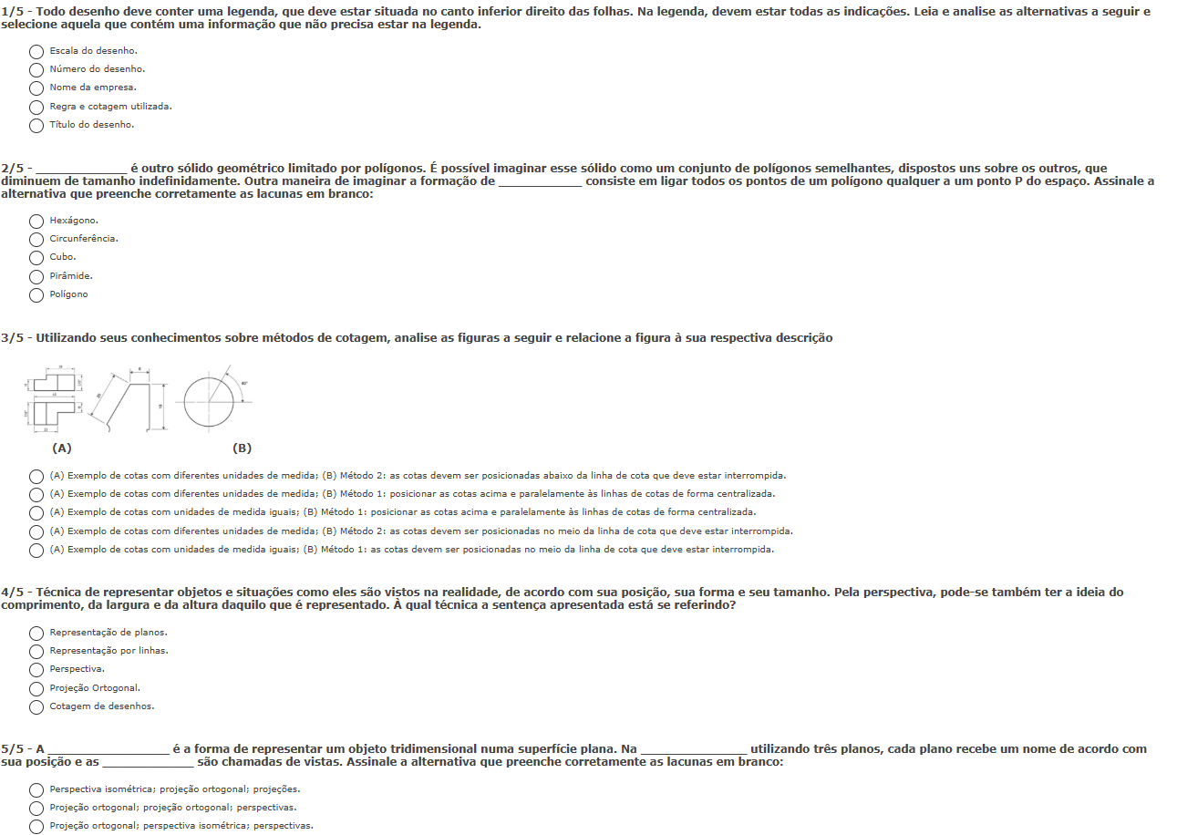 1/5 Todo desenho deve conter uma legenda, que deve estar situada no canto inferior direito das folhas. Na legenda, devem estar todas as indicações. Leia e analise as alternativas a seguir e selecione aquela que contém uma informação que não precisa estar na legenda. Escala do desenho. Número do desenho. Nome da empresa. Regra e cotagem utilizada. Título do desenho. 2/5 é outro sólido geométrico limitado por polígonos. É possível imaginar esse sólido como um conjunto de polígonos semelhantes, dispostos uns sobre 05 outros, que diminuem de tamanho indefinidamente. Outra maneira de imaginar a formação de consiste em ligar todos 05 pontos de um polígono qualquer a um ponto P do espaço. Assinale a alternativa que preenche corretamente as lacunas em branco: Hexágono. Circunferência. Cubo. Pirâmide. Polígono 3/5 Utilizando seus conhecimentos sobre métodos de cotagem, analise as figuras a seguir e relacione a figura à sua respectiva descrição (A) (B) (A) Exemplo de cotas com diferentes unidades de (B) Método 2: as cotas devem ser posicionadas abaixo da linha de cota que deve estar interrompida. (A) Exemplo de cotas com diferentes unidades de (B) Método 1: posicionar as cotas acima e paralelamente às linhas de cotas de forma centralizada. (A) Exemplo de cotas com unidades de medida iguais; (B) Método 1: posicionar as cotas acima e paralelamente às linhas de cotas de forma centralizada. (A) Exemplo de cotas com diferentes unidades de medida; (B) Método 2: as cotas devem ser posicionadas no meio da linha de cota que deve estar interrompida. (A) Exemplo de cotas com unidades de medida iguais; (B) Método 1: as cotas devem ser posicionadas no meio da linha de cota que deve estar interrompida. 4/5 Técnica de representar objetos e situações como eles são vistos na realidade, de acordo com sua posição, sua forma e seu tamanho. Pela perspectiva, pode-se também ter a ideia do comprimento, da largura e da altura daquilo que é representado. À qual técnica a sentença apresentada está se referindo? Representação de planos. Representação por linhas. Perspectiva. Projeção Ortogonal. Cotagem de desenhos. 5/5 A é a forma de representar um objeto tridimensional numa superfície plana. Na utilizando três planos, cada plano recebe um nome de acordo com sua posição e as são chamadas de vistas. Assinale a alternativa que preenche corretamente as lacunas em branco: Perspectiva isométrica; projeção ortogonal; projeções. Projeção ortogonal; projeção ortogonal; perspectivas. Projeção ortogonal; perspectiva isométrica; perspectivas.