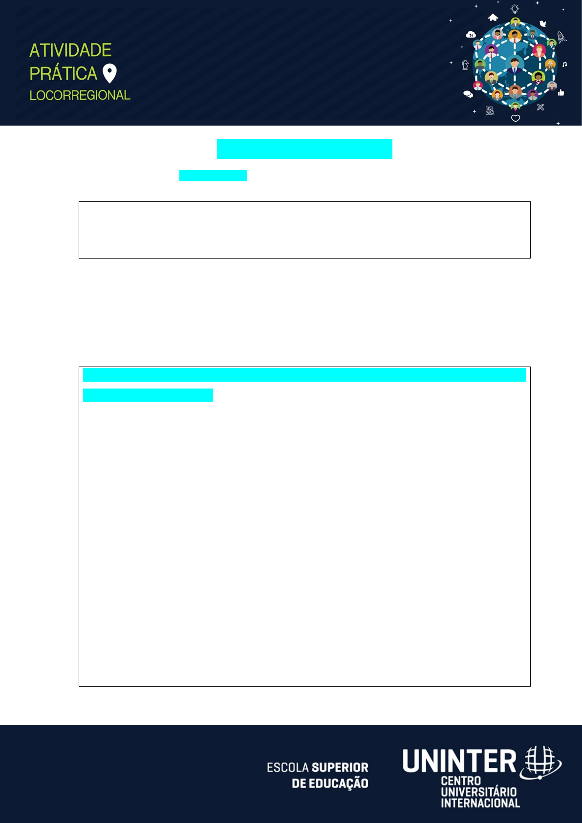 TEMPLATE MODELO Esse é o modelo que deve ser utilizado para a produção da Atividade Locorregional. Onde o texto está em realce turquesa, você deve apagar e preencher com as suas informações. NOME: RU: POLO: REGISTRO DA ATIVIDADE PRÁTICA LOCORREGIONAL PROJETOS INTERDISCIPLINARES EM CIÊNCIAS EXATAS E NATURAIS 1º MOMENTO – PESQUISA (Aqui você fará um relato das informações que obteve na entrevista com o profissional pesquisado.) 2º MOMENTO – ELABORAÇÃO DA SEQUÊNCIA DE ATIVIDADES INTERDISCIPLINARES 1. COMPONENTE CURRICULAR CIÊNCIAS Ano: (aqui você apresenta o ano que escolheu.) Objeto de Conhecimento: (aqui você descreve o objeto de conhecimento que escolheu na BNCC, para o ano selecionado.) Habilidade: (aqui você descreve a habilidade, apresentada na BNCC, que está relacionada ao objeto de conhecimento) 2. COMPONENTE CURRICULAR MATEMÁTICA Ano: (aqui você apresenta o mesmo ano que escolheu para o componente curricular acima.) Objeto de Conhecimento: (aqui você descreve o objeto de conhecimento que escolheu na BNCC, para o ano selecionado.) Habilidade: (aqui você descreve a habilidade, apresentada na BNCC, que está relacionada ao objeto de conhecimento.) 3. ATIVIDADE LÚDICA (Aqui é o momento para você descrever sobre a atividade que criou. De maneira breve, explique como a atividade se relaciona aos Objetos de Conhecimento e as Habilidades apresentadas acima, destacando o nome do jogo e o objetivo do jogo.) 4. ENCAMINHAMENTO METODOLÓGICO - Mobilização do Conhecimento: (aqui você descreverá como será a explicação dos assuntos abordados na atividade. Por exemplo, por meio de perguntas coletivas, reflexões, imagens, contação de histórias, roda de conversa...) - Realização da Atividade: (aqui você descreverá o desenvolvimento da atividade criou, o passo a passo do jogo.) - Avaliação: (aqui você escreverá o processo de avalição, por exemplo: por meio da observação do envolvimento dos estudantes na atividade.) - Registro Da Atividade Locorregional: (aqui você deverá apresentar as fotos das etapas da confecção e do jogo finalizado.) 6. REFERÊNCIAS (aqui você apresentará as referências utilizadas para realizar essa atividade) BRASIL. Ministério da Educação. Base Nacional Comum Curricular. Brasília: MEC, 2018. image1.png image2.png