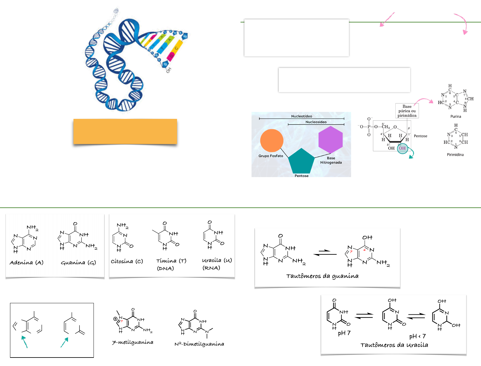 1 Ácidos Nucleicos Profa. Dra. Patrícia B. Brondani Ácidos Nucleicos Caráter ácido Originalmente descobertos no núcleo DNA: Ácido Desoxirribonucleico RNA: Ácido Ribonucleico Função: armazenar ou transmitir a informação genética Polímeros formados por nucleotídeos H = DNA (Desoxirribonucleico) OH = RNA (Ribonucleico) 2 Bases Nitrogenadas Enumerando as bases nitrogenadas N NNH N x 1 2 34 5 6 7 8 9 N NH x O1 2 3 4 5 6 A ribose se liga aqui Exemplos de nomenclatura PIRIMÍDICAS PÚRICAS Previne mutações 3 Bases Nitrogenadas Equilíbrio tautomérico 4 Nucleotídeos Ligação glicosídica liga um açúcar (pelo Canomérico) a alguma outra molécula 5 Nucleotídeos mais comuns Todas as estruturas são mostradas no ph 7 Guanosina (nucelosídeo) Guanina O OHOH OHGuanina O HOH OP O O O Desoxiguanosina (dG) 5’-monofosfato 6 Polimerização dos Nucleotídeos Ligações fosfodiéster no esqueleto covalente do DNA e do RNA As extremidades 5’ e 3’ da macromolécula podem estar livres ou podem estar ligados a um grupo fosforil. 7 Estrutura abreviada Ex.: pA = 5’-monofosfato de adenosina (5'-AMP) e Ap = 3'-AMP. Para indicar a posição no açúcar ao qual o grupo fosfato está ligado: A letra “p” é escrita à esquerda do código de uma letra para que a base represente um nucleotídeo 5', e o à direita para representar um nucleotídeo 3.' P P P P P OH A C G T A Extremidade 5’ Extremidade 3’ pA-C-G-T-AOH, pApCpGpTpA, pACGTA ou ACGTA Ligação fosfodiéster 3’ 5’ 5’ 3’ 8 Estrutura do DNA Emparelhamento das fitas ✓ Dupla hélice, por James Watson e Francis Crick (1953) A T C G T A A T C G T A A T C G T A A T C G 9 ✓ Rosalin Franklin (Foto 51) Avanços na biologia molecular Estrutura do DNA Emparelhamento das fitas A = T e C = G Regra de Chargaff ✓ Determinadas por difração de Raios X e analises químicas A T C G T A A T C G T A A T C G T A A T C G DNA = 2 cadeias de polinucleotídeos enroladas uma na outra Pareamento complementar em toda hélice = fitas complementares 10 ✓ Uma volta completa: 10 pares de bases - distância de 34 A (3,4 nm). ✓ Pares de bases individuais: 3,4 A (0,34 nm) um do outro. ✓ O diâmetro interno tem 11 A (1,1 nm) e o externo 20 A. ✓ Sulcos*: um maior e um menor. Estrutura do DNA Podem ser sítios de ligação de medicamentos e peptídeos ao DNA 3,4 A (Pares de bases individuais Sinais negativos = grupos fosfato Neutralizados por íons + (Na+ ou Mg2+) e polipeptídios com carga * Espaços vazios no cilindro imaginário, pois os átomos que compõem as duas cadeias do polinucleotídeo da DH não o preenchem completamente 11 Estrutura do DNA O pareamento das bases: Antiparalela N NN N N N N O O C-1’ Adenina HH C-1’H Timina 2 Lig. Hidrogênio N NN N O N Guanina H H H NN O Citosina N C-1’ H H C-1’ 3 Lig. Hidrogênio5’3’ Padrões de LH no pareamento de bases (Watson e Crick) O Alinhamento da hélice é determinada por lig. de Hidrogênio 12 Estrutura do DNA RESUMINDO: As cadeias de DNA são constituídas por duas cadeias polinucleotídicas, orientadas no sentido inverso uma em relação a outra (antiparalelas) e enroladas uma sobre a outra. As duas cadeias se mantém unidas pelas ligações de hidrogênio entre os pares de bases complementares 13 Alterações Mutagênicas Agentes alquilantes podem alterar algumas bases do DNA e afetar a interação com a base correspondente ❖ Metilação da guanina com dimetilsulfato 6NH NN H N O NH2 Tautômeros da guanina N NN H N OH NH2 6 N NN H N OMe NH2 (CH3)SO4 O6-Metilguanina “Cancelam” o pareamento 14 N NN N O N Guanina H H H NN O Citosina N C-1’ H H C-1’ 3 Lig. Hidrogênio Alterações Mutagênicas Outros exemplos ❖ Dano oxidativo (fonte de alterações mutagênicas mais importantes) Espécies reativas de oxigênio: H2O2 e OH radicalar, surgem durante irradiação ou como um subproduto do metabolismo aeróbio. Entretanto, uma fração desses oxidantes escapa das defesas celulares e o dano ao DNA ocorre por meio de um grande e complexo grupo de reações, que variam de oxidação da desoxirribose e das bases a quebras na hélice. Produtos inofensivos Espécies reativas de oxigênio Sistemas de defesa das células (enzimas) 15 Muitos compostos carcinogênicos nos alimentos, na água e no ar exercem seus efeitos cancerígenos por modificações das bases do DNA. Apesar disso, a manutenção da integridade do DNA é melhor do que a do RNA e da proteína, pois o DNA é a única macromolécula que se beneficia de sistemas de reparos bioquímicos. Esses processos de reparo diminuem muito o impacto do dano ao DNA Alterações Mutagênicas 16 Ácido Ribonucleico - RNA Diferenças do RNA em relação ao DNA • Ribose em vez de desoxirribose • Uracila em vez de Timina • Fita simples • Mais instável (Bactérias a base de RNA são mais mutáveis) • É muito menor (Formada a partir de uma parte do DNA)` 17 18 RNA x DNA Timina O HOH OP O O O Uracila O OHOH OP O O O RNA (Ác. Ribonucleico) DNA (Ác. Desoxirribonucleico) N NN H N NH2 NH NN H N O NH2 Adenina (A) Guanina (G) N N H NH2 O Citosina (C) NH N H O O Timina (T) N NN H N NH2 NH NN H N O NH2 Adenina (A) Guanina (G) N N H NH2 O Citosina (C) NH N H O O Uracila (U) 19 RNA x DNA Principais tipos de RNA 20 Codifica as proteínas (pareia-se ao DNA = códon) Componente dos ribossomosAnticódon - Busca os AA correspondente ao códon (cód de 3 bases) Ácido Ribonucleico - RNA 1. Replicação do DNA Revolução da nossa compreensão sobre a hereditariedade biológica Bifurcação de replicação Cada uma das fitas finais contêm uma fita original e uma nova É semiconservativa 21 1. Replicação do DNA Cada uma das fitas finais contêm uma fita original e uma nova É semiconservativa A T C G A T C G A T C G A T C G DNA helicase Ruptura das ligações de Hidrogênio 5’ 5’3’ 3’ A T C G A T C G Divide as duas fitas Fita lider (Sintetizada continuamente) Fragmentos de Okazaki (Sintetizada de forma descontínua) A T C G A T