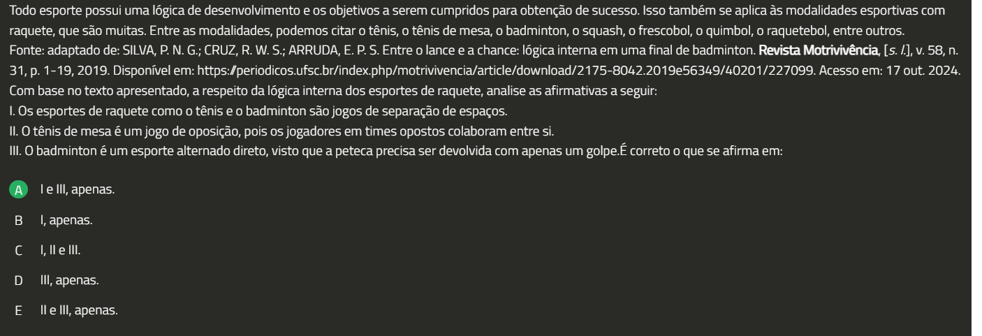 Todo esporte possui uma lógica de desenvolvimento e objetivos a serem cumpridos para obtenção de sucesso. Isso também se aplica às modalidades esportivas com raquete, que são muitas. Entre as modalidades, podemos citar 0 tênis, 0 tênis de mesa, 0 badminton, 0 squash, 0 frescobol, 0 quimbol, 0 raquetebol, entre outros. Fonte: adaptado de: SILVA, P. N. G.; CRUZ, R. W. S.; ARRUDA, E. P.S. Entre 0 lance e a chance: lógica interna em uma final de badminton. Revista Motrivivência, [s. /.], V. 58, n. 31, p. 19, 2019. Disponível em: https:/periodicos.ufsc.br/index.php/motrivivencia/article/download/2175-8042.2019e56349/40201/227099.Acesso em: 17 out. 2024. Com base no texto apresentado, a respeito da lógica interna dos esportes de raquete, analise as afirmativas a seguir: I. Os esportes de raquete como 0 tênis e 0 badminton são jogos de separação de espaços. II. 0 tênis de mesa é um jogo de oposição, pois jogadores em times opostos colaboram entre si. III. 0 badminton é um esporte alternado direto, visto que a peteca precisa ser devolvida com apenas um golpe.É correto 0 que se afirma em: A e III, apenas. I, apenas. I, II e III. D III, apenas. E II e III, apenas.
