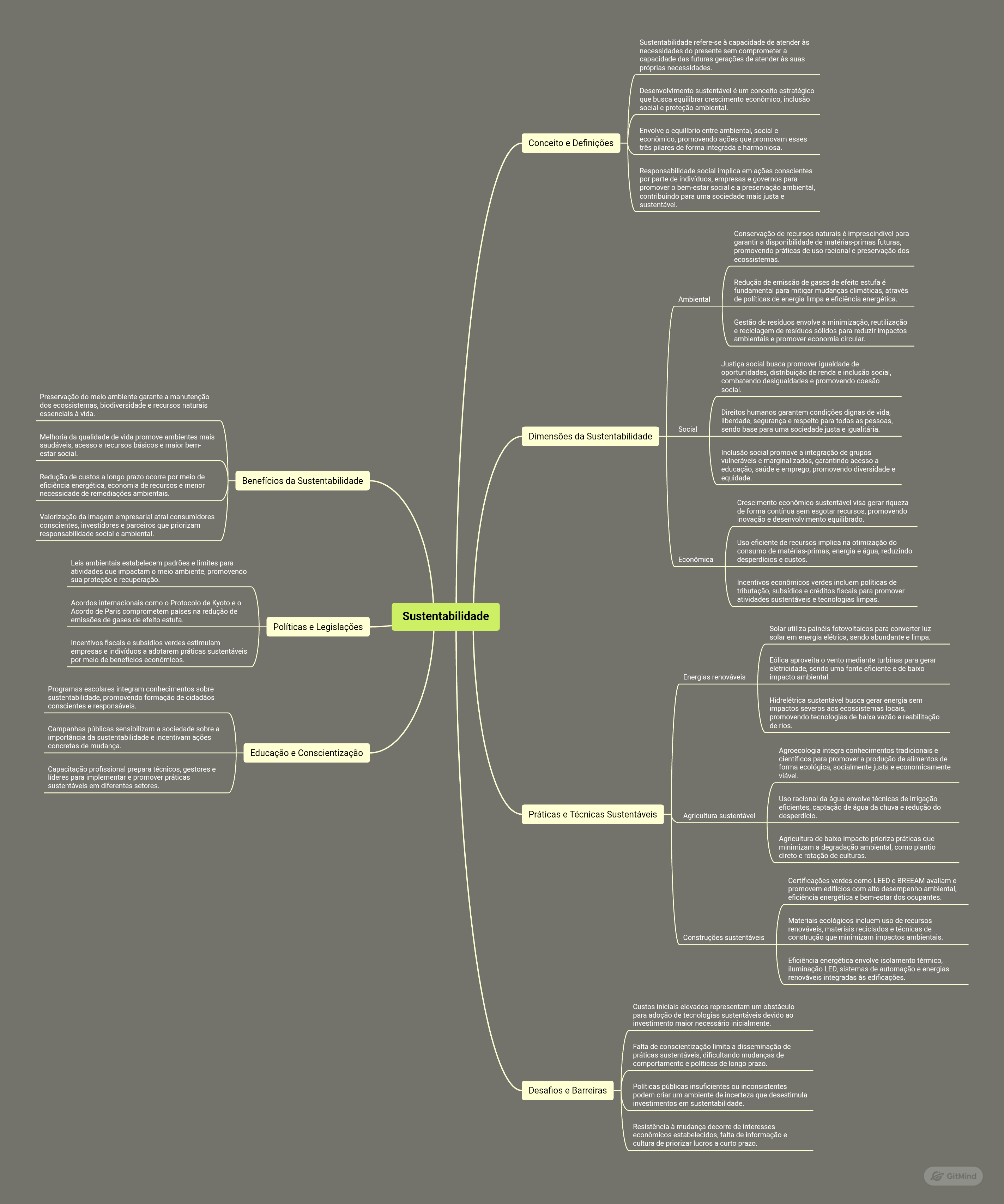Sustentabilidade refere-se à capacidade de atender às necessidades do presente sem comprometer a capacidade das futuras gerações de atender às suas próprias necessidades. Desenvolvimento sustentável é um conceito estratégico que busca equilibrar crescimento econômico, inclusão social e proteção ambiental. Envolve equilíbrio entre ambiental, social e Conceito e Definições econômico, promovendo ações que promovam esses três pilares de forma integrada e harmoniosa. Responsabilidade social implica em ações conscientes por parte de indivíduos, empresas e governos para promover bem-estar social e a preservação ambiental, contribuindo para uma sociedade mais justa e sustentável. Conservação de recursos naturais é imprescindível para garantir a disponibilidade de matérias-primas futuras, promovendo práticas de uso racional e preservação dos ecossistemas. Redução de emissão de gases de efeito estufa é fundamental para mitigar mudanças climáticas, através Ambiental de políticas de energia limpa e eficiência energética. Gestão de resíduos envolve a minimização, reutilização e reciclagem de resíduos sólidos para reduzir impactos ambientais e promover economia circular. Justiça social busca promover igualdade de oportunidades, distribuição de renda e inclusão social, combatendo desigualdades e promovendo coesão social. Preservação do meio ambiente garante a manutenção dos ecossistemas, biodiversidade e recursos naturais essenciais vida. Direitos humanos garantem condições dignas de vida, liberdade, segurança e respeito para todas as pessoas, Social sendo base para uma sociedade justa e igualitária. Melhoria da qualidade de vida promove ambientes mais Dimensões da Sustentabilidade saudáveis, acesso a recursos básicos e maior bem- estar social. Inclusão social promove a integração de grupos vulneráveis e marginalizados, garantindo acesso a educação, saúde e emprego, promovendo diversidade e Redução de custos a longo prazo ocorre por meio de Benefícios da Sustentabilidade equidade. eficiência energética, economia de recursos e menor necessidade de remediações Crescimento econômico sustentável visa gerar riqueza de forma contínua sem esgotar recursos, promovendo Valorização da imagem empresarial atrai consumidores inovação e desenvolvimento equilibrado. conscientes, investidores e parceiros que priorizam responsabilidade social e ambiental. Uso eficiente de recursos implica na otimização do consumo de matérias-primas, energia e água, reduzindo Econômica Leis ambientais estabelecem padrões e limites para desperdícios e custos. atividades que impactam meio ambiente, promovendo sua e recuperação. Incentivos econômicos verdes incluem políticas de tributação, subsídios e créditos fiscais para promover Acordos internacionais como Protocolo de Kyoto atividades sustentáveis e tecnologias limpas. Acordo de Paris comprometem países na redução de emissões de gases de efeito estufa. Sustentabilidade Políticas e Legislações Solar utiliza painéis fotovoltaicos para converter luz solar em energia elétrica, sendo abundante e limpa. Incentivos fiscais e subsídios verdes estimulam empresas e indivíduos a adotarem práticas sustentáveis por meio de benefícios econômicos. Eólica aproveita vento mediante turbinas para gerar eletricidade, sendo uma fonte eficiente e de baixo Energias renováveis impacto ambiental. Programas escolares integram conhecimentos sobre sustentabilidade, promovendo formação de cidadãos Hidrelétrica sustentável busca gerar energia sem conscientes e responsáveis. impactos severos aos ecossistemas locais, promovendo tecnologias de baixa vazão e reabilitação Campanhas públicas sensibilizam a sociedade sobre a de rios. importância da sustentabilidade e incentivam ações concretas de mudança. Educação e Conscientização Agroecologia integra conhecimentos tradicionais e científicos para promover a produção de alimentos de Capacitação profissional prepara técnicos, gestores e forma ecológica, socialmente justa e economicamente líderes para implementar e promover práticas viável. sustentáveis em diferentes setores. Uso racional da água envolve técnicas de irrigação eficientes, captação de água da chuva e redução do Práticas e Técnicas Sustentáveis Agricultura sustentável desperdício. Agricultura de baixo impacto prioriza práticas que minimizam a degradação ambiental, como plantio direto e rotação de culturas. Certificações verdes como LEED e BREEAM avaliam e promovem edifícios com alto desempenho ambiental, eficiência energética e bem-estar dos ocupantes. Materiais ecológicos incluem uso de recursos renováveis, materiais reciclados e técnicas de Construções sustentáveis construção que minimizam impactos ambientais. Eficiência energética envolve isolamento térmico, iluminação LED, sistemas de automação e energias renováveis integradas às edificações. Custos iniciais elevados representam um obstáculo para adoção de tecnologias sustentáveis devido ao investimento maior necessário inicialmente. Falta de conscientização limita a disseminação de práticas sustentáveis, dificultando mudanças de comportamento e políticas de longo prazo. Desafios e Barreiras Políticas públicas insuficientes ou inconsistentes podem criar um ambiente de incerteza que desestimula investimentos em sustentabilidade. Resistência à mudança decorre de interesses econômicos estabelecidos, falta de informação e cultura de priorizar lucros a curto prazo. GitMind