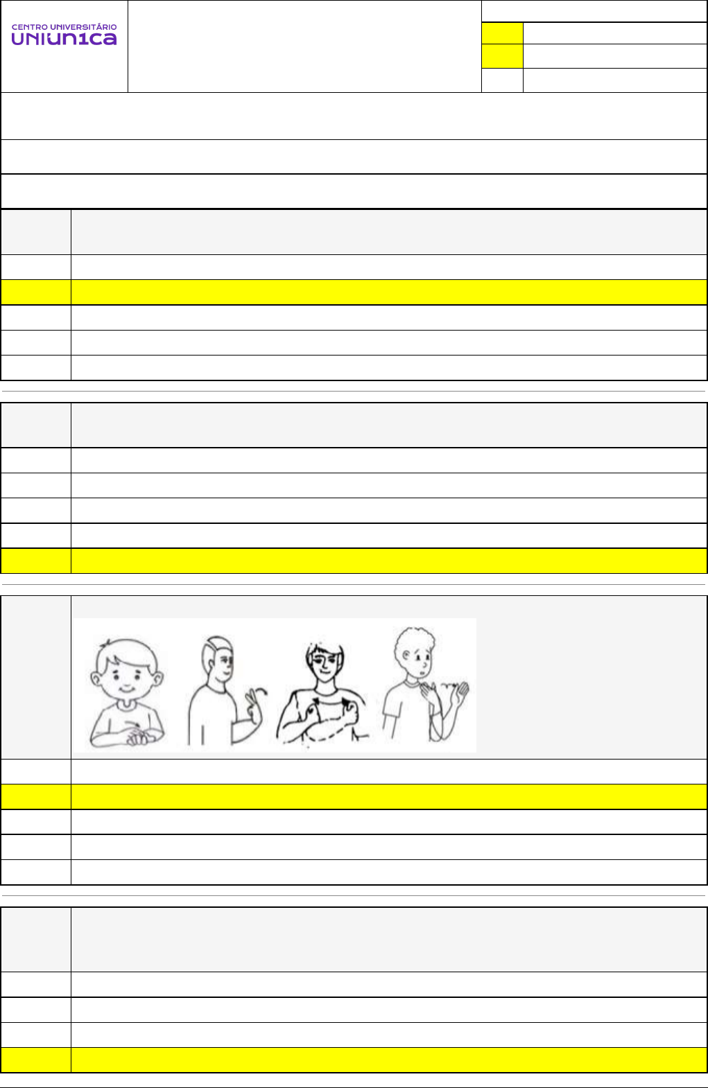Pincel Atômico - 14/07/2025 20:18:59 1/8 ELIZETE BATISTA DA SILVEIRA Avaliação Online - Capitulos/Referencias 1,2,3,4,5,6 (Curso Online - Automático) Atividade finalizada em 13/07/2025 11:13:48 (4094099 / 1) LEGENDA Resposta correta na questão # Resposta correta - Questão Anulada X Resposta selecionada pelo Aluno Disciplina: LIBRAS: ASPECTOS DA ESTRUTURA GRAMATICAL [1695437] - Avaliação com 20 questões, com o peso total de 50,00 pontos [capítulos - 1,2,3,4,5,6] Turma: Segunda Graduação: Licenciatura em Educação Especial para Licenciados - Grupo: MAIO/2025 - SGice0A060525 [172394] Aluno(a): 91610517 - ELIZETE BATISTA DA SILVEIRA - Respondeu 17 questões corretas, obtendo um total de 42,50 pontos como nota [371657_40] Questão 001 A alternativa que traz apenas exemplos de adjetivos icônicos é: fácil – triste – colorido. X calmo – baixo – curto/pequeno. forte – amplo/grande – liso. bonito – limpo – ruim. alto – depressa – igual. [371657_43] Questão 002 De acordo os parâmetros linguísticos da Libras, assinale a alternativa que apresenta sinais com a mesma localização: Rato – Rosa – Girafa. Nenhuma das alternativas. Azul – Mosquito – Macaco. Amarelo – Cachorro – Verde. X Coelho – Cavalo – Vaca. [371657_3] Questão 003 A interrogativa abaixo representada pode ter como resposta a sentença: Duas peças. Número 35. Em dinheiro. Tamanho M. X Tamanho 42. [371657_33] Questão 004 UFU – 2016 adaptada Em qual frase aparece o uso do classificador (CL), para representar a ação do sujeito na Língua de Sinais? Cristian perdeu as chaves. Rita comprou um carro novo. Pedro vende balas de chocolate. X Ana já escovou os dentes. Pincel Atômico - 14/07/2025 20:18:59 2/8 João trabalhou muito. [371657_20] Questão 005 Analise as alternativas abaixo. Qual delas melhor traduziria a sentença: “Isso são horas de chegar?” X Pincel Atômico - 14/07/2025 20:18:59 3/8 [371657_36] Questão 006 AROEIRA – 2021 – adaptada. Leia o texto para responder a questão: LÍNGUA Esta Língua é como um elástico Que espicharam pelo mundo. No início era tensa, de tão clássica. Com o tempo, se foi amaciando, foi-se tornando romântica, incorporando os termos nativos E amolecendo nas folhas de bananeira As expressões mais sisudas. Um elástico que já não se pode Mais trocar, de tão gasto; Nem se arrebenta mais, de tão forte. Um elástico assim como é a vida Que nunca volta ao ponto de partida. (TELES, Gilberto Mendonça. Falavra. Lisboa: Dinalivro, 1989, p. 95-96.) Observe os versos: “No início era tensa, de tão clássica.” / “Com o tempo se foi amaciando,” / “foi-se tornando romântica.” A respeito dos termos sublinhados podemos concluir que: Têm como base o mesmo referente, mas possuem funções gramaticais diferentes no contexto. São locuções adjetivas que caracterizam substantivo e verbo. Têm como base referentes distintos, no entanto, exercem a mesma função gramatical no contexto. X Exercem a função de adjetivo e têm como base o mesmo referencial “língua”. Estão fazendo referência a “língua”, “elástico” e “mundo”. [371657_57] Questão 007 FGV- 2021. Os gênios são aqueles que dizem muito antes o que se dirá muito depois. Ramón Gómez De La Serna, escritor espanhol. Nesse pensamento, a palavra muito é empregada duas vezes, com o mesmo valor que apresenta na seguinte frase: “Muitas vezes a inteligência traz muito incômodo como uma lamparina no quarto.” X “Que sorte possuir muito discernimento: nunca te faltam bobagens para dizer.” “A sutileza ainda não é inteligência. Às vezes os tolos e os loucos também são muito sutis.” “Os deuses deram ao homem muito intelecto, que é a maior de todas as riquezas.” “Há muito espaço de onde emana a inteligência.” [371657_28] Questão 008 CPCON- 2020- Na Libras, os verbos ANDAR e CAIR, são categorizados como: direcional e classificador. de negação. X classificadores. simples direcionais. Pincel Atômico - 14/07/2025 20:18:59 4/8 [371657_50] Questão 009 COVEST- COPSET – 2019 - adaptada Dos processos de composição morfológica, indique os sinais da Libras assim produzidos: zebra, cor, verde. azul, laranja e safári. tartaruga, macaco e gato. X tigre, insetos e onça. cavalo, ovelha e amarelo. [371657_56] Questão 010 UFU-MG – adaptada Nas frases: “Colocar um livro na estante”; “Colocar as cartas sobre a mesa”; “Colocar os copos na lavadora”, é correto afirmar que, em língua de sinais, o verbo COLOCAR, tal como usado nas frases, pertence ao verbo espacial (+ locativo). verbo com concordância. X verbo classificador. verbo simples. verbo de negação. [371658_6] Questão 011 FGV- 2021 “O valor de todo conhecimento está no seu vínculo com as nossas necessidades, as nossas aspirações e ações; de modo diferente, o conhecimento torna-se um simples lastro de memória”. Nesse pensamento foi utilizada corretamente o indefinido todo, sem artigo após ele; assinale a opção em que o emprego desse indefinido também está correto. X “Esta fórmula era melhor, e tinha a vantagem de me fortalecer o coração contra a investidura eclesiástica. Juramos pela segunda fórmula, e ficamos tão felizes que todo receio de perigo desapareceu.” “Outrossim, ria largo, se era preciso, de um grande riso sem vontade, mas comunicativo, a tal ponto as bochechas, os dentes, os olhos, toda a cara, toda a pessoa, todo mundo pareciam rir nele.” “Não, senhor meu amigo; algum dia, sim, é possível que componha um abreviado do que ali vi e vivi, das pessoas que tratei, dos costumes, de todo resto.” “Assim devia ser, mas um fluido particular que me correu todo corpo desviou de mim a conclusão que deixo escrita.” “Novamente me recomendou que não me desse por achado, e recapitulou todo mal que pensava de José Dias, e não era pouco, um intrigante, um bajulador, um especulador, e, apesar da casca de polidez, um grosseir