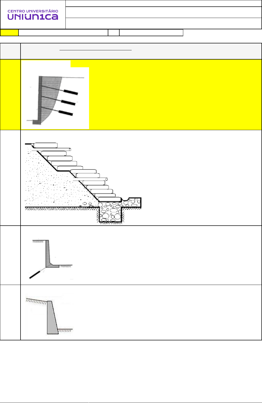 14/05/2025 11:46:10 1/4 REVISÃO DE SIMULADO Nome: FAGNO SOUSA SILVA RAMALHO Disciplina: Fundações e Estruturas de Contenção Respostas corretas são marcadas em amarelo X Respostas marcardas por você. Questão 001 (TRANSPETRO - Engenheiro Júnior - 2018 - Adaptada). Assinale a alternativa que identifica corretamente a estrutura de contenção apresentada. A) Cortina atirantada X B) Estacas prancha. C) Gabião D) Terra armada https://questoes.grancursosonline.com.br/prova/politec-mt-mt-2022-ufmt-perito-criminal-area-engenharia-civil 14/05/2025 11:46:10 2/4 E) Muro de sacos de cimento Questão 002 (VUNESP – SEE SP – Analista de Tecnologia – Área Obras – 2014 - Adaptado) Em um muro de arrimo, o sistema de drenagem se destina a evitar: A) que o volume de líquido que flui pelos drenos, afete no seu descarte a estrutura do muro. B) que as águas saiam de dentro do maciço. C) o descarte das águas oriundas das chuvas. D) a captação dos fluxos que correm no interior dos maciços. X E) que a água penetre no corpo do maciço. Questão 003 (ENADE – 2017 - Adaptado) Anualmente, são registrados acidentes associados à ruptura das estruturas de contenção em obras rodoviárias e em áreas urbanas (subsolos e escavações) e, em geral, a causa desses acidentes está associada à deficiência da caracterização geológico-geotécnica e/ou a falhas de projeto e de execução da obra. A escolha inadequada de uma técnica pode acarretar acidentes fatais e elevar os custos financeiros da obra. Existem várias técnicas que podem ser empregadas para a contenção de maciços de solo, sendo classificadas de acordo com seu processo executivo e o material empregado. Em relação à contenção de maciços, consideram-se técnicas de contenção de gravidade: A) muro de sacos de cimento, muro de flexão e cortina atirantada. B) muro de sacos de cimento, muro de flexão e parede diafragma. X C) muro de concreto ciclópico, muro de pneus e muro de sacos de cimento. D) muro de concreto ciclópico, muro de gabião e parede diafragma. E) muro de gabião, muro de sacos de cimento e muro de flexão. 14/05/2025 11:46:10 3/4 Questão 004 A figura abaixo apresenta um muro de arrimo em concreto ciclópico. Avalie as afirmativas a seguir considerando um pré-dimensionamento mínimo. I. A dimensão B deve ser igual a 2,80 metros. II A dimensão C deve ser igual a 0,35 metros. III A dimensão D deve ser igual a 0,60 metros. IV. Caso o valor de B fosse igual a 2,5 metros a altura seria de 3,75 metros. É possível afirmar que está correto o que consta em: X A) II, III e IV apenas. B) I, II e IV apenas. C) III e IV apenas. D) II e IV apenas. E) I e III apenas. Questão 005 (UFF – Engenheiro civil – 2009) Os muros de arrimo são obras comuns na engenharia. Os muros de sustentação podem ser de gravidade, flexão e muro de fogueira. Na construção de um muro, a fim de evitar o acúmulo das águas pluviais infiltradas no lado da terra, é de boa técnica prever sistemas de drenagem dessas águas, e normalmente utilizam-se drenagem por: A) sucção residual B) espinha de peixe X C) barbacãs D) drenos superficiais. E) retirada de excesso Questão 006 Sobre os muros de arrimo, considere as afirmativas: I. A cortina atirantada pode alcançar alturas bem superiores aos alcançados pelos muros de peso, e atingem alturas semelhantes às alcançadas pelos muros de flexão. Sua vantagem em relação aos muros de flexão é que, não interferem nas edificações vizinhas por não produzirem vibrações. II. As estacas prancha são contenções que formam uma parede estanque, além de serem baratas e em alguns casos poderem ser reaproveitadas. Uma de suas desvantagens é a restrição de sua utilização em terrenos rochosos. III. São estruturas de contenção constituídas de parede vertical ou quase vertical apoiada sobre fundação rasa ou profunda. IV. Nos muros de pneus, o empuxo horizontal é combatido pelo peso próprio da estrutura. V. Muros de gravidade são estruturas esbeltas, que resistem aos empuxos por flexão, utilizando parte do peso próprio do maciço arrimado para manter-se em equilíbrio. É possível afirmar que está correto o que consta em: A) III, IV e V apenas. X B) I, II e III apenas. 14/05/2025 11:46:10 4/4 C) II, IV e V apenas. D) I, III e V apenas. E) II, III e IV apenas. Questão 007 (COSEAC – Engenheiro civil – 2023. Adaptada) A figura a seguir ilustra um muro de altura h, construído para conter um solo de peso específico γ e coeficiente de empuxo K, cujos valores são mostrados na figura. O valor do empuxo de terra E nessa estrutura, por metro linear de extensão do muro, vale: X A) 9,0 t/m. B) 18,0 kN/m. C) 36 kN/m. D) 1,8 t/m. E) 13,5 kN/m. Questão 008 ( IBFC - EBSERH - Engenheiro Civil - 2022 - Adaptada). São estruturas de contenção flexíveis, do tipo gravidade, que associam aterro selecionado e compactado a elementos lineares de reforço que serão submetidos à tração e a elementos modulares pré-fabricados de revestimento. São normalmente usados em obras rodoviárias, ferroviárias, industriais e em outras aplicações de engenharia civil. Esse método consiste em aumentar a capacidade do solo para resistir à tração interna, através da colocação de elementos de amarração que fazem a distribuição destes esforços, através do atrito da área maior do solo fazendo que o conjunto haja como corpo sólido. Também resistem a esforços de cargas excepcionais. De qual destas estruturas este texto se refere. A) Muro de arrimo. B) Gabião. C) Muro em fogueira (crib wall). X D) Terra armada. E) Muros de sacos de solo cimento. https://questoes.grancursosonline.com.br/prova/ebserh-2022-ibfc-engenheiro-civil-3