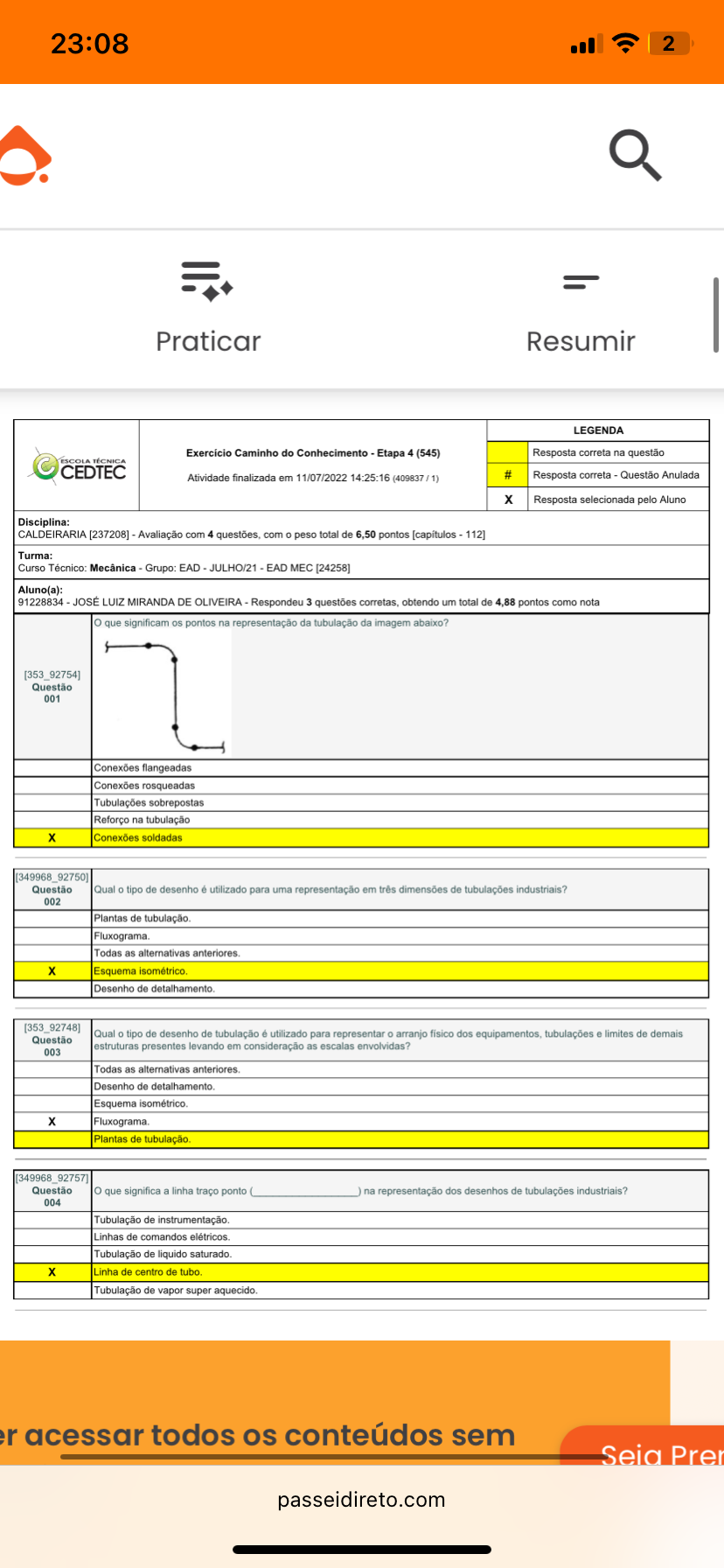 23:08 2 Praticar Resumir LEGENDA Exercicio Caminho do Conhecimento Etapa 4 (545) Resposta correta na questão ESCOLA CEDTEC Atividade finalizada em 11/07/2022 14:25:16 (409837 1) # Resposta correta Questão Anulada X Resposta selecionada pelo Aluno Disciplina: CALDEIRARIA [237208] Avaliação com 4 questões, com 0 peso total de 6,50 pontos 112] Turma: Curso Técnico: Mecânica Grupo: EAD JULHO/21 EAD MEC [24258] Aluno(a): 91228834 JOSÉ LUIZ MIRANDA DE OLIVEIRA Respondeu 3 questões corretas, obtendo um total de 4,88 pontos como nota que significam pontos na representação da tubulação da imagem abaixo? [353_92754] Questão 001 Conexões flangeadas Conexões rosqueadas Tubulações sobrepostas Reforço na tubulação Conexões soldadas [349968_92750] Questão Qual tipo de desenho é utilizado para uma representação em dimensões de tubulações industriais? 002 Plantas de tubulação. Fluxograma. Todas as alternativas Esquema isométrico Desenho de [353_92748] Qual tipo de desenho de tubulação é utilizado para representar arranjo dos equipamentos, tubulações e limites de demais Questão estruturas presentes levando em consideração as escalas envolvidas? 003 Todas as alternativas Desenho de Esquema Fluxograma. Plantas de [349968_92757] Questão O que significa a linha traço ponto na representação dos desenhos de tubulações industriais? 004 Tubulação de instrumentação. Linhas de comandos Tubulação de liquido Linha de centro de tubo Tubulação de vapor super aquecido. acessar todos conteúdos sem Seia passeidireto.com