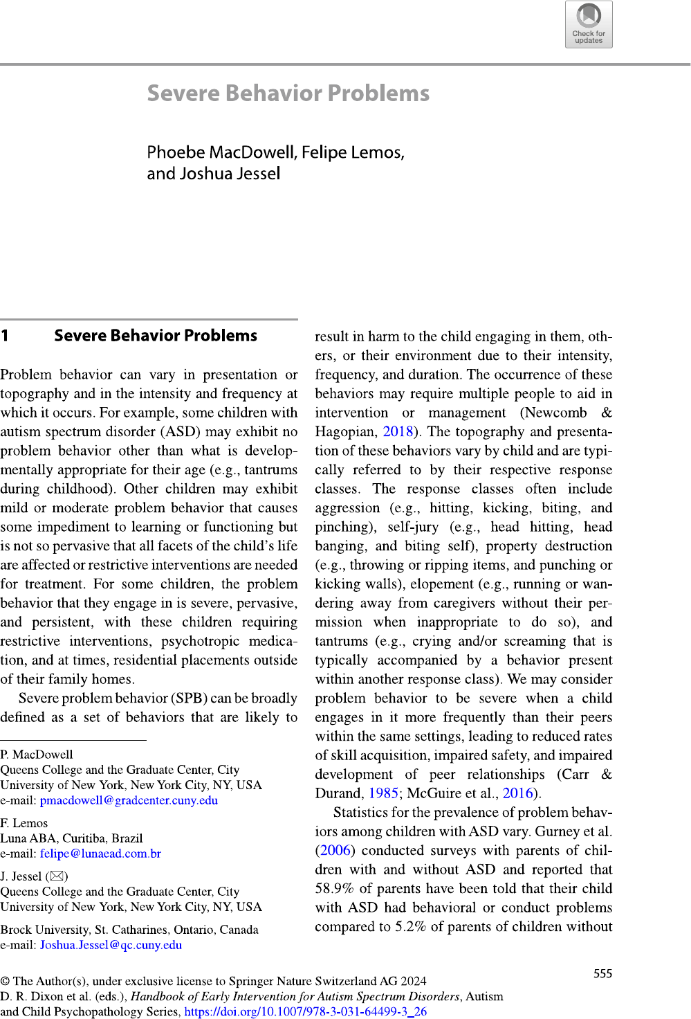 Check for updates Severe Behavior Problems Phoebe MacDowell, Felipe Lemos, and Joshua Jessel 1 Severe Behavior Problems result in harm to the child engaging in them, oth- ers, or their environment due to their intensity, Problem behavior can vary in presentation or frequency, and duration. The occurrence of these topography and in the intensity and frequency at behaviors may require multiple people to aid in which it occurs. For example, some children with intervention or management (Newcomb & autism spectrum disorder (ASD) may exhibit no Hagopian, 2018). The topography and presenta- problem behavior other than what is develop- tion of these behaviors vary by child and are typi- mentally appropriate for their age (e.g., tantrums cally referred to by their respective response during childhood). Other children may exhibit classes. The response classes often include mild or moderate problem behavior that causes aggression (e.g., hitting, kicking, biting, and some impediment to learning or functioning but pinching), self-jury (e.g., head hitting, head is not so pervasive that all facets of the child's life banging, and biting self), property destruction are affected or restrictive interventions are needed (e.g., throwing or ripping items, and punching or for treatment. For some children, the problem kicking walls), elopement (e.g., running or wan- behavior that they engage in is severe, pervasive, dering away from caregivers without their per- and persistent, with these children requiring mission when inappropriate to do so), and restrictive interventions, psychotropic medica- tantrums (e.g., crying and/or screaming that is tion, and at times, residential placements outside typically accompanied by a behavior present of their family homes. within another response class). We may consider Severe problem behavior (SPB) can be broadly problem behavior to be severe when a child defined as a set of behaviors that are likely to engages in it more frequently than their peers within the same settings, leading to reduced rates P. MacDowell of skill acquisition, impaired safety, and impaired Queens College and the Graduate Center, City development of peer relationships (Carr & University of New York, New York City, NY, USA e-mail: pmacdowell@gradcenter.cuny.edu Durand, 1985; McGuire et al., 2016). Statistics for the prevalence of problem behav- F. Lemos Luna ABA, Curitiba, Brazil iors among children with ASD vary. Gurney et al. e-mail: felipe@lunaead.com.br (2006) conducted surveys with parents of chil- J. Jessel (X) dren with and without ASD and reported that Queens College and the Graduate Center, City 58.9% of parents have been told that their child University of New York, New York City, NY, USA with ASD had behavioral or conduct problems Brock University, St. Catharines, Ontario, Canada compared to 5.2% of parents of children without e-mail: Joshua.Jessel@qc.cuny.edu 555 �� The Author(s), under exclusive license to Springer Nature Switzerland AG 2024 D. R. Dixon et al. (eds.), Handbook of Early Intervention for Autism Spectrum Disorders, Autism and Child Psychopathology Series,556 P. MacDowell et al. ASD. Self-injury (in its various topographies) persistent throughout treatment (Lentz & Cohen, has been identified to occur within an estimate of 1980; Podlesnik & Kelley, 2015). When children at least 28% of children with ASD (Soke et al., engage in more dangerous forms of problem 2016). In another study, Kanne and Mazurek behaviors, they are more likely to be subject to (2011) reported that 68% of children with ASD restrictive procedures and restrictive educational have engaged in aggression toward their caregiv- or residential placements. In fact, children who ers. Pereira-Smith et al. (2019) found that 68% of engage in SPB are more at risk for residential caregivers within their study reported that their placements in group homes (Newcomb & child engaged in elopement at some point in their Hagopian, 2018). In the most extreme cases, life, with children who exhibit limited communi- some children with ASD may become patients in cation skills being noted as more likely to elope general in-patient psychiatric units due to a lack than others. of specialized psychiatric units for children with Although these figures do provide helpful ASD (McGuire et al., 2015). information regarding the distribution of SPB Young children with ASD may also experi- among children with ASD, there is little known ence high rates of psychotropic medication. For regarding how SPB develops in the first place. example, Madden et al. (2017), found that nearly For example, Kennedy (2002) suggested that half of the children within their sample were on self-injury could potentially evolve from more some form of psychotropic medication, despite a benign patterns of behavior characteristic of ASD lack of evidence of their effectiveness in treating such as stereotypy. Others have suggested that core domain features of ASD and problem behav- there are common conditions that many children ior. The study also noted 20% of medicated chil- are likely to experience naturally in their child- dren with ASD were taking an antipsychotic, hood, which have the potential to motivate and with risperidone and aripiprazole being the most shape up SPB (e.g., Ala'i-Rosales et al., 2019; common within the sample. In comparison, only Carr, 1977). Ala'i-Rosales et al. refer to these as 7.7% of children without ASD were found to be the "Big Four" conditions and include situations on psychotropic medication. The use of such in which (a) wants and needs are not being met, medications comes with numerous side effects, (b) attention and affection may be withheld, (c) all of which can have some impact on quality of there are skill deficits in interactive and indepen- life. It is well documented that long-term use of dent play, and (d) adversity is introduced that antipsychotics is likely to result in tardive dyski- requires tolerance and coping mechanisms. 