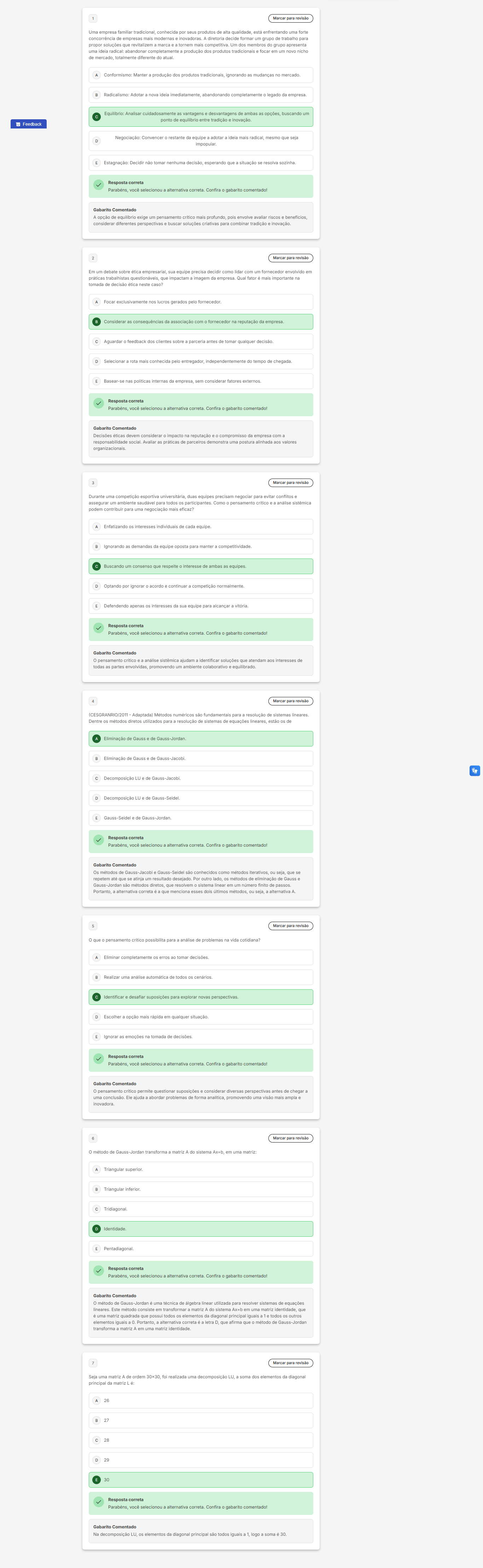 1 Uma empresa familiar tradicional conhecida por seus produtos de alta est�� enfrentando uma forte de impresas mais modernas inovadoras firetoria decide rupo para propor solu����es tornem mais competitiva Um dos rupo apresenta uma radical abandonar completa produ����o dos produtos em um novo nicho de total nente atual A Confo nismo Manter produ����o dos produtos ign nudan��as mercado Radicalismo abandonando completament legado da emp resa Equilibrio Analisar vantagen desvantager de buscando um equilibrio entre tradi����o inova����o restante equipe adotar mais radical, mesmo que seja E n��o tomar nenhuma decis��o, esperando que situa����o resolva Resposta correta voc�� selecionou alternativa Confira gabarito comen Gabarito Comentado um pensamento critico mais profundo, pois envolve avaliar riscos considerar diferentes buscar solu����es criativas para mbinar tradi����o 2 Marcar revis��o um debate emp sua equipe precisa como idar com um envolvido em pr��ticas rabalhista que impactam imagem da empresa Qual fato mais importante na tomada ��tica neste caso? A Focar nos lucros gerados pelo fornecedor Considerar as consequ��ncias da associa����o com fornecedo na reputa����o juardar feedback dos clientes sobre parceria antes tomar qualquer dec s��o. D Selecionar rota mais pelo intregador, independent de chegada Basear politicas internas da empresa, sem considerar fatores externos Resposta correta voc�� selecionou alternativa Confira gabarito comen Gabarito Comentado Decis��es ��ticas devem impacto na reputa����o compromisso da emp resa respon abilidade social Avalia pr��ticas parceiros demonstra uma ada aos valores 3 Marcar revis��o Durante uma competi����o esportiva duas equipes negociar para evitar ambiente saud d��vel para todos Como samento podem para uma negocia����o mais eficaz? A Enfatizando interesses individuais de cada equipe B demandas da equipe para manter Buscando um consenso que respeite interesse de ambas D Optando por ignorar acordo continuar competi����o Defendendo apenas os interesses da sua equipe para alcan��ar Resposta correta voc�� selecionou alternativa Confira gabarito comen Gabarito Comentado pensame critico sist��mica ajudam identificar solu����es que ater aos interesses de todas par promovendo um ambiente colaborativo ilibrado 4 Marcar revis��o 2011 Adaptada) M��todos num��ricos s��o fundamentais para resol de sistemas lineares Dentre os m��todos diretos utilizados para resolu����o de sistemas de equa����es est��o de Elimina����o Gauss Gauss Jordan Elimina����o Gauss de Jacobi Decom posi����o LU D Decom posi����o LU Gauss Seidel Gauss Seidel Jordan Resposta correta selecionou alternativa Confira gabarito comen Comentado Os m��todos de s��o conhecidos como m��todos terativos, ou seja, que se que resultado Por outro m��todos ina����o Gauss Jordar m��todos que resolvem sistema linear finito passos Portanto mativa correta que menciona esses dois m��todos, ou seja, 5 Marcar revis��o pensame critico possibilita para de problemas na vida cotidiana? A Elimina completamente erros tomar Realizar uma autom��tica todos tificar desafiar uposi����es para explorar novas Escolher op����o mais r��pida em qualquer E emo����es tomada decis��es Resposta correta selec onou alternativa correta Confira gabarito comen tado! Gabarito Comentado 0 diversas per pectivas antes chegar uma clus��o Ele ajuda abordar problemas de analitica, ndo uma vis��o mais 6 Marcar para n��todo de Gauss transforma matriz do sistema em uma matriz: A Triangular superior. B inferior. E Resposta voc�� selecionou alternativa Confira gabarito comentado! Gabarito Comentado o m��todo Jordan uma t��cnica de algebra linear utilizada para resolver sistemas de ����es lineares Este m��todo consiste em transformar matriz do sistema matriz identidade que possu todos principal guais elementos igual Portanto, alternativa correta letra D que afirma que n��todo de Gauss-Jordan transforma matriz matriz identidade 7 revis��o Seja uma matriz de ordem foi realizada decomposi����o LU, soma elementos diagonal principal matriz A 26 B 27 28 D 29 30 Resposta correta voc�� selecionou alternativa correta Confira gabarito coment Gabarito Comentado Na decom nposi����o LU, elementos da diagonal principal s��o todos iguais logo soma