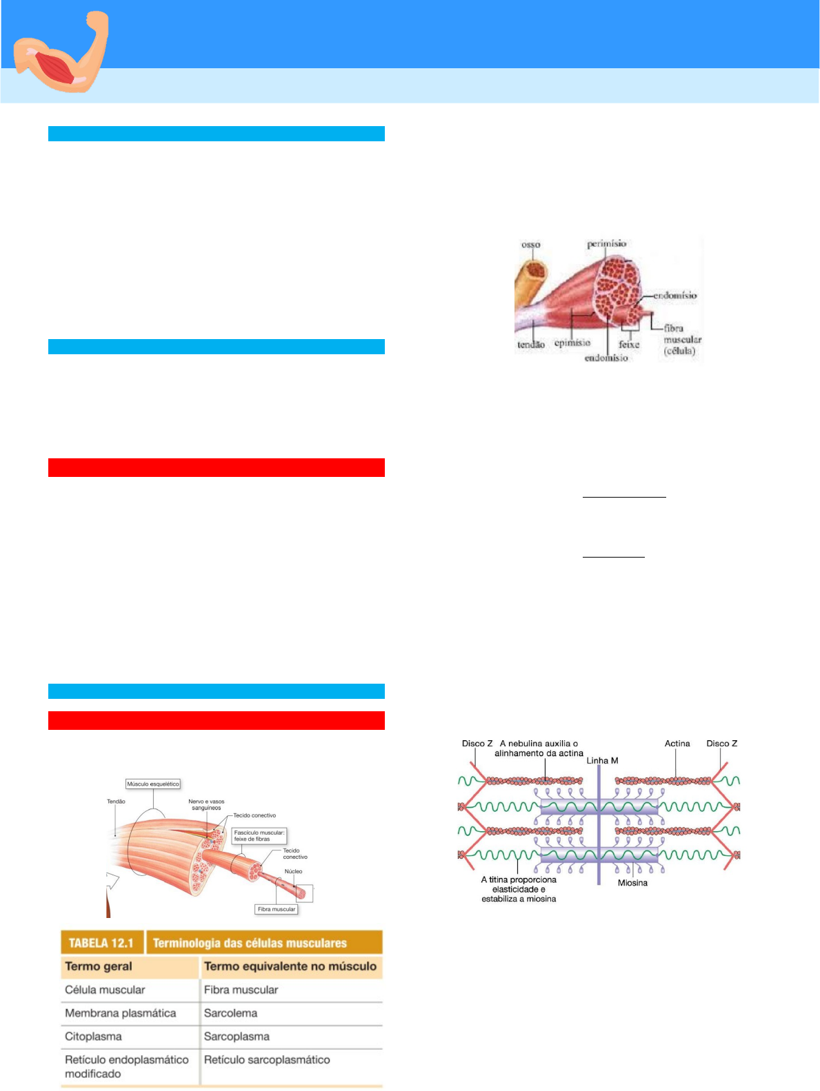- SISTEMA MUSUCLAR ESQUELÉTICO – [Fisiologia muscular] INTRODUÇÃO Músculo: conjunto de células musculares (Fibras m. ou miócitos) unidas por tecido conjuntivo TIPOS DE MÚSCULOS: · Esquelético → Estriado e voluntário · Cardíaco → Estriado e involuntário · Liso ou Visceral → Liso e involuntário MÚSCULO ESQUELÉTICO · Fibras musculares grandes, cilíndricas, multinucleadas e com estriações transversais. · Importância/Função Homeostática: Produzir movimento e gerar força CARACTERÍSTICAS · 40% do corpo é const. por m. esqueléticos · Máquinas que transformam energia química (ATP) em energia mecânica (contração) · Encontram-se em sua maioria unidos aos ossos movimento · Outras atividades controle da liberação de urina e fezes · Encontram-se sob controle do sistema nervoso somático ESTRUTURA DO MÚSCULO ESQUELÉTICO ORGANIZAÇÃO GERAL · Músculo > Fascículo > Fibras Musculares Envoltórios: 1. Epimísio: Envolve o Músculo inteiro 2. Perimísio: Envolve cada feixe de fibra m. 3. Endomísio: Envolve cada fibra muscular · Fibra Muscular → Possui núcleo, organelas e miofibrilas contráteis · Miofibrila: Filamentos proteicos contráteis dispostos em feixes interconectados. · Actina → Filamentos Finos · Tropomiosina: proteína enrolada ao redor do filamento de actina no M. · Troponina: Regula a interação entre actina e miosina · Miosina → Filamentos Grossos · 2 cadeias pesadas (cauda e cabeças da miosina) · 4 cadeias leves (nas cabeças da miosina) · Sarcômero: Unidade contrátil básica e funcional das miofibrilas · Contração = Encurtamento do sarcômero = Deslizamento das cadeias proteicas · Sistema T (túbulos Transversos): invaginações do sarcolema no interior da fibra associadas as terminações do R.S · Conduzem o P.A p/ interior da cel. · Retículo Sarcoplasmático: reservatório de Cálcio (fundamental p/ contração CINTRAÇÃO MUSCULAR ESQUELÉTICA · Unid. Motora = Fibra Nervosa · Uma fibra nervosa pode inervar: · Poucas fibras musculares – Mov. Rápidos e precisos · Muitas fibras musculares – Mov. lentos e grosseiros JUNÇÃO NEUROMUSCULAR Placa motora: Potencial de ação Neural: 1. Sinapse 2. Liberação do neurotransmissor Acetilcolina 3. Receptor Nicotínico (Nm) = 1ª Entrada de Na+ 4. Abertura do VOCs de sódio = Despolarização a. Entrada de Sódio na fibra muscular 5. Propagação do P.A no Músculo a. Se propaga ao longo da membrana muscular e entra nos túbulos T b. Túbulos T liberam o Ca+ que estava no R. Sarcoplasmático INTERAÇÃO DAS MIOFIBRILAS – FORMAÇÃO DAS PONTES CRUZADAS – 1. O Ca+ liberado no R.S. se liga à troponina C 2. Deslocamento da tropomiosina a. A ligação do cálcio à troponina C causa uma mudança conformacional na troponina. b. Essa mudança conformacional faz com que a tropomiosina se desloque dos sítios ativos da actina, onde as cabeças de miosina podem se ligar durante a contração muscular. 3. Exposição dos Sítios Ativos da Actina 4. Formação das Pontes Cruzadas a. As cabeças da miosina, que estão cruzadas, podem agora se ligar aos sítios ativos expostos na actina, formando as pontes cruzadas e iniciando o processo de contração muscular. 5. Contração Muscular MECANISMOS DE CONTRAÇÃO MUSCULAR Deslizamento dos Filamentos - Teoria da Catraca · Com as pontes cruzadas formadas, a energia liberada pela hidrólise de ATP (na cabeça da miosina) é utilizada para mover as cabeças, deslizando os filamentos de actina em direção ao centro dos sarcômeros. TÉRMINO DA CONTRAÇÃO (RELAXAMENTO): Fim do estímulo nervoso. · Retirada do Cálcio do Citosol pelas SERCAs = Bombas de cálcio-ATPase no RS Recaptação do cálcio para o RS [Ca 2+] · TETANIZAÇÃO = Contrações musculares esqueléticas sustentadas e uniformes, em resposta a múltiplos estímulos neurais consecutivos. · Acúmulo de Ca+ mantém os sítios ativos da actina expostos e permitindo a formação contínua de pontes cruzadas · Como resultado desse processo, as contrações musculares individuais se fundem em uma contração muscular sustentada e uniforme. · FADIGA MUSCULAR = incapacidade dos processos contráteis e metabólicos da fibra muscular · Falta de ATP · Falta de O2 · Interrupção de fluxo sanguíneo ou cadeia respiratória não funcional TIPOS DE CONTRAÇÃO · Isotônicas mesma tensão com de tamanho da fibra muscular · Isométricas mesmo tamanho da fibra muscular com de tensão CONDIÇÕES MUSCULARES · EUTROFIA = mesmo sem uso intenso há impulsos neurais tônicos que mantêm o músculo vivo e hígido · HIPERTROFIA = utilização do músculo tamanho do músculo e da força de contração aumenta do numero de miofibrilas e outros elementos (≠ HIPERPLASIA) · ATROFIA = falta de inervação degeneração das fibras musculares/ substituição por tecido fibroso image3.png image4.png image5.png image6.png image7.png image8.png image9.png image10.png image11.png image12.png image1.png image2.png