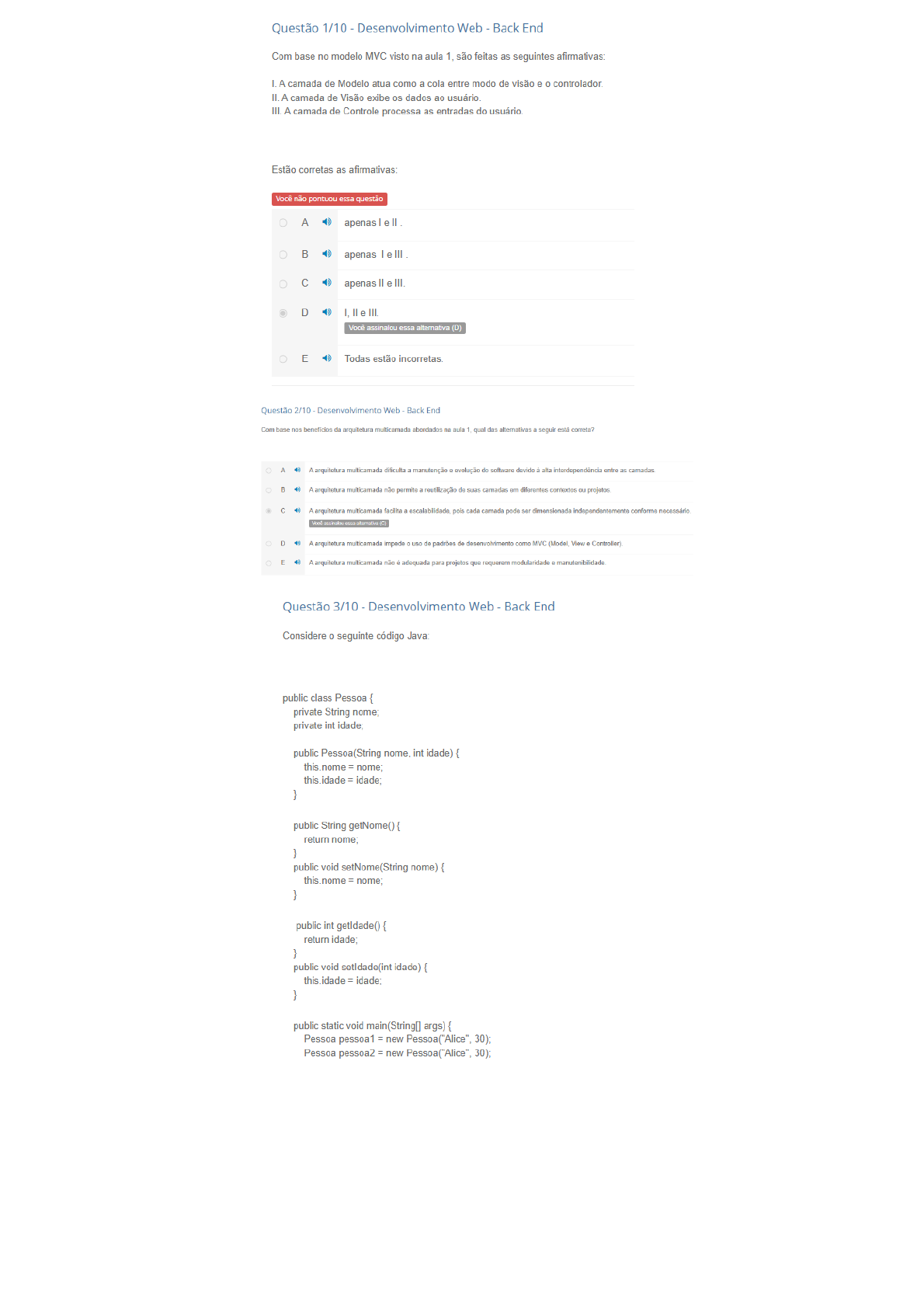 Questão 1/10 Desenvolvimento Web Back End Com base no modelo MVC visto na aula 1, são feitas as seguintes afirmativas: I.A camada de Modelo atua como a cola entre modo de visão e 0 controlador. II. A camada de Visão exibe dados ao usuário. III. A camada de Controle processa as entradas do usuário. Estão corretas as afirmativas: Você não pontuou essa questão A apenas e apenas III apenas e III. D I, III. Você assinalou essa alternativa (D) E Todas estão incorretas. Questão 2/10 Desenvolvimento Web Back End Com base nos benefícios da arquitetura multicamada abordados na aula qual das alternativas a seguir está correta? A A arquitetura multicamada dificulta a manutenção evolução do software devido à alta interdependência entre as A arquitetura multicamada não permite a reutilização de suas camadas em diferentes contextos ou projetos. C A arquitetura multicamada facilita a escalabilidade, pois cada camada pode ser dimensionada independentemente conforme assinalou essa D A arquitetura multicamada impede uso de padrões de desenvolvimento como MVC (Model, View e E A arquitetura multicamada não é adequada para projetos que requerem modularidade e manutenibilidade Questão 3/10 Desenvolvimento Web Back End Considere 0 seguinte código Java: public class Pessoa { private String nome; private int idade; public Pessoa(String nome, int idade) { this.nome nome; this idade idade; } public String getNome() { return nome; } public void setNome(String nome) { this.nome = nome; } public int getldade() { return idade; } public void setldade(int idade) this idade = idade; } public static void main(String[] args) { Pessoa pessoa1 = new Pessoa("Alice", 30); Pessoa pessoa2 = new Pessoa("Alice", 30);System out equals(pessoa2) pessoa1 System out equals(pessoa3) pessoa1 Com base no código acima levando em consideração que método equals() não foi implementado para comparar se duas instâncias de Pessoa são iguais com base no nome idade, analise as implementação do método equals() não sendo desnecessária já que toda classe herda esse método da classe Object Ao comparar pessoa1 com pessoa2 utilizando método resultado será true pessoa1 equals(pessoa3) resultará em true A Apenas afirmativa está correta B Apenas afirmativa está correta C Apenas afirmativa III está correta essa D Apenas as afirmativas estão corretas E Apenas as afirmativas III estão corretas Questão 4/10 Desenvolvimento Web Back End Qual das seguintes afirmações descreve corretamente papel do Dispatcher Servlet em um aplicativo Spring MVC? A Dispatcher Servlet é responsável por armazenar e gerenciar sessões de usuários em um aplicativo web. Dispatcher Servlet é um componente que manipula todas as requisições HTTP que entram no aplicativo Spring MVC. Você essa alternativa C Dispatcher Servlet é usado para realizar consultas em um banco de dados relacional a partir de um aplicativo Spring D Dispatcher Servlet é responsável por autenticar usuários em um aplicativo Spring MVC E Dispatcher Servlet é utilizado para criar e manipular objetos de modelo em um aplicativo Spring Questão 5/10 - Desenvolvimento Web Back End Com base na aula 3 sobre camada de visão, são feitas as seguintes afirmativas: I A camada de visão no Spring MVC pode utilizar JSP e Thymeleaf como tecnologias de template II. ViewResolver no Spring MVC é responsável por manipular exceções durante a renderização da A interface View no Spring MVC prepara os dados antes de passá-los para uma tecnologia de visualização específica. escolha a alternativa correta: A Apenas as afirmativas e são corretas. Apenas as afirmativas e III são Apenas as afirmativas e III são Você assinalou essa alternativa (C) D Apenas a afirmativa é correta. E Apenas a afirmativa III é Questão 6/10 Desenvolvimento Web Back End Ler em alta Com base no que foi visto na aula 3. qual das seguintes afirmações CORRETAMENTE compara conceito de Controller Front Controller no Spring MVC? A Controller responsável por processar todas as requisições HTTP em uma aplicação Spring MVC, enquanto Front Controller responsável por configurar inicializar ambiente de execução do Spring Controller responsável por receber processar requisições enquanto Front Controller responsável por centralizar controle de todas as requisições, roteando as para os controllers apropriados 40 Controller Front Controller são termos intercambiáveis no contexto do Spring ambos se referindo mesma classe responsável pelo processamento das requisições HTTP Controller responsável por lidar com lógica de negócios da aplicação, enquanto Front Controller responsável por lidar com comunicação entre cliente servidor E Controller uma classe específica do Spring enquanto Front Controller uma interface que define contrato para todas as classes de controle na Questão 7/10 Desenvolvimento Web Back End em alta "A plataforma Java usa um modelo de aplicativo distribuído de várias camadas para aplicativos corporativos. A lógica do aplicativo dividida em componentes de acordo com função, componentes do aplicativo que compõem um aplicativo Java são instalados em várias máquinas, dependendo da camada do ambiente Java multicamadas ao qual componente do aplicativo pertence. plataforma Java multicamadas está dividida nas camada camada da camada de negócios camada camada de sistema de informações empresariais (EIS). Java Enterprise Edition (Java The Java EE Tutorial (Adaptado) Disponível em: https: //javaee github html#BNAAY ### Com base na arquitetura Java EE e nas camadas citadas no texto, levando ainda em consideração conteúdo visto em analise as afirmativas I camada Cliente responsável pela lógica de negócios da separando-a da camada de apresentação camada Web lida com apresentação interação do usuário através de navegadores web A camada de Negócios processa as requisições recebidas da camada web interage com camada de acesso A camada do Sistema d