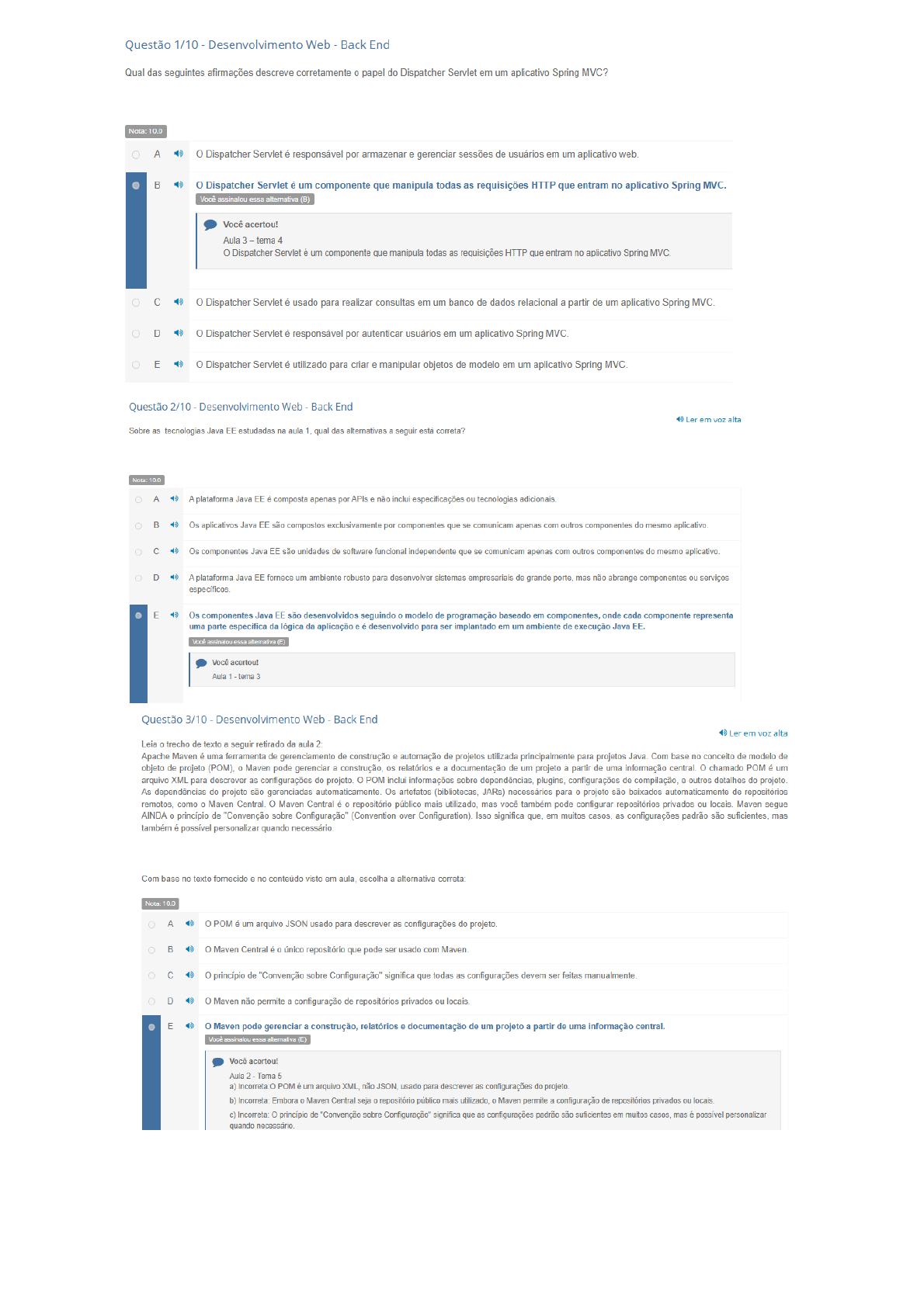 Questão 1/10 Desenvolvimento Web Back End Qual das seguintes afirmações descreve corretamente 0 papel do Dispatcher Servlet em um aplicativo Spring MVC? Nota: 10.0 A Dispatcher Servlet é responsável por armazenar e gerenciar sessões de usuários em um aplicativo web. Dispatcher Servlet é um componente que manipula todas as requisições HTTP que entram no aplicativo Spring MVC. Você assinalou essa alternativa (B) Você acertou! Aula 3 tema 4 Dispatcher é um componente que manipula todas as requisições HTTP que entram no aplicativo Spring MVC. C Dispatcher Servlet é usado para realizar consultas em um banco de dados relacional a partir de um aplicativo Spring MVC. D Dispatcher Servlet é responsável por autenticar usuários em um aplicativo Spring MVC. E Dispatcher Servlet é utilizado para criar e manipular objetos de modelo em um aplicativo Spring MVC. Questão 2/10 Desenvolvimento Web Back End Ler em voz alta Sobre as tecnologias Java estudadas na aula 1, qual das alternativas a seguir está correta? Nota: 10.0 A A plataforma Java EE é composta apenas por APIs e não inclui especificações ou tecnologias adicionais. Os aplicativos Java são compostos exclusivamente por componentes que se comunicam apenas com outros componentes do mesmo aplicativo. Os componentes Java são unidades de software funcional independente que se comunicam apenas com outros componentes do mesmo aplicativo. D A plataforma Java fornece um ambiente robusto para desenvolver sistemas empresariais de grande porte, mas não abrange componentes ou serviços específicos. E Os componentes Java são desenvolvidos seguindo modelo de programação baseado em componentes, onde cada componente representa uma parte específica da lógica da aplicação e é desenvolvido para ser implantado em um ambiente de execução Java Você assinalou essa alternativa (E) Você acertou! Aula tema 3 Questão 3/10 - Desenvolvimento Web Back End Ler em voz alta Leia trecho de texto a seguir retirado da aula 2: Apache Maven é uma ferramenta de gerenciamento de construção e automação de projetos utilizada principalmente para projetos Java. Com base no conceito de modelo de objeto de projeto (POM), 0 Maven pode gerenciar a construção, relatórios e a documentação de um projeto a partir de uma informação central. chamado POM é um arquivo XML para descrever as configurações do projeto. POM inclui informações sobre dependências, plugins, configurações de compilação, e outros detalhes do projeto. As dependências do projeto são gerenciadas automaticamente. Os artefatos (bibliotecas, JARs) necessários para 0 projeto são baixados automaticamente de repositórios remotos, como Maven Central. Maven Central é repositório público mais utilizado, mas você também pode configurar repositórios privados ou locais. Maven segue AINDA 0 princípio de "Convenção sobre Configuração" (Convention over Configuration). Isso significa que, em muitos casos, as configurações padrão são suficientes, mas também é possível personalizar quando necessário. Com base no texto fornecido e no conteúdo visto em aula, escolha a alternativa correta: Nota: 10.0 A POM é um arquivo JSON usado para descrever as configurações do projeto. Maven Central é 0 único repositório que pode ser usado com Maven. princípio de "Convenção sobre Configuração" significa que todas as configurações devem ser feitas manualmente. D Maven não permite a configuração de repositórios privados ou locais. E Maven pode gerenciar a construção, relatórios e documentação de um projeto a partir de uma informação central. Você assinalou essa alternativa Você acertou! Aula Tema 5 a) Incorreta POM é um arquivo XML não JSON, usado para descrever as configurações do projeto. b) Incorreta: Embora 0 Maven Central seja 0 repositório público mais utilizado, 0 Maven permite a configuração de repositórios privados ou c) Incorreta: princípio de "Convenção sobre Configuração" significa que as configurações padrão são suficientes em muitos casos, mas é possível personalizar quando necessário.Questão 4/10 Desenvolvimento Web - Back End Ler Com base nos benefícios da arquitetura multicamada abordados na aula 1, qual das alternativas a seguir está correta? Nota: 10.0 A A arquitetura multicamada dificulta a manutenção e evolução do software devido à alta interdependência entre as A arquitetura multicamada não permite a reutilização de suas camadas em diferentes contextos ou projetos. A arquitetura multicamada facilita a escalabilidade, pois cada camada pode ser dimensionada independentemente conforme necessário. Você assinalou essa alternativa (C) Você acertou! Aula tema 1 A arquitetura multicamada facilita a escalabilidade, pois cada camada pode ser dimensionada independentemente conforme necessário. D A arquitetura multicamada impede 0 uso de padrões de desenvolvimento como MVC (Model, View e Controller). E A arquitetura multicamada não é adequada para projetos que requerem modularidade e manutenibilidade. Questão 5/10 Desenvolvimento Web Back End Ler em voz alta Qual das seguintes afirmações sobre as dependências Iniciais Opinativas (starters) no Spring Boot está correta? Nota: 10.0 A As dependências iniciais no Spring Boot são configuradas manualmente pelos desenvolvedores para atender às necessidades específicas de cada projeto. Os starters no Spring Boot são pré-configurações que facilitam a integração com ferramentas de teste unitário, mas não cobrem outras áreas do desenvolvimento. As dependências iniciais no Spring Boot incluem starters para desenvolvimento web, acesso a dados e segurança, entre outros, simplificando processo de configuração do aplicativo. Você assinalou essa alternativa (C) Você acertou! Aula 2 tema 2 A) Incorreta: As dependências iniciais no Spring Boot são pré-configuradas, não exigindo configuração manual pelos desenvolvedores. B) Incorreta: Os starters