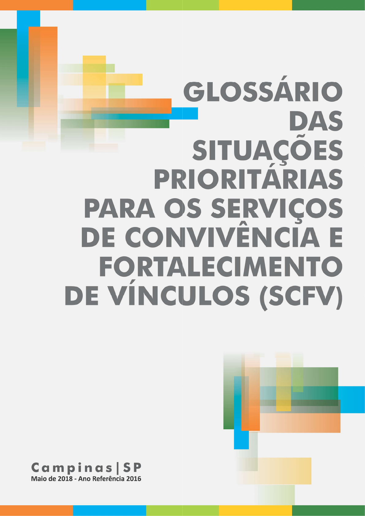 GLOSSÁRIO DAS SITUAÇÕES PRIORITARIAS PARA OS SERVIÇOS DE CONVIVÊNCIA E FORTALECIMENTO DE VÍNCULOS (SCFV) Campinas I SP Maio de 2018 - Ano Referência 2016FICHA TÉCNICA Prefeito Municipal de Campinas Jonas Donizette Secretária Municipal de Cidadania, Assistência e Inclusão Social Jane Valente Departamento de Operações da Assistência Social Sílvia Jeni Luiz Pereira de Brito Coordenadoria Setorial de Proteção Social Básica Zuleika Aparecida Minussi Carneiro ELABORAÇÃO Pesquisa e Redação Alexandre Ceconello Marinho Organização e Colaboração Técnica Alexandre Ceconello Marinho Giovanna Puosso Labbate Eliete Sampaio Leila Sueli Dias Maria Margarida da Silva Maria José Tofoli Maria Rachel Nascimento Projeto Gráfico e Editoração Daniella Tristão Esteca Supervisão Sílvia Jeni Luiz Pereira de Brito Zuleika Aparecida Minussi Carneiro Revisão Final Sílvia Jeni Luiz Pereira de Brito CONTRIBUIÇÕES Esta publicação foi elaborada a partir da colaboração de muitas pessoas, dentre profissionais e gestores de serviços da Proteção Social Básica (PSB), da Proteção Social Especial (PSE) e da área de Vigilância Socioassitencial, do município de Campinas, que se dispuseram aos encontros e às discussões sobre as onze situações prioritárias para atendimento nos Serviços de Convivência e Fortalecimento de Vínculos (SCFV), conforme preconizado pelo Ministério do Desenvolvimento Social e Combate à Fome (MDS). As contribuições ocorreram durante o ano de 2016, através do Grupo de Trabalho para Reordenamento dos SCFV Ampliado (GT Ampliado) e dos Grupos de Trabalho para Reordenamento dos SCFV Regionais (GT's Regionais).SUMÁRIO PREFÁCIO 04 INTRODUÇÃO 05 CARACTERÍSTICAS GERAIS DO SCFV 08 que é SCFV? 04 Quem é público-alvo dos SCFV? 04 Quem é público prioritário para os SCFV? 04 Comprovação das situações prioritárias. 04 SITUAÇÕES PRIORITÁRIAS: definição pelo MDS e discussões complementares 04 I. Em situação de isolamento; 04 II. Trabalho infantil; 04 III. Vivência de violência e/ou negligência; 04 IV. Fora da escola ou com defasagem escolar superior 2 (dois) anos; 04 V. Em situação de acolhimento; 04 VI. Em cumprimento de medida socioeducativa em meio aberto; 04 VII. Egressos de medidas socioeducativas; 04 VIII. Situação de abuso e/ou exploração sexual; 04 IX. Com medidas de proteção do ECA; 04 X. Crianças e adolescentes em situação de rua; 04 XI. Vulnerabilidade que diz respeito às pessoas com deficiência. 04 REFERÊNCIAS BIBLIOGRÁFICAS ANEXO RELAÇÃO DOS SCFV NO MUNÍCIPIO DE CAMPINAS 04PREFÁCIO Quero expressar meu prazer em apresentar este trabalho por reconhecer a sua importância, a competência entusiasmo das pessoas envolvidas na sua elaboração. Este glossário faz parte das ações do processo de reordenamento dos Serviços de Convivência e Fortalecimento de Vínculos no município de Campinas e tem envolvido, além de servidores públicos, muitos outros profissionais de diversas organizações. Entendo que reordenar é reorientar práticas e ideologias em busca de um novo paradigma sociopolítico que leve em conta as novas formas de fazer propostas tanto pela Política Nacional de Assistência Social quanto pela Tipificação Nacional dos Serviços Socioassistenciais e trabalho de reordenamento exige compromisso e fidelidade ao processo por parte de todos os envolvidos. Nesse processo de elaboração os encontros representaram uma rica oportunidade de troca de conhecimentos em assuntos tão próximos, mas ao mesmo tempo tão distintos. desenvolvimento dos trabalhos foi ancorado no compromisso em respeitar cada território, com sua realidade e sua cultura, marcadas por trajetórias e conquistas próprias. A estratégia metodológica ofereceu oportunidade de comprometimento individual e coletivo: de forma gradativa envolveram-se pessoas, com objetivos claros, engajamento, criatividade, sempre no compromisso de uma ação reflexiva que oportunizou a construção de conhecimento e de sujeitos políticos. Sutilezas do cotidiano apresentavam-se como desafiosconstantes e as respostas eram provocadas de forma que cada profissional pudesse elaborá-las a partir de suas experiências. Ressalta-se a oportunidade do convívio com as especificidades e as peculiaridades do exercício de cada função, tornando relevante trabalho multidisciplinar, oportunizando a explicitação da divisão técnica de trabalho e a resultante do trabalho conjunto. Mostra ainda a dimensão de parceria e do trabalho em rede com a articulação entre os diferentes serviços socioassistenciais, o lugar de cada um e o difícil compartilhamento de responsabilidades. Estas questões tornaram-se muito presentes nas discussões dos profissionais! Afinal a assistência social, como política pública, inscreve-se cotidianamente como uma história de atendimento multidisciplinar, quer seja em ações preventivas, quer seja em ações curativas. Porém, falar de ações preventivas na assistência social é falar de ações já cunhadas pela vulnerabilidade e risco social, haja vista o público prioritário discutido no presente trabalho. Evidenciou-se, então, a importância de fundamentar a partir deste glossário, reflexões e práticas desenvolvidas pelas equipes de forma que desvelasse a relação intrínseca existente entre as diversificadas e contraditórias dimensões de seus trabalhos específicos. Ficou evidente, também, para além dessas diferenças, a valorização da transdisciplinaridade da abordagem, no sentido de reconstituir a unidade de seu objeto de intervenção no contexto da diversidade das ações necessárias para superação das questões postas. Neste trabalho, a equipe traduz muitos sentimentos e percepções que decorrem da experiência profissional de cada um e, penso, que ele provocará também muitos outros profissionais. Oferece a oportunidade de reflexões sutis que trazem à tona muitos aspectos vividos nos serviços