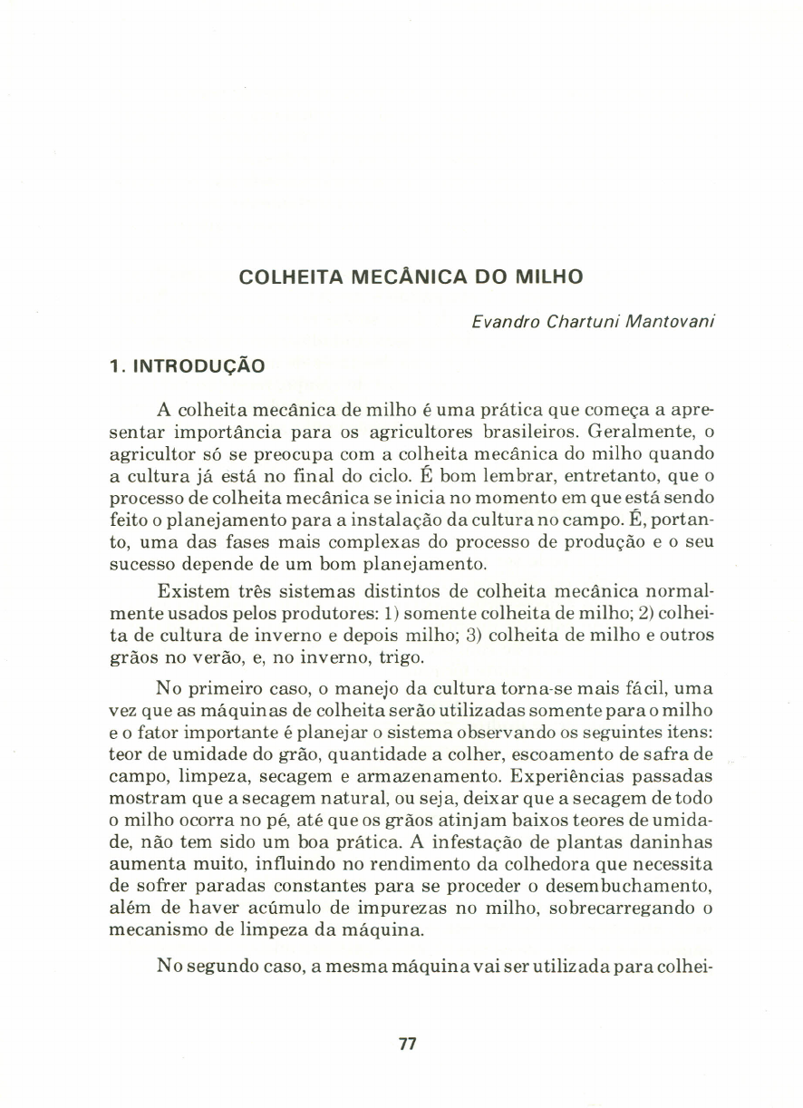 COLHEITA MECANICA DO MILHO Evandro Chartuni Mantovani 1. INTRODUÇÃO A colheita mecânica de milho é uma prática que começa a apre- sentar importância para os agricultores brasileiros. Geralmente, o agricultor só se preocupa com a colheita mecânica do milho quando a cultura já está no final do ciclo. É bom lembrar, entretanto, que o processo de colheita mecânica se inicia no momen to em que está sendo feito o planejamento para a instalação da cultura no campo. É, portan- to, uma das fases mais complexas do processo de produção e o seu sucesso depende de um bom planejamento. Existem três sistemas distintos de colheita mecânica normal- mente usados pelos produtores: 1) somente colheita de milho; 2) colhei- ta de cultura de inverno e depois milho; 3) colheita de milho e outros grãos no verão, e, no inverno, trigo. No primeiro caso, o manejo da cultura torna-se mais fácil, uma vez que as máquinas de colheita serão utilizadas somente para omilho e o fator importante é planejar o sistema observando os seguintes itens: teor de umidade do grão, quantidade a colher, escoamento de safra de campo, limpeza, secagem e armazenamento. Experiências passadas mostram que a secagem natural, ou seja, deixar que a secagem de todo o milho ocorra no pé, até que os grãos atinjam baixos teores de umida- de, não tem sido um boa prática. A infestação de plantas daninhas aumenta muito, influindo no rendimento da colhedora que necessita de sofrer paradas constantes para se proceder o desembuchamento, além de haver acúmulo de impurezas no milho, sobrecarregando o mecanismo de limpeza da máquina. No segundo caso, a mesma máquina vai ser utilizada para colhei- 71 ta de mais de uma cultura e há prioridades de colheita, como é o caso da soja e/ou do arroz. Nesse caso, o milho é colhido após as outras cul- turas e, por isso, numa faixa de umidade bem baixa. Nestas condições, a secagem artificial fica praticamente excluída do sistema, e o escoa- mento de safra do campo, limpeza e armazenamento são os fatores mais importantes a serem observados no planejamento; do contrário, todo o sistema perde em eficiência, porque o processo é interrompido em uma dessas fases. Finalmente, o terceiro sistema apresenta um cronograma de ati- vidade bastante apertado, obrigando o produtor a um esforço muito grande para poder dar conta de duas safras num mesmo ano. Neste caso, o produtor terá que redobrar seus cuidados com o planejamento do sistema, porque a colheita é uma das fases de maior importância, acompanhada do escoamento de safra do campo, recepção, limpeza, secagem e armazenamento. A comercialização pode afetar o sistema, se não forem liberados silos e/ou armazéns para as outras safras que virão. 2. PLANEJAMENTO DA COLHEITA A colheita pode ser planejada a partir das colhedoras de que o produtor dispõe ou, em caso inverso, a partir da área plantada. Em ambos os casos é necessário calcular a capacidade de colheita da má- quina ou então calcular quantos hectares terão que ser colhidos por hora. O cálculo para se conhecer o rendimento de um equipamento pode ser feito pela seguinte fórmula: v (m/h) x L(m) x f Capacidade efetiva (ha/h)» 10000 onde, V = Velocidade de deslocamento da máquina, m/h L = Largura de trabalho, m f = Fator de campo, ()To Se considerarmos que uma máquina agrícola nunca terá um trabalho contínuo, devido às paralizações para desembuchar, mano- brar, abastecer, conservar, etc, é necessário considerar estes fatores, englobados no fator de campo (f), que significa a eficiência de trabalho da máquina. 78 No caso de coheita mecânica, a literatura tem considerado como valores médios aceitáveis, de 70 a 80%, ou seja, 20 a 30% do tempo é perdido. A colheita deve ser realizada numa faixa de velocidade de 4 a 6 km/h. E, finalmente, a largura de trabalho que se pretende realizar (uma a cinco linhas na plataforma de milho ou uma largura de plata- forma de arroz, soja, trigo, etc,de dois a cinco metros). o planejamento deve levar em conta os seguintes ítens: • área plantada; • número de dias para colheita; • número de colhedoras; • distância entre o campo e o secador; • número de carretas graneleiras; • quantas horas de colheita/dia; • tamanho do secador; • tamanho do silo armazenador. Os dados necessários ao planejamento deste sistema são obtidos em tabelas e através de cálculos que se baseiam nas informações de campo onde será instalada a cultura, e em dados técnicos dos equipa- mentos disponíveis Para uma melhor eficiência durante a colheita mecânica do mi- lho, a divisão dos campos deve ser feita de modo a facilitar a movimen- tação da colhedora e o transporte dos grãos colhidos. Deve-se executar um bom preparo de solo, a fim de que a máquina possa desenvolver a velocidade mais constante possível, em torno da velocidade progra- mada para a colheita e, portanto, econômica. A escolha- da cultivar a ser plantada também é um ponto importante, havendo estreita rela- ção entre o porte da planta e a perda de espigas na colheita. As culti- vares de milho de porte alto são geralmente mais susceptíveis ao aca- mamento e quebramento do colmo, gerando uma perda bastante signi- ficativa de espigas. As cultivares de porte médio ou baixo são as mais indicadas porque têm maior resistência ao acamamento e quebramen- to. Além disso, o plantio deve ser efetuado levando-se em conta: o nú- mero de linhas de colheita e espaçamento entre bocas de colheitadeira; número de linhas do equipamento de plantio e o espaçamento entre linhas de plantio. Exemplo: se a colhedora tem quatro bocas e o espa- çamento entre elas é de 90 em, o plantio deve ser feito com uma plan- tadora de quatro linhas ou múltiplo e o espaçamento entre linhas de plantio deve ser também de 90 em. 79 Este procedimento contribuirá muito para a facilidade de ope- ração do equipamento de colheita e para a redução das perdas. A colheita po
