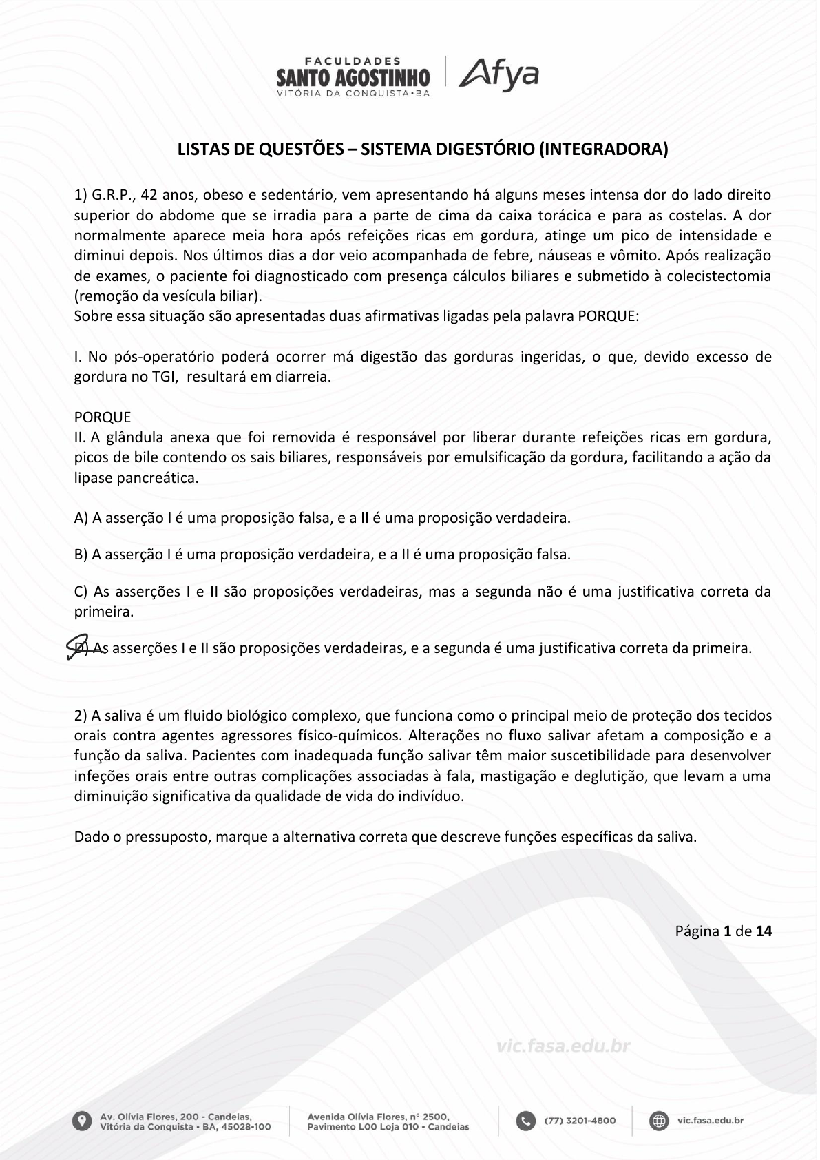 LISTAS DE QUESTÕES – SISTEMA DIGESTÓRIO (INTEGRADORA) 1) G.R.P., 42 anos, obeso e sedentário, vem apresentando há alguns meses intensa dor do lado direito superior do abdome que se irradia para a parte de cima da caixa torácica e para as costelas. A dor normalmente aparece meia hora após refeições ricas em gordura, atinge um pico de intensidade e diminui depois. Nos últimos dias a dor veio acompanhada de febre, náuseas e vômito. Após realização de exames, o paciente foi diagnosticado com presença cálculos biliares e submetido à colecistectomia (remoção da vesícula biliar). Sobre essa situação são apresentadas duas afirmativas ligadas pela palavra PORQUE: I. No pós-operatório poderá ocorrer má digestão das gorduras ingeridas, o que, devido excesso de gordura no TGI, resultará em diarreia. PORQUE II. A glândula anexa que foi removida é responsável por liberar durante refeições ricas em gordura, picos de bile contendo os sais biliares, responsáveis por emulsificação da gordura, facilitando a ação da lipase pancreática. A) A asserção I é uma proposição falsa, e a II é uma proposição verdadeira. B) A asserção I é uma proposição verdadeira, e a II é uma proposição falsa. C) As asserções I e II são proposições verdadeiras, mas a segunda não é uma justificativa correta da primeira. D) As asserções I e II são proposições verdadeiras, e a segunda é uma justificativa correta da primeira. 2) A saliva é um fluido biológico complexo, que funciona como o principal meio de proteção dos tecidos orais contra agentes agressores físico-químicos. Alterações no fluxo salivar afetam a composição e a função da saliva. Pacientes com inadequada função salivar têm maior suscetibilidade para desenvolver infeções orais entre outras complicações associadas à fala, mastigação e deglutição, que levam a uma diminuição significativa da qualidade de vida do indivíduo. Dado o pressuposto, marque a alternativa correta que descreve funções específicas da saliva. Página 1 de 14 A) A amilase salivar é a principal enzima que hidrolisa o amido no processo de digestão, realizando a quebra dele em inúmeras moléculas de glicose. B) As células que secretam saliva mucosa apresentam coloração escura, porque contêm alta proporção de grânulos de zimogênio, isto é, formadores de proteínas e estão predominantemente concentradas nas glândulas parótidas. C) A saliva comporta-se como um sistema tampão que protege a cavidade oral, principalmente pela presença de íons cloreto e sódio, formando cloreto de sódio, um sal tamponante. D) Além de enzimas, como a amilase salivar, a saliva possui proteínas salivares, como a lisozima, que possui a função primordial de hidrolisar a parede celular de algumas bactérias, atuando como componente de defesa contra agregados de bactérias orais. 3) Observe as figuras a seguir sobre o estômago em diferentes momentos funcionais. Figura 1: Ilustração do momento do enchimento do estômago, no início da refeição. Figura 2: Ilustração do esvaziamento do estômago, 3 a 5 horas após a refeição. Página 2 de 14 Marque a alternativa correta sobre a morfofisiologia do estômago. A) No esvaziamento do estômago, como mostrado na figura 2, o quimo ácido que entra no duodeno desencadeia reações que levam a diminuição da secreção ácida gástrica. B) O esvaziamento gástrico é elevado quando a motilidade do estômago aumenta, influenciado por mecanismos neurais e independente da composição do quimo. C) Durante o período de jejum, o estômago fica preparado para receber o alimento deglutido, estando assim mais distendido e com maior volume de secreções gástricas. D) Antes mesmo da fase representada na figura 1, estímulos como o gosto, o cheiro e o pensamento podem aumentar a atividade secretora das células gástricas por ativação simpática 4) O intestino grosso tem sua parede constituída por quatro camadas: mucosa, submucosa, muscular e adventícia ou serosa. A camada mucosa não possui pregas, exceto em sua porção distal, nem vilosidades. Apresentam estruturas e células que auxiliam na defesa e também na formação do bolo fecal. Considerando a morfofisiologia do intestino grosso, avalie as asserções a seguir e a relação proposta entre elas. I – O epitélio que constitui as glândulas intestinais do intestino grosso possui uma proporção de células caliciformes muito grande, quando comparado com o intestino delgado. PORQUE II – Na sua parede, há um tecido linfoide associado ao tubo digestivo (GALT), representado por acúmulo de células, principalmente linfócitos. Assinale a opção correta. A) A asserção I é uma proposição falsa, e a II é uma proposição verdadeira. B) A asserção I é uma proposição verdadeira, e a II é uma proposição falsa. C) As asserções I e II são proposições verdadeiras, mas a II não é uma justificativa correta da I. D) As asserções I e II são proposições verdadeiras, e a II é uma justificativa correta da I. 5) O fígado ocupa posição crucial no metabolismo, ao processar, armazenar e redistribuir combustíveis como glicose, aminoácidos e ácidos graxos. Atua ainda em vias bioquímicas na modificação e detoxificação de compostos endógenos ou absorvidos do intestino. Página 3 de 14 Sobre as funções inerentes ao fígado no sistema digestório avalie as assertivas a seguir e a relação entre elas. I- O fígado metaboliza uma enorme variedade de compostos, não só endógenos (ex. sais biliares, bilirrubina, hormonas) mas também exógenos (ex. drogas e toxinas). Os hepatócitos lidam com todas estas moléculas de formas complexas. PORQUE II- Ocorre uma captação de substâncias plasmáticas através de vários transportadores e canais existentes na sua membrana basolateral; em seguida o fígado processa essas substâncias o que inclui o transporte e modificação química intracelular através 