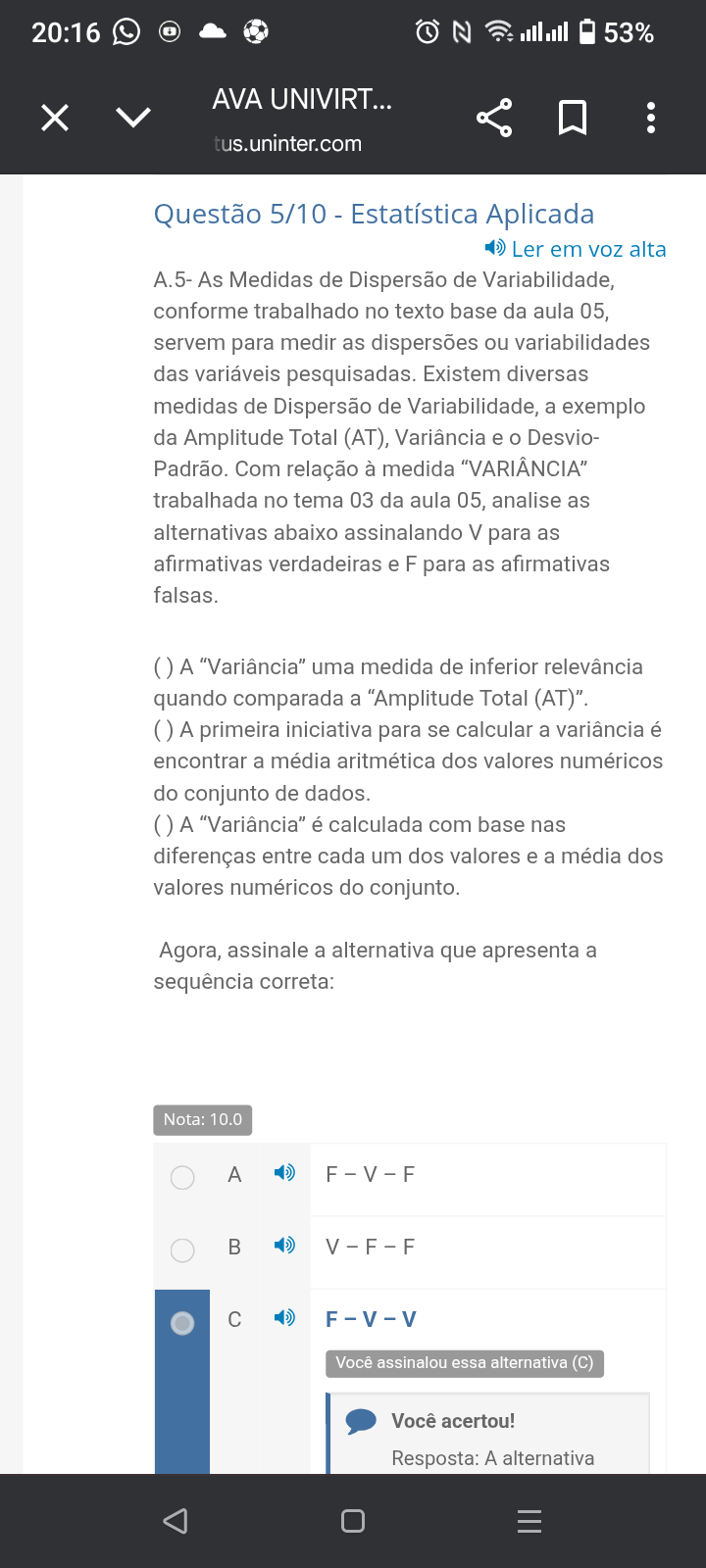 20:16 53% AVA UNIVIRT... X tus.uninter.com Questão 5/10 Estatística Aplicada Ler em voz alta A.5- As Medidas de Dispersão de Variabilidade, conforme trabalhado no texto base da aula 05, servem para medir as dispersões ou variabilidades das variáveis pesquisadas. Existem diversas medidas de Dispersão de Variabilidade, a exemplo da Amplitude Total (AT), Variância e Desvio- Padrão. Com relação à medida "VARIÂNCIA" trabalhada no tema 03 da aula 05, analise as alternativas abaixo assinalando V para as afirmativas verdadeiras e F para as afirmativas falsas. () A "Variância" uma medida de inferior relevância quando comparada a "Amplitude Total (AT)". () A primeira iniciativa para se calcular a variância é encontrar a média aritmética dos valores numéricos do conjunto de dados. () A "Variância" é calculada com base nas diferenças entre cada um dos valores e a média dos valores numéricos do conjunto. Agora, assinale a alternativa que apresenta a sequência correta: Nota: 10.0 A F-V-F V-F-F - F-V-V Você assinalou essa alternativa (C) Você acertou! Resposta: A alternativa