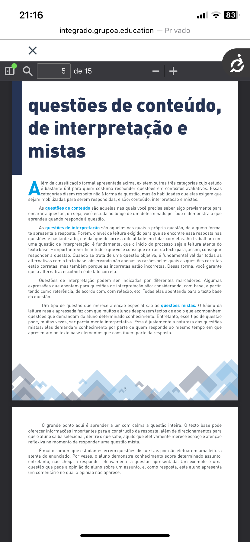 21:16 83 integrado.grupoa.education Privado X 5 de 15 + questões de conteúdo, de interpretação e mistas lém da classificação formal apresentada acima, existem outras três categorias cujo estudo é bastante útil para quem costuma responder questões em contextos avaliativos. Essas categorias dizem respeito não à forma da questão, mas às habilidades que elas exigem que sejam mobilizadas para serem respondidas, e são: conteúdo, interpretação e mistas. As questões de conteúdo são aquelas nas quais você precisa saber algo previamente para encarar a questão, ou seja, você estuda ao longo de um determinado período e demonstra que aprendeu quando responde à questão. As questões de interpretação são aquelas nas quais a própria questão, de alguma forma, te apresenta a resposta. Porém, de leitura exigido para que se encontre essa resposta nas questões é bastante alto, e é daí que decorre a dificuldade em lidar com elas. Ao trabalhar com uma questão de interpretação, é fundamental que início do processo seja a leitura atenta do texto base. É importante verificar tudo que você consegue extrair do texto para, assim, conseguir responder à questão. Quando se trata de uma questão objetiva, é fundamental validar todas as alternativas com texto base, observando não apenas as razões pelas quais as questões corretas estão corretas, mas também porque as incorretas estão incorretas. Dessa forma, você garante que a alternativa escolhida é de fato correta. Questões de interpretação podem ser indicadas por diferentes marcadores. Algumas expressões que apontam para questões de interpretação são: considerando, com base, a partir, tendo como referência, de acordo com, com relação, etc. Todas elas apontando para texto base da questão. Um tipo de questão que merece atenção especial são as questões mistas. 0 hábito da leitura rasa e apressada faz com que muitos alunos desprezem textos de apoio que acompanham questões que demandam do aluno determinado conhecimento. Entretanto, esse tipo de questão pode, muitas vezes, ser parcialmente interpretativa. Essa é justamente a natureza das questões mistas: elas demandam conhecimento por parte de quem responde ao mesmo tempo em que apresentam no texto base elementos que constituem parte da resposta. 0 grande ponto aqui é aprender a ler com calma a questão inteira. 0 texto base pode oferecer informações importantes para a construção da resposta, além de direcionamentos para que 0 aluno saiba selecionar, dentre 0 que sabe, aquilo que efetivamente merece espaço e atenção reflexiva no momento de responder uma questão mista. É muito comum que estudantes errem questões discursivas por não efetuarem uma leitura atenta do enunciado. Por vezes, 0 aluno demonstra conhecimento sobre determinado assunto, entretanto, não chega a responder efetivamente a questão apresentada. Um exemplo é uma questão que pede a opinião do aluno sobre um assunto, e, como resposta, este aluno apresenta um comentário no qual a opinião não aparece.