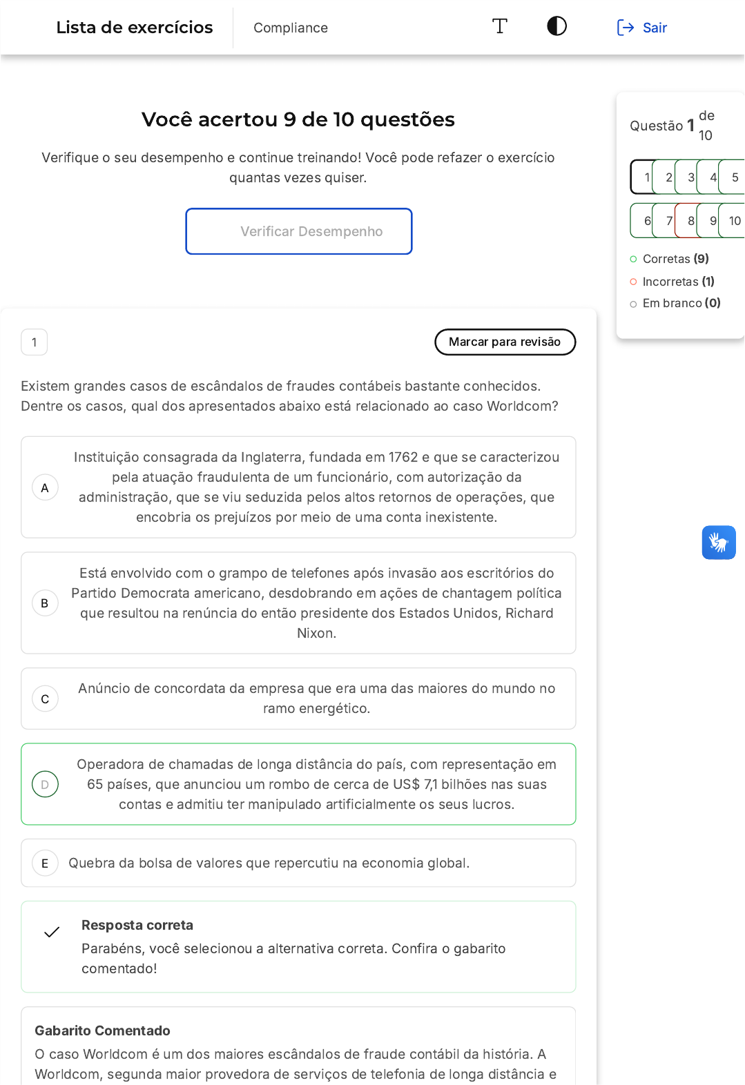 Você acertou 9 de 10 questões Verifique o seu desempenho e continue treinando! Você pode refazer o exercício quantas vezes quiser. Verificar Desempenho A B C D E 1 Marcar para revisão Existem grandes casos de escândalos de fraudes contábeis bastante conhecidos. Dentre os casos, qual dos apresentados abaixo está relacionado ao caso Worldcom? Instituição consagrada da Inglaterra, fundada em 1762 e que se caracterizou pela atuação fraudulenta de um funcionário, com autorização da administração, que se viu seduzida pelos altos retornos de operações, que encobria os prejuízos por meio de uma conta inexistente. Está envolvido com o grampo de telefones após invasão aos escritórios do Partido Democrata americano, desdobrando em ações de chantagem política que resultou na renúncia do então presidente dos Estados Unidos, Richard Nixon. Anúncio de concordata da empresa que era uma das maiores do mundo no ramo energético. Operadora de chamadas de longa distância do país, com representação em 65 países, que anunciou um rombo de cerca de US$ 7,1 bilhões nas suas contas e admitiu ter manipulado artificialmente os seus lucros. Quebra da bolsa de valores que repercutiu na economia global. Resposta correta Parabéns, você selecionou a alternativa correta. Confira o gabarito comentado! Gabarito Comentado O caso Worldcom é um dos maiores escândalos de fraude contábil da história. A Worldcom, segunda maior provedora de serviços de telefonia de longa distância e Questão 1 de 10 Corretas (9) Incorretas (1) Em branco (0) 1 2 3 4 5 6 7 8 9 10 Lista de exercícios Compliance Sair A B C D E de dados nos EUA, anunciou em junho de 2002 que iria revisar a quantia de US$ 3,85 bilhões em suas demonstrações financeiras. Este anúncio revelou um rombo de cerca de US$ 7,1 bilhões nas contas da empresa, que admitiu ter manipulado artificialmente seus lucros. As irregularidades contábeis foram descobertas durante uma auditoria interna, transformando lucros anteriormente relatados em perdas e deixando investidores, analistas e o público perplexos. Portanto, a alternativa D é a correta, pois descreve corretamente o caso Worldcom. 2 Marcar para revisão Existem grandes casos de escândalos de fraudes contábeis bastante conhecidos. Dentre os casos qual dos apresentados abaixo está relacionado ao caso do Banco Barings: Instituição consagrada da Inglaterra, fundada em 1762 e que se caracterizou pela atuação fraudulenta de um funcionário, com autorização da administração, que se viu seduzida pelos altos retornos de operações, que encobria os prejuízos por meio de uma conta inexistente. Está envolvido com o grampo de telefones após invasão aos escritórios do Partido Democrata americano, desdobrando em ações de chantagem política que resultou na renúncia do então presidente dos Estados Unidos, Richard Nixon. Anúncio de concordata da empresa que era uma das maiores do mundo no ramo energético. Operadora de chamadas de longa distância do país, com representação em 65 países, que anunciou um rombo de cerca de US$ 7,1 bilhões nas suas contas e admitiu ter manipulado artificialmente os seus lucros. Quebra da bolsa de valores que repercutiu na economia global. Resposta correta Parabéns, você selecionou a alternativa correta. Confira o gabarito comentado! Gabarito Comentado O Barings Public Limited Company (Barings PLC), conhecido popularmente como o Banco da Rainha, possui uma das histórias mais nobres e trágicas no setor bancário. Inicialmente, a empresa cresceu de importância na Europa durante a guerra contra Napoleão ao financiar as campanhas militares da Grã-Bretanha, ajudando a organizar a recuperação financeira da França após o fim da guerra. Durante o século XIX, o banco passou a ser considerado como a sexta grande A B C D E potência européia, envolvendo-se na venda da Louisiana por parte da França para americanos em 1803, no refinanciamento do Banco da Inglaterra em 1839 e na reconstituição do Banco da França (Banque de France) em 1849. No ano de 1890, o Banco Barings enfrentou sua primeira grande crise, decorrente de uma expansão especulativa que gerou um passivo para a empresa de mais de 21 milhões de libras esterlinas. Mesmo sendo resgatado da falência pelo Banco da Inglaterra, o Barings nunca mais alcançou a posição proeminente que possuía anteriormente. Contudo, o último capítulo dramático na história do banco aconteceu em 1995, quando especulações de investimento realizadas pelo gerente Nick Leeson levou a perdas de cerca de um bilhão de libras esterlinas. 3 Marcar para revisão Um grande escândalo empresarial foi responsável pelo amadurecimento e reconhecimento da necessidade de adoção de políticas de compliance pelas empresas. Assinale a alternativa que identifica a organização que foi penalizada por práticas indevidas e que teve o caso conhecido mundialmente: Toshiba. Siemens. Toyota. GE. Volkswagen. Resposta correta Parabéns, você selecionou a alternativa correta. Confira o gabarito comentado! Gabarito Comentado O caso que ficou conhecido mundialmente e levou ao amadurecimento e reconhecimento da necessidade de adoção de políticas de compliance pelas empresas foi o da Siemens. Em 2002, a empresa alemã ganhou um contrato de R$ 33 milhões para fazer a manutenção de dez veículos. Este negócio é um dos vários que foram investigados pelo Conselho Administrativo de Defesa Econômica (Cade), Ministério Público e Polícia Federal. O estopim do caso foram denúncias feitas pela própria Siemens ao Cade, alegando que ela teria formado um cartel com outras multinacionais da França, Canadá, Espanha e Japão para manipular os preços de uma licitação pública, além de ter pago propina a autoridades do A B C D E governo de São Paulo por mais de uma década. Fonte: https://www.bbc.com/portuguese/noticias/2013/08/130812_siemens_escandalo_dg 4 Marcar para revisão (IADES/2018 - adaptada) A palav