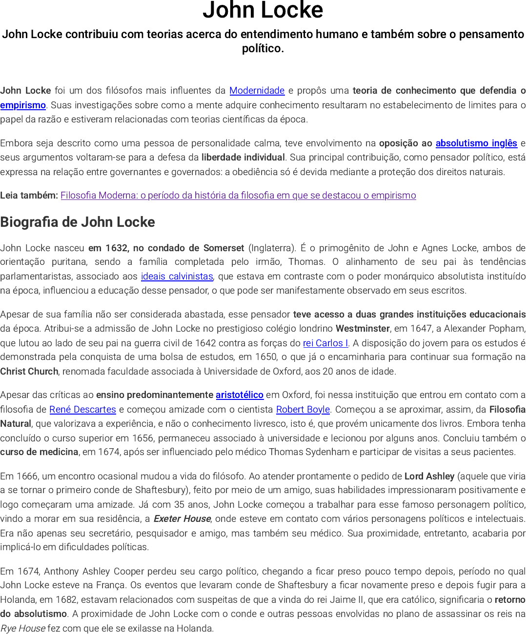John Locke John Locke contribuiu com teorias acerca do entendimento humano e também sobre o pensamento político. John Locke foi um dos filósofos mais influentes da Modernidade e propôs uma teoria de conhecimento que defendia o empirismo. Suas investigações sobre como a mente adquire conhecimento resultaram no estabelecimento de limites para o papel da razão e estiveram relacionadas com teorias científicas da época. Embora seja descrito como uma pessoa de personalidade calma, teve envolvimento na oposição ao absolutismo inglês e seus argumentos voltaram-se para a defesa da liberdade individual. Sua principal contribuição, como pensador político, está expressa na relação entre governantes e governados: a obediência só é devida mediante a proteção dos direitos naturais. Leia também: Filosofia Moderna: o período da história da filosofia em que se destacou o empirismo Biografia de John Locke John Locke nasceu em 1632, no condado de Somerset (Inglaterra). É o primogênito de John e Agnes Locke, ambos de orientação puritana, sendo a família completada pelo irmão, Thomas. O alinhamento de seu pai às tendências parlamentaristas, associado aos ideais calvinistas, que estava em contraste com o poder monárquico absolutista instituído na época, influenciou a educação desse pensador, o que pode ser manifestamente observado em seus escritos. Apesar de sua família não ser considerada abastada, esse pensador teve acesso a duas grandes instituições educacionais da época. Atribui-se a admissão de John Locke no prestigioso colégio londrino Westminster, em 1647, a Alexander Popham, que lutou ao lado de seu pai na guerra civil de 1642 contra as forças do rei Carlos I. A disposição do jovem para os estudos é demonstrada pela conquista de uma bolsa de estudos, em 1650, o que já o encaminharia para continuar sua formação na Christ Church, renomada faculdade associada à Universidade de Oxford, aos 20 anos de idade. Apesar das críticas ao ensino predominantemente aristotélico em Oxford, foi nessa instituição que entrou em contato com a filosofia de René Descartes e começou amizade com o cientista Robert Boyle. Começou a se aproximar, assim, da Filosofia Natural, que valorizava a experiência, e não o conhecimento livresco, isto é, que provém unicamente dos livros. Embora tenha concluído o curso superior em 1656, permaneceu associado à universidade e lecionou por alguns anos. Concluiu também o curso de medicina, em 1674, após ser influenciado pelo médico Thomas Sydenham e participar de visitas a seus pacientes. Em 1666, um encontro ocasional mudou a vida do filósofo. Ao atender prontamente o pedido de Lord Ashley (aquele que viria a se tornar o primeiro conde de Shaftesbury), feito por meio de um amigo, suas habilidades impressionaram positivamente e logo começaram uma amizade. Já com 35 anos, John Locke começou a trabalhar para esse famoso personagem político, vindo a morar em sua residência, a Exeter House, onde esteve em contato com vários personagens políticos e intelectuais. Era não apenas seu secretário, pesquisador e amigo, mas também seu médico. Sua proximidade, entretanto, acabaria por implicá-lo em dificuldades políticas. Em 1674, Anthony Ashley Cooper perdeu seu cargo político, chegando a ficar preso pouco tempo depois, período no qual John Locke esteve na França. Os eventos que levaram conde de Shaftesbury a ficar novamente preso e depois fugir para a Holanda, em 1682, estavam relacionados com suspeitas de que a vinda do rei Jaime II, que era católico, significaria o retorno do absolutismo. A proximidade de John Locke com o conde e outras pessoas envolvidas no plano de assassinar os reis na Rye House fez com que ele se exilasse na Holanda. https://brasilescola.uol.com.br/sociologia/o-que-modernidade.htm https://brasilescola.uol.com.br/filosofia/empirismo.htm https://brasilescola.uol.com.br/historiag/o-absolutismo-ingles.htm https://brasilescola.uol.com.br/filosofia/filosofia-moderna.htm https://brasilescola.uol.com.br/historiag/ataques-igreja-calvinismo.htm https://brasilescola.uol.com.br/historiag/carlos1.htm https://brasilescola.uol.com.br/filosofia/aristoteles.htm https://brasilescola.uol.com.br/biografia/rene-descartes.htm https://brasilescola.uol.com.br/quimica/robert-boyle-quimico-alquimista.htm Anthony Ashley Cooper, o primeiro conde de Shaftesbury. Em seu exílio, que durou cerca de cinco anos, leu o livro de Isaac Newton, Principia Mathematica, físico com o qual fez amizade após retornar para a Inglaterra, em 1689, após a Revolução Gloriosa. Foi a partir desse momento que começou a publicar suas principais obras, que já haviam sido escritas há muitos anos. Esteve, até poucos anos antes de morrer (em 1704), envolvido com questões políticas e com sua produção intelectual. Escreveu muitas defesas de sua Carta sobre a tolerância (1689), publicou A Razoabilidade do Cristianismo (1695) e um escrito com ideias sobre a educação de sua época. “[O] cuidado da salvação das almas de modo algum pode pertencer ao magistrado civil; porque, mesmo se a autoridade das leis e a força das penalidades fossem capazes de converter o espírito dos homens, ainda assim isso em nada ajudaria para a salvação das almas. Pois se houvesse apenas uma religião verdadeira, uma única via para o céu, que esperança haveria que a maioria dos homens a alcançasse, se os mortais fossem obrigados a ignorar os ditames de sua própria razão e consciência, e cegamente aceitarem as doutrinas impostas por seu príncipe, e cultuar Deus na maneira formulada pelas leis de seu país?” |1| Leia também: Racionalismo – a contraposição filosófica ao empirismo de Locke O problema do conhecimento para Locke Conta-se que a proposta da investigação feita em Acerca do Entendimento Humano surgiu em uma conversa na Exeter House, em meados de 1971. Embora utilizemos o entendimento para conhecer, em poucas ocasiões tomamos nossas f