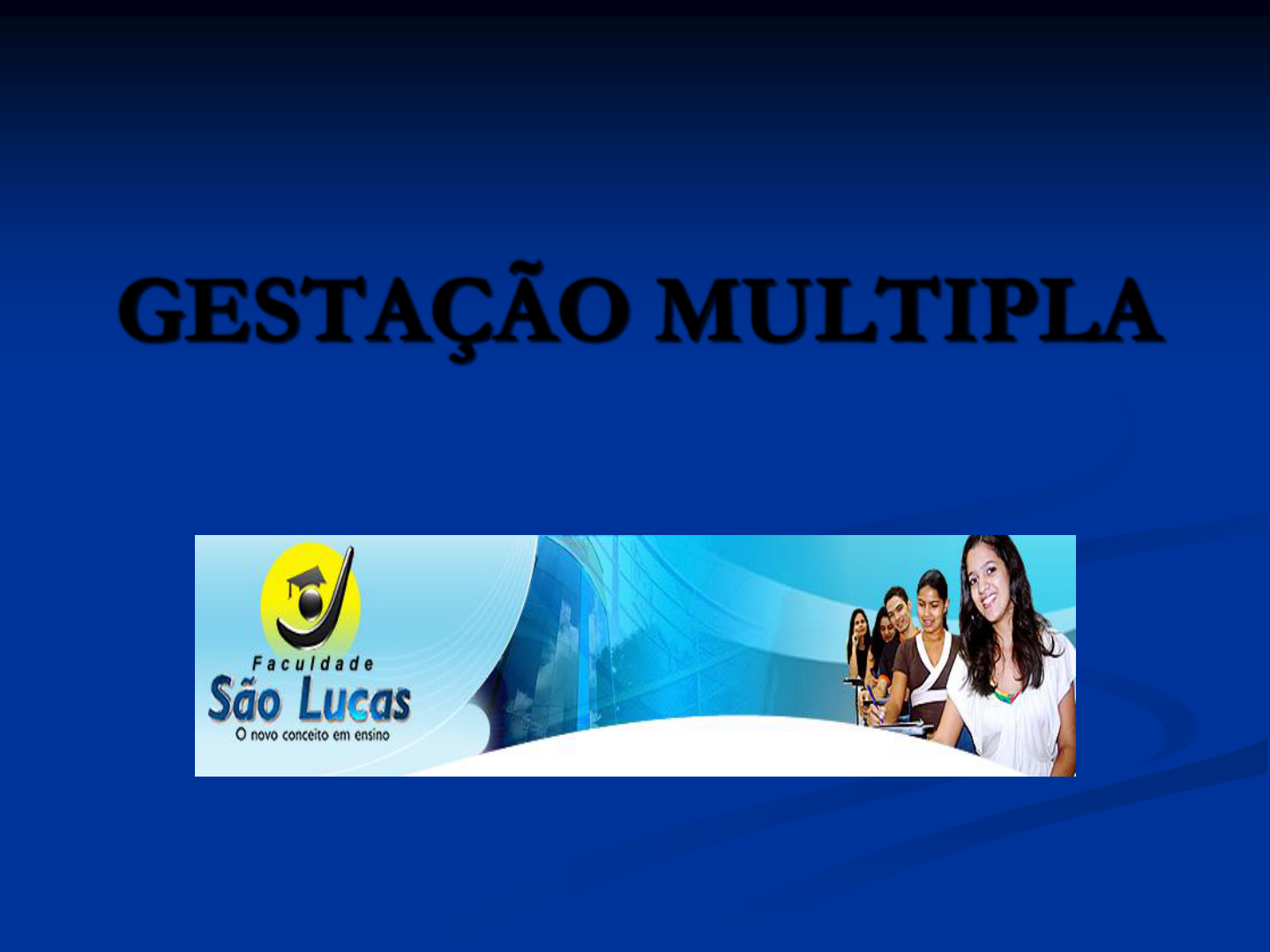 Clique para editar o estilo do título mestre Clique para editar o estilo do subtítulo mestre * * * GESTAÇÃO MULTIPLA * * * Sinonímia Presença simultânea de dois ou mais conceptos constitui a prenhes múltipla ( dupla, tripla, quadrupla, quintupla, sextupla etc, sendo esses conceptos considerados gêmeos. * * * ETIOLOGIA Fraternos : 2 óvulos, 2 sptz dizigóticos, bivitelinos 2/3 das gestações gemelares sexos iguais ou diferentes sempre dicoriônicos/diamnióticos Idênticos : 1 óvulo, 1 sptz monozigóticos, univitelinos 1/3 das gestações gemelares Sexos sempre iguais di/di, mono/di, mono/mono, gemelaridade imperfeita * * * ETIOLOGIA Os anexos embrionários: dizigóticos: dois óvulos = 2 placentas, 2 córions, 2 amnios monozigótico: um óvulo = 1-3 dias = dicor/diamn 4-8 dias = diamn/monocor 9-13 dias = mono/mono >13 dias = imperfeito * * * Gemelidade Imperfeita Cerca de 1% das gestações - 50% natimortos Xifópagos – fusão do tórax Onfalópagos – fusão do abdomen Pigópogos – fusão da pelve Cefalópagos – fusão do crânio * * * * * * DIAGNÓSTICO Antecedente familiar e pessoal Tratamento de infertilidade Altura uterina incompatível Presença de dois focos de batimento cardiaco fetal Palpação e toque de partes fetais B-hcg quantitativo RX USG * * * ADAPTAÇÃO MATERNA Êmese e hiperêmese Maior volemia ( mais 500 ml) Maior demanda de ferro e ácido fólico Maior anemia Edema, dispnéia, estrias DIMINUIÇÃO DA DURAÇÃO DA GESTAÇÃO * * * GESTAÇÃO DE RISCO Parto pré-termo Amniorrexe prematura (ROPREMA) Polidrâmnia Placenta prévia Toxemia tardia (20%) RN com baixo peso Hemorragia pós parto * * * VIA DE PARTO CEFALICO/CEFALICO : VAGINAL CAFALICO/PELVICO : SE SEGUNDO COM MENOS DE 1500 g VAGINAL SE MAIS CESÁREA CEFALICO/TRANSVERSO: SE SEGUNDO MENOS DE 1500g VAGINAL SE MAIS CESÁREA PRIMEIRO PELVICO OU TRANSVERSO: CESÁREA MAIS DE DOIS :CESÁREA * * * * * *
