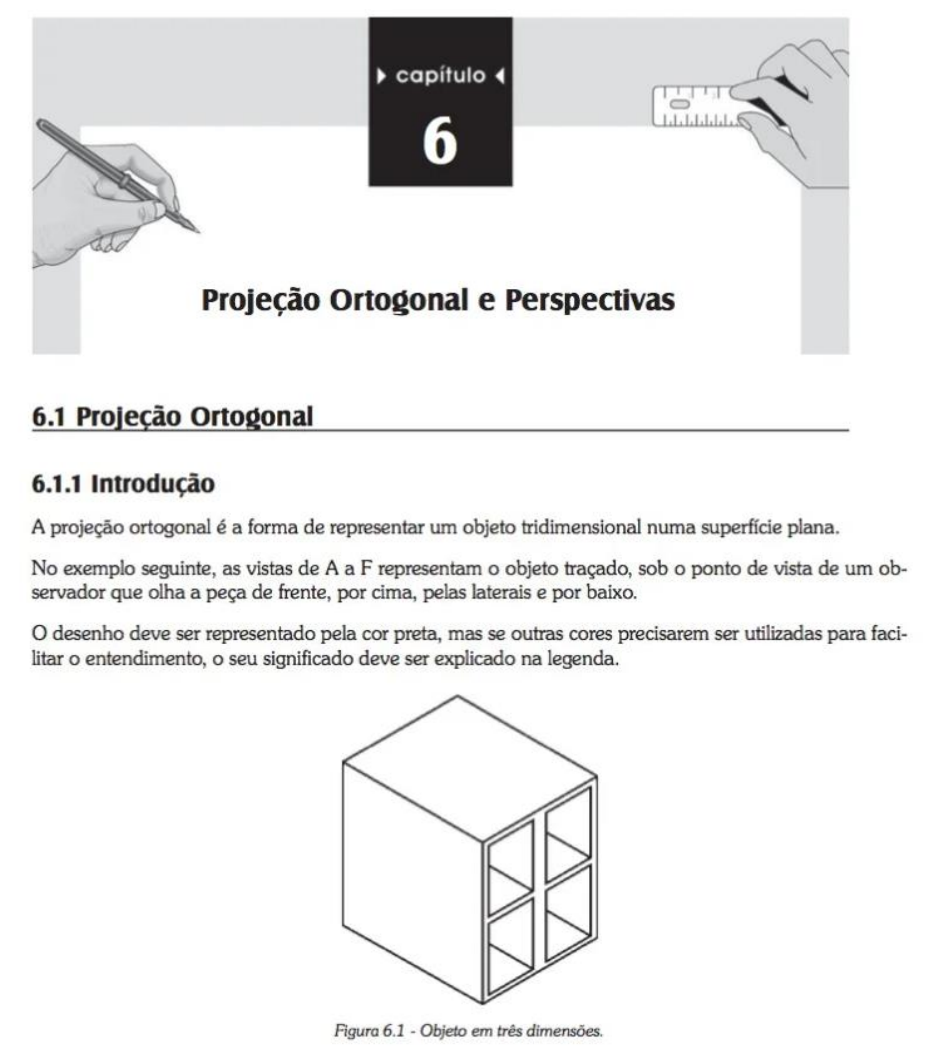 capítulo 6 Projeção Ortogonal e Perspectivas 6.1 Projeção Ortogonal 6.1.1 Introdução A projeção ortogonal é a forma de representar um objeto tridimensional numa superfície plana. No exemplo seguinte, as vistas de A a F representam objeto traçado, sob o ponto de vista de um ob- servador que olha a peça de frente, por cima, pelas laterais e por baixo. 0 desenho deve ser representado pela cor preta, mas se outras cores precisarem ser utilizadas para faci- litar o entendimento, seu significado deve ser explicado na legenda. Figura 6.1 - Objeto em três dimensões.E D A F B Figura 6.2 - Vistas de A a F. Figura 6.3 - Observador olhando de frente.Figura 6.4 - Observador olhando a lateral da peça. Neste capítulo são estudadas as formas de representação de objetos no plano. 6.1.2 Denominações das Vistas A vista frontal deve ser sempre a mais representativa. A: vista B: vista superior; C: vista lateral esquerda; D: vista lateral direita; E: vista inferior; F: vista posterior. B F D C A E Figura 6.5 Indicação das vistas.6.1.3 Diedro Para a projeção ortográfica existem dois métodos, sendo diedro e 30 diedro. No Brasil, a projeção mais utilizada é o método do 1º diedro, representado na Figura 6.6. É método europeu. Figura 6.6 - Indicação do primeiro diedro. Definição Segundo a NBR 10209 Projeção no diedro: representação ortográfica compreendendo arranjo, em torno da vista principal de um objeto, de algumas ou de todas as outras cinco vistas desse objeto. As vistas são organizadas como segue: A: vista frontal, que deve ser a mais representativa, sendo a vista de referência. B: vista superior, que deve ser posicionada abaixo da vista frontal. C: vista lateral esquerda, que deve ser posicionada à direita da vista frontal. D: vista lateral direita, que deve ser posicionada à esquerda da vista frontal. E: vista inferior, que deve ser posicionada acima da vista frontal. F: vista posterior, que deve ser posicionada à direita da vista C ou à esquerda da vista D. Escolha a posição mais conveniente. E D F B Figura 6.7 Posições do primeiro diedro.o diedro é representado na Figura 6.8, sendo método americano. Figura 6.8 Posições do terceiro diedro. Definição Segundo a NBR 10209 Projeção no diedro: representação ortográfica compreendendo o arranjo, em torno da vista principal de um objeto, de algumas ou de todas as outras cinco vistas desse objeto. As vistas são organizadas como segue: A: vista frontal, que deve ser a mais representativa, sendo a vista de referência. B: vista superior, que deve ser posicionada acima da vista frontal. C: vista lateral esquerda, que deve ser posicionada à esquerda da vista frontal. D: vista lateral direita, que deve ser posicionada à direita da vista frontal. E: vista inferior, que deve ser posicionada abaixo da vista frontal. F: vista posterior, que deve ser posicionada à direita da vista C ou à esquerda da vista D. Escolha a posição mais conveniente. E D A Figura 6.9 Indicação do terceiro diedro.6.1.4 Regras Básicas de Representação A vista frontal ou principal deve ser a mais representativa. Geralmente ela é representada na sua posição de utilização. Devem ser utilizadas quantas vistas forem necessárias, mas buscando menor número de vistas possível. Geralmente três vistas são suficientes (frontal, lateral esquerda e superior). Muitas vezes, apenas a vista frontal já é suficiente; em outras, são necessárias vistas auxiliares e cortes (vistas em corte capítulo 7). Para entendimento de como realizar as projeções ortográficas, vamos considerar um objeto simples, um paralelepípedo. Exemplo 1 Figura 6.10 Paralelepípedo em três dimensões. Conforme visto no capítulo 3, contornos visíveis devem ser representados como linha contínua e os não visíveis ao observador (linhas escondidas) devem ser indicados com linha tracejada. No caso de linhas de centro de furo e eixos utilize linhas "traço e ponto". Vista superior Contornos visiveis Vista lateral esquerda Contornos não Vista frontal Figura 6.11 Representação com as linhas e não Acompanhe, a seguir, a vista frontal representada no campo VF, a lateral esquerda no campo VE e a superior na VF.VF VS VF VE Figura 6.12 - Projeções. VF VE Figura 6.13 - Projeção no plano. Olhando a peça de frente, observador enxergará somente um retângulo, conforme a vista VF. Olhado por cima, verá um retângulo como da vista VS, e olhando a lateral esquerda, vai enxergar a vista VE.Exemplo 2 Neste exemplo, a linha tracejada representa perfil escondido do rasgo na lateral esquerda. Vista frontal Figura 6.14a Peça com rasgo. Vista frontal Figura 6.14b - Representação das linhas.Representação do rasgo Projeção do rasgo VF VE VS Figura 6.15 Projeção no plano. Olhando esta peça de frente, observador vê perfil mostrado na vista VF. Olhando por cima, enxerga a vista VS composta pelo retângulo e os perfis visíveis do rasgo. Olhando a lateral esquerda, observador enxerga apenas um retângulo, porém a peça possui um rasgo. Se a peça fosse transparente, observa- dor enxergaria, além do retângulo, a linha inferior do rasgo. Desta forma, essa linha, por não ser visível, deve ser tracejada. Exemplo 3 Vista frontal Figura 6.16a Indicação da vista frontal.Vista frontal Figura 6.16b Indicação da vista frontal com as linhas não visíveis. Representação dos rasgos Projeções dos rasgos VE VS Figura 6.17 Projeção no plano. Olhando esta peça de frente, observador vê o perfil mostrado na vista VF. Olhando por cima, enxerga a vista VS composta pelo retângulo e os perfis visíveis do rasgo superior, e se ela fosse transparente, observador enxergaria perfis do rasgo inferior. Olhando a lateral esquerda desta peça, observador enxerga apenas um retângulo. Como a peça possui um rasgo superior e um inferior, se ela fosse transpa- rente, observador enxergaria, além do retângulo, a linha inferior do rasgo cilíndrico e a linha superior do rasg