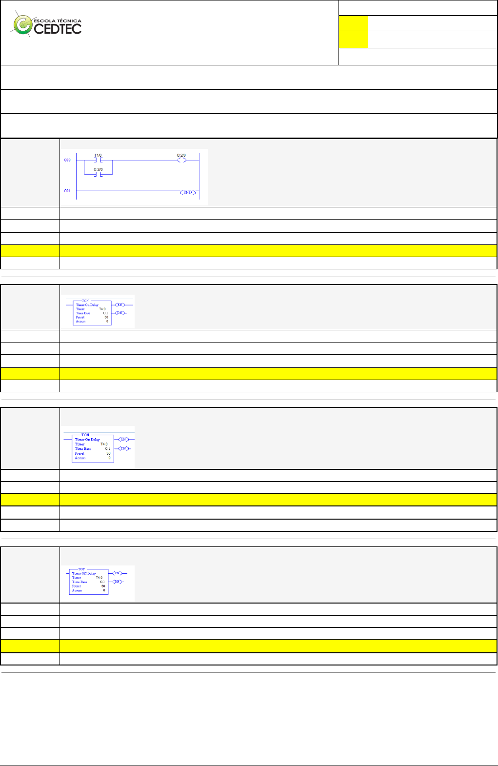 Pincel Atômico - 27/07/2025 09:28:10 1/1 AVERLAN DE ASSIS SALGADO Exercício Caminho do Conhecimento - Etapa 12 (21123) Atividade finalizada em 26/07/2025 23:30:12 (4471471 / 2) LEGENDA Resposta correta na questão # Resposta correta - Questão Anulada X Resposta selecionada pelo Aluno Disciplina: CONTROLADOR LÓGICO PROGRAMÁVEL [1414144] - Avaliação com 4 questões, com o peso total de 13,00 pontos [capítulos - 113] Turma: Curso Técnico: Eletromecânica - Grupo: EAD - 01/25 - EAD ELTM [151437] Aluno(a): 91714912 - AVERLAN DE ASSIS SALGADO - Respondeu 1 questões corretas, obtendo um total de 3,25 pontos como nota [350098_127503] Questão 001 Dado o Ladder abaixo, qual opção corresponde mais fielmente ao comportamento do circuito abaixo? Independente do botão, quando a entrada vinculada a I:1/0 for energizada a saída O:2/0 será desenergizada. X Independente do botão, quando a entrada vinculada a I:1/0 for energizada a saída O:2/0 será energizada. Se for acionado o botão que está sob o endereço I:1/0 a saída O:2/0 desenergizará. Quando a saída O:2/0 for energizada, ela se manterá energizada. Se for acionado o botão que está sob o endereço I:1/0 a saída O:2/0 energizará. [350098_127513] Questão 002 Dado o temporizador a seguir, quanto tempo ele demorará para resetar seu Accum assim que sua entrada for desenergizada? 50 segundos 1 segundos X Ele nunca resetará Accum 0 segundos 5 segundos [350096_127518] Questão 003 Dado o temporizador a seguir, quanto tempo ele demorará para acumular o valor de 1 em Accum assim que sua entrada for desenergizada? 5 segundos 0 segundos Ele nunca acumulará valor algum em Accum X 1 segundos 50 segundos [350097_127519] Questão 004 Dado o temporizador a seguir, quanto tempo ele demorará para acumular o valor de 1 em Accum assim que sua entrada for desenergizada dado que estava energizada anteriormente? Ele nunca acumulará valor algum em Accum 0 segundos 5 segundos X 0.1 segundos 50 segundos