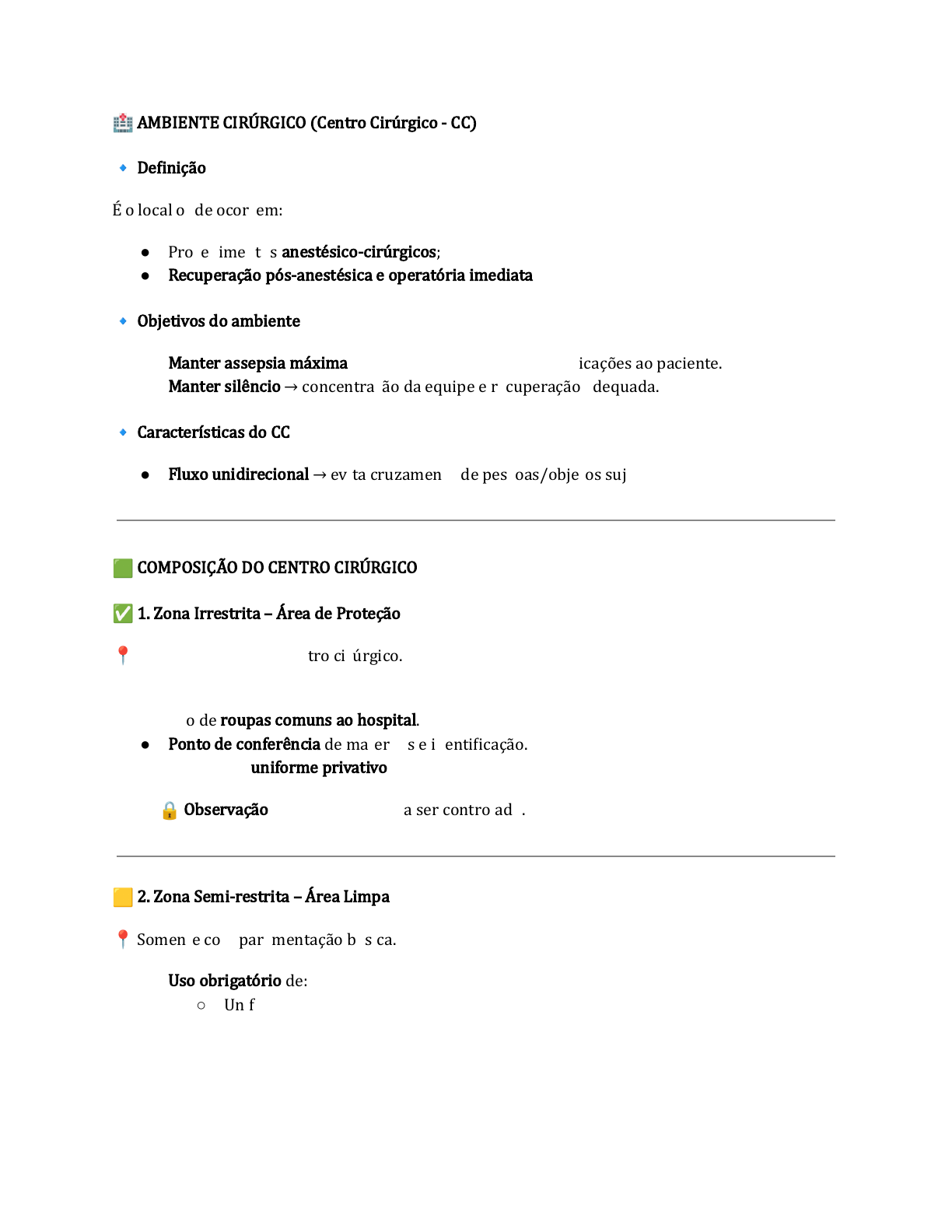 🏥 AMBIENTE CIRÚRGICO (Centro Cirúrgico - CC) 🔹 Definição É o local onde ocorrem: ● Procedimentos anestésico-cirúrgicos; ● Recuperação pós-anestésica e operatória imediata. 🔹 Objetivos do ambiente ● Manter assepsia máxima → evitar contaminação e complicações ao paciente. ● Manter silêncio → concentração da equipe e recuperação adequada. 🔹 Características do CC ● Fluxo unidirecional → evita cruzamento de pessoas/objetos sujos com limpos. 🟩 COMPOSIÇÃO DO CENTRO CIRÚRGICO ✅ 1. Zona Irrestrita – Área de Proteção 📍 Local de entrada ao centro cirúrgico. ● Circulação de pessoas ainda não preparadas. ● Uso de roupas comuns ao hospital. ● Ponto de conferência de materiais e identificação. ● Entrega do uniforme privativo (acesso ao vestiário). 🔒 Observação: acesso já começa a ser controlado. 🟨 2. Zona Semi-restrita – Área Limpa 📍 Somente com paramentação básica. ● Uso obrigatório de: ○ Uniforme privativo, ○ Gorro, ○ Calçados exclusivos ou propés. ● Locais incluídos: ○ Posto de enfermagem; ○ Farmácia satélite; ○ Expurgo (lavagem/embalagem de material); ○ Área de escovação; ○ Salas operatórias; ○ RPA (Recuperação Pós-Anestésica); ○ Repouso do staff e área de conveniência médica. 👣 Circulação permitida apenas para profissionais uniformizados. 🔴 3. Zona Restrita – Circulação restrita 📍 Local mais crítico em termos de esterilidade. ● Uso obrigatório de: ○ Máscara; ○ Gorro; ○ Uniforme privativo. ● Inclui: ○ Salas cirúrgicas (com material exposto); ○ CME (Central de Material e Esterilização). ● Controle rigoroso de pessoas presentes no local. ⚠ Assim que há material exposto → a área se torna oficialmente restrita. 🏥 SALA OPERATÓRIA 🔹 1. Potencial de Contaminação: Baixo ✅ Ações principais (essenciais e indiscutíveis): ● Limpeza rigorosa do ambiente; ● Circulação de ar adequada, com controle de umidade e ventilação. ⚠ Ações secundárias (controversas e com baixo efeito protetor): Só são úteis em cirurgias com implantes, como: ● Ortopedia; ● Cirurgia plástica; ● Cirurgia endovascular. ● Fluxo laminar: entrada e saída de ar por portas diferentes. ● Filtro HEPA: filtro de alta eficiência para partículas → raro no Brasil. ● Ventilação com pressão positiva: impede a entrada de microrganismos do ambiente externo. 🔸Importante: essas tecnologias têm custo elevado e uso limitado no Brasil. 🔹 2. Circulação de Pessoas: Deve ser reduzida 💡 Em hospitais escola: ● Uso de câmeras com circuito fechado e moderador de imagem; ● Transmissão audiovisual ao vivo para estudantes sem a presença física deles na sala. 🚫 Regras de circulação: ● Sem adornos, relógios, bolsas, e celulares no campo estéril; ● Paramentação parcial (gorro + máscara) → para quem estiver na sala mas fora do campo; ● Paramentação total (gorro + máscara + óculos + avental + luvas estéreis) → quem atua diretamente na cirurgia. 🔔 Atenção: Pessoas que não participam da cirurgia podem permanecer no local com paramentação básica, mas quem participa ativamente precisa estar totalmente paramentado. 🔹 3. Campo Cirúrgico – Definição Inclui tudo que está esterilizado e dentro da área operatória: ● Paciente “pintado” com antisséptico (geralmente à base de iodo); ● Campos que cobrem: ○ Mesa de instrumental; ○ Paciente; ○ Avental do cirurgião (capote); ○ Material encamisado (ex: fibra ótica); ○ Campo do Humper → recipiente para lixo com campo estéril. ⚠ Importante: ● Bacia metálica com saco plástico = lixo operatório comum. ● Humper ≠ lixo comum — é considerado parte do campo estéril. ● Protocolo muda se paciente ou cirurgião tiver doença infecto-contagiosa. 🧼 LAVAGEM DAS MÃOS E ANTEBRAÇOS (Degermação Cirúrgica) 🔹 DEFINIÇÃO ● Processo de antissepsia cirúrgica que: ○ Elimina a flora transitória da pele. ○ Reduz a flora residente. ○ Tem efeito bacteriostático (inibe crescimento e movimento bacteriano). 🎯 FINALIDADE ● Evitar contaminação do sítio cirúrgico e de medicamentos/fórmulas durante procedimentos que exijam barreira estéril. RESPONSABILIDADE ● Todos os profissionais diretamente envolvidos em procedimentos cirúrgicos. 🧪 INSUMOS NECESSÁRIOS ● Água corrente (com controle microbiológico semestral). ● Sabão com antisséptico (clorexidina 4% ou PVPI). ● Pia com acionamento sem contato manual (pedal, joelho ou sensor). 📌 INDICAÇÕES ● Antes de procedimentos cirúrgicos ou invasivos: ○ Ex: inserção de cateter, sutura, drenagem de cavidades etc. 🧽 TÉCNICAS ● Fricção com escova apropriada (mais comum); ● Fricção com esponja; ● Fricção sem artefato (validação científica: USP-RP 2011 e EPM 2016 → eficácia equivalente). 🩸 FLORA MICROBIANA DA PELE 🪒 RESUMO – DEGERMAÇÃO 🧼 Degermação Cirúrgica = ➡ Mecânica: escova com cerdas macias ➡ Química: sabão antisséptico (ação germicida e bacteriostática) ⚠ A pele não pode ser totalmente esterilizada sem lesão tecidual. 🧻 SECAGEM DAS MÃOS ● Mãos e braços fletidos à frente do corpo. ● Usar compressa estéril. ● Ordem: mãos → antebraços → cotovelos. ● Nunca retornar a áreas já secas. ● Movimentos compressivos, não de fricção. 📋 LEMBRETES IMPORTANTES ● ❌ Retirar anéis, pulseiras, relógios, esmalte. ● ❌ Nunca usar unhas postiças. ● ✅ Pode usar creme hidratante. ● ❌ Luvas ≠ substituto da higienização. ● ❌ Não usar escovas ásperas/grosseiras. ● ✅ Solução alcoólica friccionada também é válida como técnica de preparo. 🧥 PARAMENTAÇÃO CIRÚRGICA 🎯 Finalidade ● Criar barreira microbiológica: ○ Evita contaminação do paciente por microrganismos do ambiente, equipe ou materiais. ○ Protege o profissional de exposição 