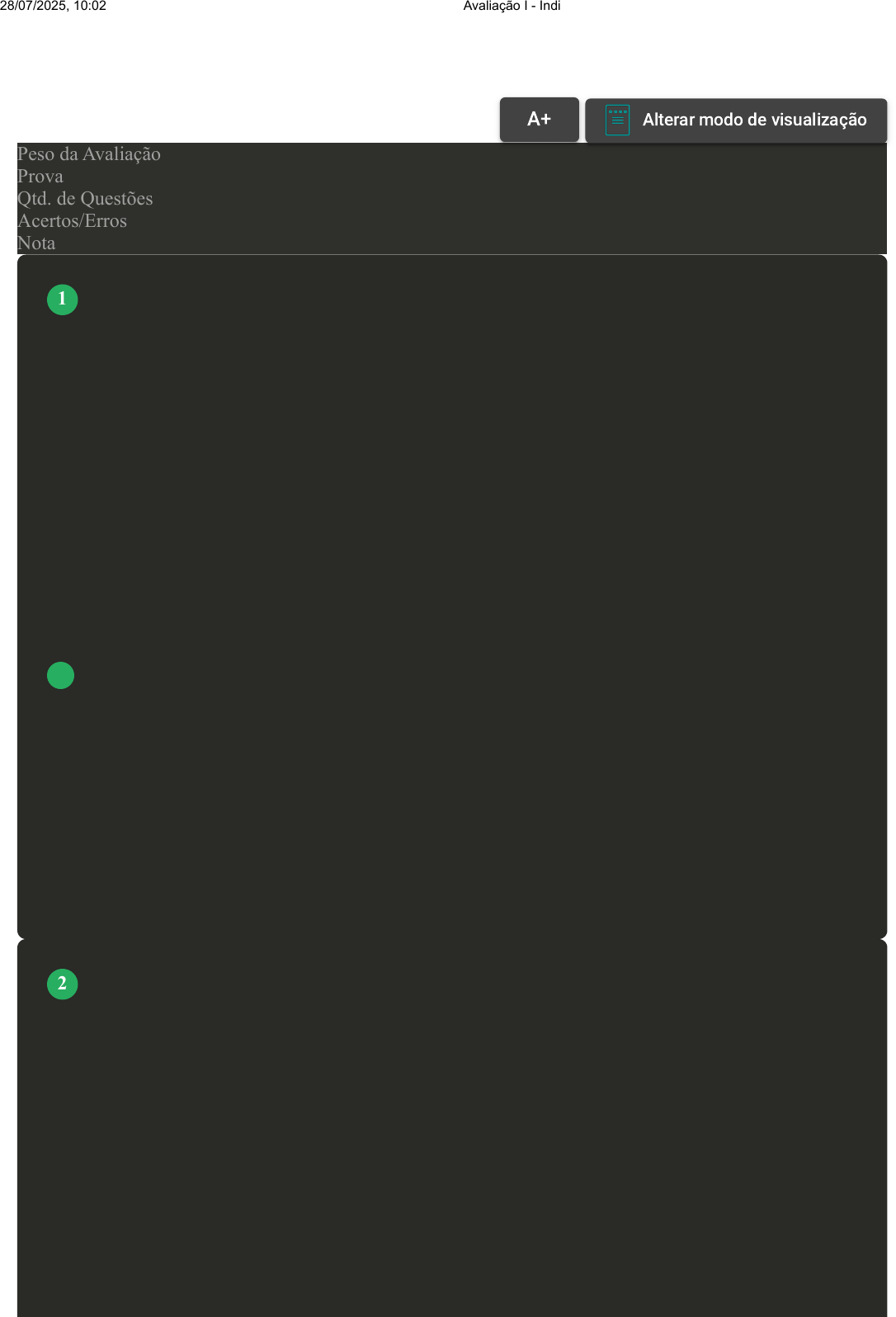 Prova Impressa GABARITO | Avaliação I - Individual (Cod.:1522979) Peso da Avaliação 2,00 Prova 102671014 Qtd. de Questões 10 Acertos/Erros 9/1 Nota 9,00 A biotransformação de fármacos, também conhecida como metabolismo de fármacos, é o processo pelo qual os medicamentos são quimicamente modificados no organismo para produzir metabólitos que podem ser mais facilmente eliminados do corpo. Acerca da biotransformação de fármacos no organismo, analise as afirmativas a seguir: I- Uma das principais características da biotransformação de fármacos é que este processo é independente de enzimas. II- Os fármacos são eliminados do organismo através de dois principais processos: biotransformação e excreção, sendo a biotransformação responsável por alterações químicas que tornam o fármaco mais polar e, consequentemente, mais facilmente excretado. III- A biotransformação, também conhecida como metabolismo, ocorre dentro do organismo e é realizada principalmente no fígado, embora também possa acontecer em outros tecidos do corpo. IV- O objetivo da biotransformação dos fármacos é diminuir sua polaridade, tornando-os mais solúveis em solventes orgânicos, o que facilita sua eliminação através dos rins ou bile, contribuindo assim para a depuração do corpo de substâncias estranhas ou potencialmente tóxicas. Assinale a alternativa que apresenta a sequência CORRETA: A II e III, apenas. B III e IV, apenas. C I, II e III, apenas. D I, III e IV, apenas. E I e IV, apenas. A farmacologia, como ciência que investiga os efeitos dos fármacos nos organismos vivos, é uma área vasta e diversificada. Dentro deste campo, diferentes disciplinas se dedicam a aspectos específicos relacionados aos medicamentos, desde seu desenvolvimento até seu uso em larga escala na população. Uma dessas áreas de estudo é fundamental para compreender os efeitos adversos dos medicamentos, avaliar o equilíbrio entre riscos e benefícios, além de considerar questões econômicas relacionadas ao uso de fármacos. Indique qual das seguintes áreas da farmacologia estuda as reações adversas dos medicamentos, o risco/benefício e custo dos medicamentos numa população. A Farmacocinética B Farmacognosia C VOLTAR A+ Alterar modo de visualização 1 2 28/07/2025, 10:02 Avaliação I - Individual about:blank 1/5 Farmacoterapia D Farmacoepidemiologia E Farmacodinâmica As características de absorção de medicamentos referem-se a uma série de fatores que influenciam a capacidade do corpo de absorver uma substância após a sua administração. Esses fatores podem variar dependendo da via de administração utilizada e das propriedades do próprio medicamento. Acerca do processo farmacocinético da absorção, analise as afirmativas a seguir: I- A absorção é o processo de transferência de um fármaco do local de administração para a corrente sanguínea, e sua eficácia e velocidade variam de acordo com a via de administração utilizada. II- A administração intravenosa (I.V) garante que toda a dose do fármaco atinja diretamente a circulação sistêmica, enquanto outras vias podem resultar em absorção parcial, reduzindo a biodisponibilidade. III- A absorção oral requer que o fármaco se dissolva nos líquidos do trato gastrointestinal e atravesse as células epiteliais da mucosa intestinal, processo que pode ser afetado por condições como doenças ou a presença de alimentos, influenciando assim a absorção do medicamento. IV- Independentemente da via de administração ou forma farmacêutica, todos os medicamentos serão absorvidos em pelo menos 50% pelo organismo, uma vez exposto a este. Assinale a alternativa que apresenta a sequência CORRETA: A I, II e III, apenas. B III e IV, apenas. C II e III, apenas. D I e IV, apenas. E I, III e IV, apenas. Os perigos dos efeitos idiossincrásicos farmacológicos residem principalmente na imprevisibilidade e na dificuldade de identificação prévia dessas reações. Como não há uma relação clara entre a dose do medicamento e a gravidade da reação, pode ser difícil prever quem está em maior risco. Indique qual é a principal característica dos efeitos idiossincrásicos na farmacologia. A São reações adversas raras, inesperadas e inexplicáveis após o uso do fármaco. B São reações adversas raras, esperadas e explicáveis após o uso do fármaco. C São reações adversas comuns, causadas especificamente por fármacos antidepressivos. D São reações adversas comuns, inesperadas e explicáveis após o uso do fármaco. E São reações adversas comuns, esperadas e explicáveis após o uso do fármaco. 3 4 28/07/2025, 10:02 Avaliação I - Individual about:blank 2/5 O sistema nervoso autônomo é capaz de controlar mecanismos básicos para a sobrevivência, como a respiração, circulação sanguínea, controle de temperatura e digestão. Além disso, esta parte do sistema nervoso ainda controla a resposta do organismo a estímulos externos. A respeito do sistema nervoso autônomo, analise as afirmativas a seguir: I- Dentre os principais processos de regulação deste sistema estão a contração e o relaxamento da musculatura lisa de vasos e vísceras; as secreções exócrinas e algumas endócrinas; os batimentos cardíacos; e o metabolismo energético. II- Possui dois tipos de neurônios, o pré-autonômico e o pós-autonômico. III- Os dois principais neurotransmissores que atuam no sistema autônomo são a acetilcolina e a norepinefrina ou noradrenalina. IV- Normalmente, os neurotransmissores são produzidos e armazenados em vesículas no corpo da célula neuronal que, posteriormente, são liberadas na fenda sináptica pelo processo de exocitose. Assinale a alternativa CORRETA: A I e IV, apenas. B III e IV, apenas. C II e III, apenas. D I, III e IV, apenas. E I, II e III, apenas. A distribuição de fármacos no organismo é o processo pelo qual os medicamentos se espalham pelos diferentes tecidos e fluido