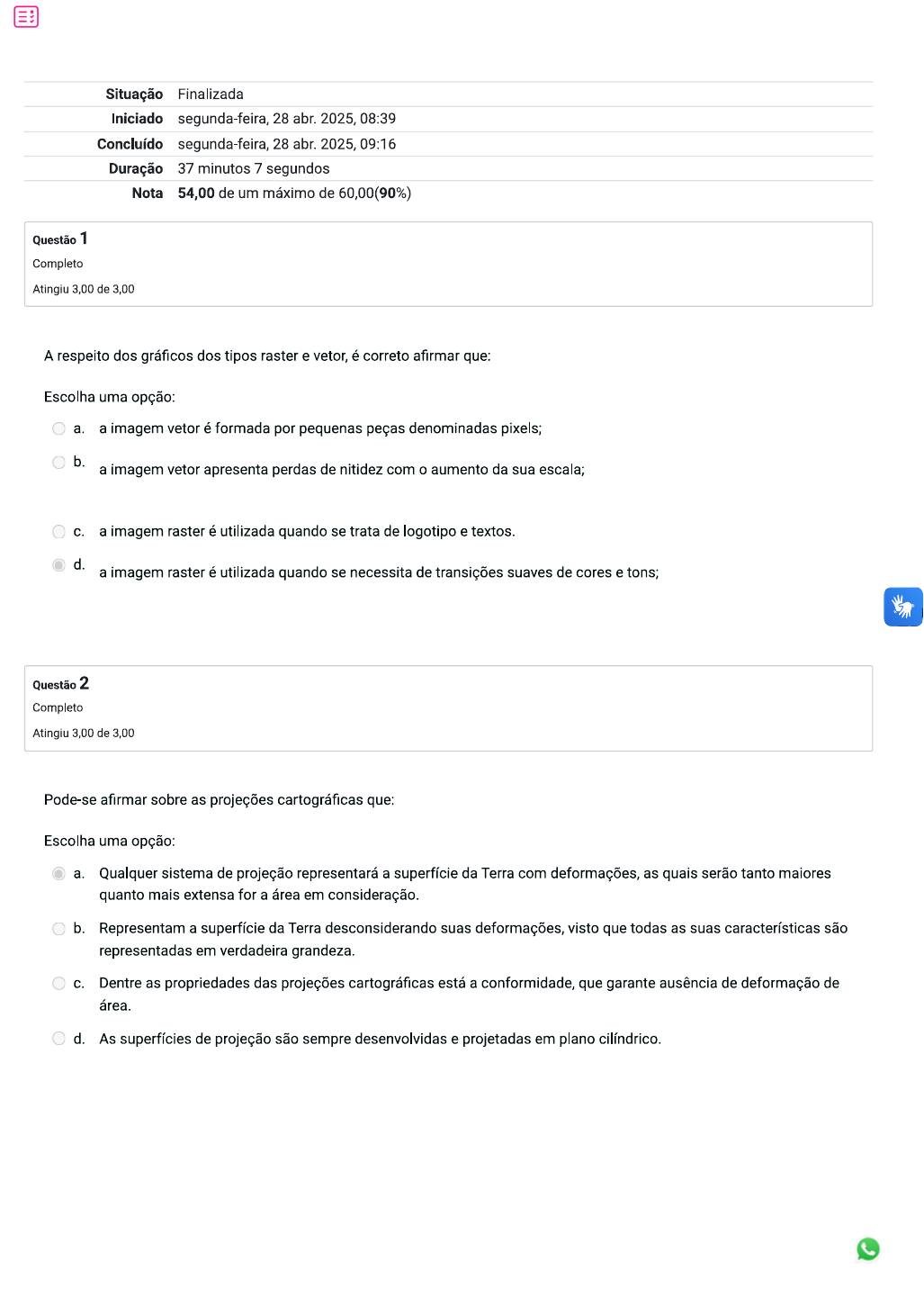 Situação Finalizada Iniciado segunda-feira, 28 abr. 2025, 08:39 Concluído segunda-feira, 28 abr. 2025, 09:16 Duração 37 minutos 7 segundos Nota 54,00 de um máximo de 60,00(90%) Questão 1 Completo Atingiu 3,00 de 3,00 A respeito dos gráficos dos tipos raster e vetor, é correto afirmar que: Escolha uma opção: a. a imagem vetor é formada por pequenas peças denominadas pixels; b. a imagem vetor apresenta perdas de nitidez com o aumento da sua escala; a imagem raster é utilizada quando se trata de logotipo e textos. d. a imagem raster é utilizada quando se necessita de transições suaves de cores e tons; Questão 2 Completo Atingiu 3,00 de 3,00 Pode-se afirmar sobre as projeções cartográficas que: Escolha uma opção: a. Qualquer sistema de projeção representará a superfície da Terra com deformações, as quais serão tanto maiores quanto mais extensa for a área em consideração. b. Representam a superfície da Terra desconsiderando suas deformações, visto que todas as suas características são representadas em verdadeira grandeza. Dentre as propriedades das projeções cartográficas está a conformidade, que garante ausência de deformação de área. d. As superfícies de projeção são sempre desenvolvidas e projetadas em plano cilíndrico.Questão 3 Completo Atingiu 3,00 de 3,00 0 Google Earth Pro é um programa que apresenta modelo tridimensional do globo terrestre, construído a partir de imagens de satélite. Seu ambiente é bastante intuitivo e por isso se popularizou. Porém, esse programa também é utilizado profissionalmente, pois interage com diversos programas de geoprocessamento, como o ArcGis e o QGIS. Para isso, é preciso conhecer seu sistema de referência geodésico, que é o: Escolha uma opção: a. World Geodesic System 84. b. Córrego Alegre. South America Datum 69. d. SIRGAS 2000. Questão 4 Completo Atingiu 0,00 de 3,00 Uma característica do sistema de coordenadas UTM - Universal Transversa de Mercator é: Escolha uma opção: a. não acompanhar a curvatura da Terra. b. admitir coordenadas positivas e negativas. a representação da superfície da Terra por 120 fusos. d. que cada fuso tem a amplitude de de longitude. Questão 5 Completo Atingiu 0,00 de 3,00 Os satélites transmitem sinais de GPS em duas frequências da banda L. Sobre os sinais: Escolha uma opção: a. o L1 é modulado em um único código. b. o L2 é modulado em dois códigos: um disponível para o público e outro de uso militar. o L1 é modulado em dois códigos: um disponível para o público e outro de uso militar. d. a frequência das bandas L1 e L2 é a mesma.Questão 6 Completo Atingiu 3,00 de 3,00 As principais características de Sistemas de Informação Geográfica são: I. Integrar, numa única base de dados, informações espaciais provenientes de dados cartográficos, dados de censo e cadastro urbano e rural, imagens de satélite, redes e modelos numéricos de terreno. II. Combinar as várias informações, através de algoritmos de manipulação, para gerar mapeamentos derivados. III. Consultar, recuperar, visualizar e plotar o conteúdo da base de dados geocodificados. Assinale a sequência correta: Escolha uma opção: a. Apenas a assertiva III está correta. b. Apenas as assertivas e estão corretas. As assertivas I, e III estão corretas. d. Apenas as assertivas e III estão corretas. Questão 7 Completo Atingiu 3,00 de 3,00 Neste tipo de modelo, existe uma matriz de células às quais estão associados valores que possibilitam reconhecer o objeto sob a forma de uma imagem. Cada pixel representa uma área no terreno e apresenta um valor, objeto ou condição que é encontrado na localização, bem como valores que definem número da coluna e da linha, correspondendo às coordenadas X e y. Assinale a alternativa correspondente ao formato de arquivo empregado em Sistema de Informação Geográfica (SIG) descrito no texto, de forma correta. Escolha uma opção: a. Modelo raster b. Modelo vetorial Modelo pontual d. Modelo linear Questão 8 Completo Atingiu 3,00 de 3,00 A finalidade principal e genérica da tecnologia GIS é: Escolha uma opção: a. contribuir para análises geo-econômicas. b. prover apoio para o processo decisório associado ao uso de dados espaciais. estabelecer georreferenciamento de dados geográficos. d. executar tarefas de apoio à cartografia digital.Questão 9 Completo Atingiu 3,00 de 3,00 0 Sistema de Navegação Global por Satélite (GNSS Global Navigation Satellite System) tem sido utilizado cada vez mais por diferentes usuários e para distintas finalidades. A ampliação desse sistema envolve novas constelações, equipamentos e metodologias. São constelações de satélites GNSS disponíveis: Escolha uma opção: a. GPS (EUA), WAAS (Alemanha) e GLONASS (Rússia). b. GPS (EUA), GALILEU (Europa), GLONASS (Rússia) e COMPASS (China). GALILEU (Europa), GLONASS (Rússia), NAVSTAR (Reino Unido) e SBAS (Alemanha). d. GPS (EUA), GALILEU (Europa), GLONASS (Rússia), BEIDOU (China) e NAVSTAR (Reino Unido). Questão 10 Completo Atingiu 3,00 de 3,00 A coleta de dados para o Geoprocessamento pode ser efetuada de diversas maneiras, por exemplo, a partir de: (1) mapas; (2) fotos aéreas; (3) tabelas; e (4) imagens de satélite. Qual alternativa corresponde, respectivamente, à ciência ou tecnologia utilizada na coleta desses dados? Escolha uma opção: a. (1) Dados alfanuméricos; (2) Fotogrametria; (3) Cartografia; (4) Sensoriamento Remoto. b. (1) Cartografia; (2) Fotogrametria; (3) Dados alfanuméricos; (4) Processamento Digital de Imagens. (1) Cartografia; (2) Fotogrametria; (3) Dados alfanuméricos; (4) Sensoriamento Remoto. d. (1) Cartografia; (2) Sensoriamento Remoto; (3) Fotogrametria; (4) Dados alfanuméricos. Questão 11 Completo Atingiu 3,00 de 3,00 São propriedades das projeções cartográficas: Escolha uma opção: a. Conformidade, equivalência e equidistância b. Representatividade, acurácia e normalidade Transversalidade,