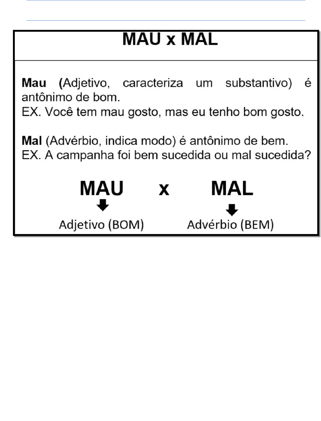LÍNGUA PORTUGUESA – 5º ANO 1 - Complete as frases abaixo com mau ou mal. a) Luana agiu _________. b) Bianca foi _________ na prova. c) João jogou muito ___________. d) Camila passou ____________ na escola. e) O lobo é __________. f) Hoje estou de ___________ humor. g) A mãe de Gael dirige muito ____________. h) Foi um ____________ negócio comprar aquele carro. 2 - Leia com atenção as afirmações abaixo e marque (V) para verdadeiro e (F) para falso. ( ) A palavra mal é usada quando queremos dizer o contrário de bem. ( ) A palavra mau é usada quando queremos dizer o contrário de ruim. ( ) Na frase “Ele acordou de mau humor”, a palavra está sendo usada corretamente. ( ) Podemos trocar “mau” por “bem” em qualquer frase. ( ) “O menino se comportou mal na escola” está correta, pois o contrário de se comportar bem é se comportar mal. ( ) A palavra mau é um adjetivo e dá características a alguém ou algo. ( ) Na frase “O cachorro estava com mal cheiro”, a palavra “mal” está errada. 3- Explique a diferença entre mal e mau? ________________________________________________________________________________________________________________________ 4- Escreva duas frases: uma com a palavra mal e outra com a palavra mau. ________________________________________________________________________________________________________________________________________________________________________________________________________________________________________________ image1.png