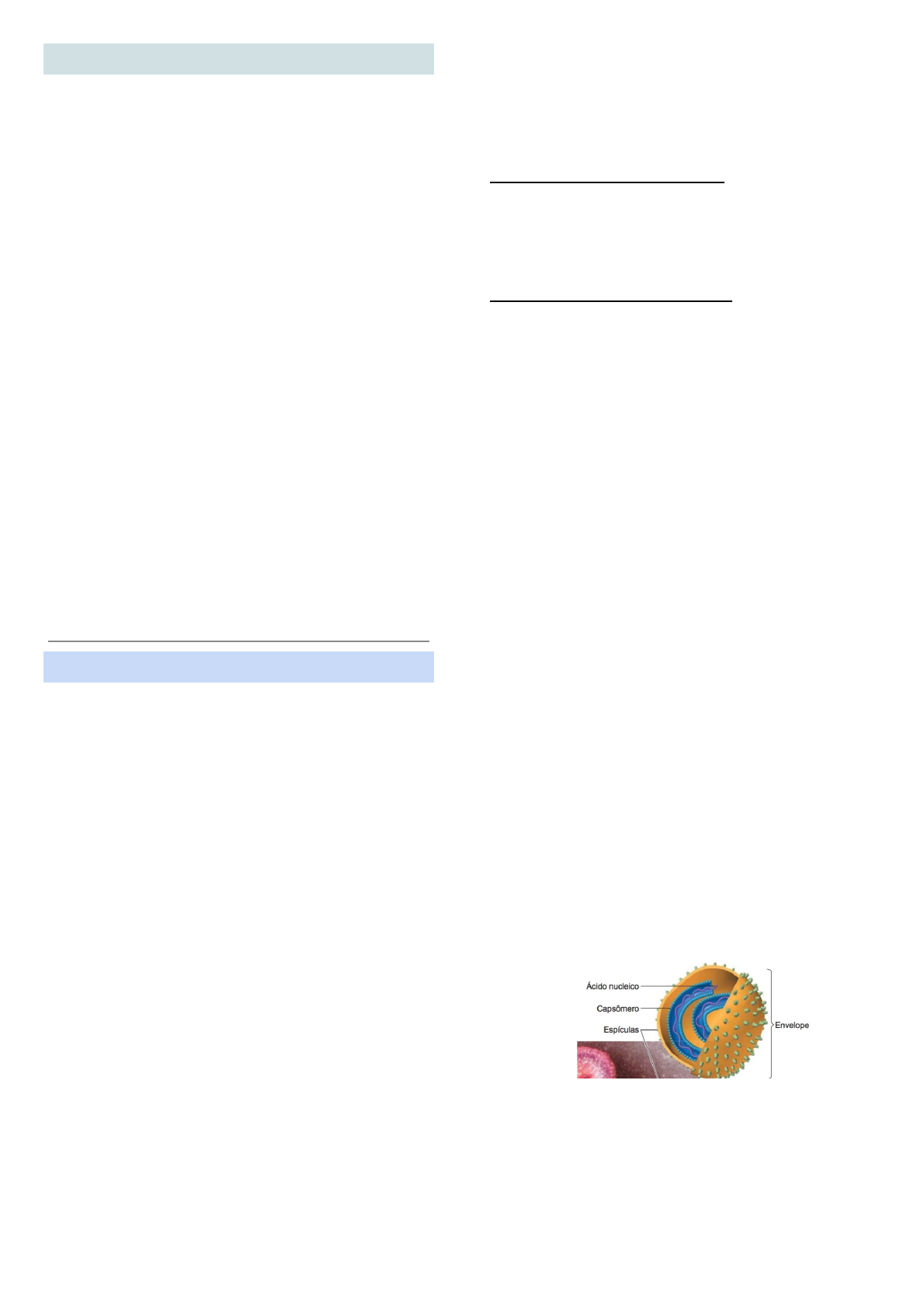 VÍRUS E IMUNIDADE GERAIS -> Não pertencem a nenhum reino; -> Parasitas intracelulares obrigatórios: Isso significa que eles precisam de uma célula hospedeira para se multiplicar. Sem uma célula, os vírus não conseguem realizar suas funções vitais; ->Acelulares: Não possuem a estrutura celular típica de outros organismos vivos, como bactérias ou células humanas. ->Possuem proteínas específicas que determina qual tipo de virus irá infectar (bacteriófago, macrófago). ->Tamanhos: Variam de 20 a 300 nanômetros, sendo menores que bactérias. ->Formas: Podem ser helicoidais (como o vírus do mosaico do tabaco), icosaédricos (como adenovírus), ou complexos (como bacteriófagos). -> Muito mutáveis por possuirem genomas menores e mais simples, o que significa menos mecanismos de reparo de erros durante a replicação. como a exonuclease. -> Conte ̂m um revestimento proteico (a ̀s vezes um envelope de lipi ́deos, protei ́nas e carb) que envolve o a ́c nuc. ESTRUTURA Vírion: partícula viral infecciosa composta por um ác. nucléico envolto por revestimento proteico. É a forma completa, funcional e infecciosa de um vírus quando ele está fora de uma célula hospedeira, porém inativo pois não realiza atividades metabólicas, como síntese de proteínas ou produção de energia. 1. MATERIAL GENÉTICO: -> Os vírus podem possuir DNA ou RNA, nunca os dois juntos. Tanto o DNA quanto RNA podem ser de fita simples ou dupla. 1. DNA (Ácido Desoxirribonucleico) - Vírus de DNA de fita dupla (dsDNA): Dupla-hélice. é replicado no núcleo da célula hospedeira (no caso de muitos vírus eucarióticos) ou no citoplasma (no caso de alguns vírus bacterianos). A replicação viral é mediada pela DNA polimerase da célula hospedeira. Ex: Herpes virus simples (HSV-1 e HSV-2) , Papilomavírus humano (HPV) - Vírus de DNA de fita simples (ssDNA): Composto por uma única cadeia q é complementada por uma cópia complementar de fita simples dentro da célula hospedeira, formando uma estrutura de fita dupla temporária durante a replicação viral, que depois é utilizada para gerar mais partículas virais. Ex: Parvovírus 2. RNA (Ácido Ribonucleico) - Vírus de RNA de fita simples (ssRNA): - Sentido positivo (+ssRNA): O RNA funciona diretamente como mRNA e pode ser traduzido imediatamente pelos ribossomos da célula hospedeira. Exemplos incluem os coronavírus (como o SARS-CoV-2) e o Dengue Virus. - Sentido negativo (-ssRNA): O RNA viral é complementar ao mRNA e precisa ser transcrito para formar mRNA antes de ser traduzido. Exemplos incluem o Influenza e o Ebolavirus. - Vírus de RNA de fita dupla (dsRNA): O genoma consiste em duas fitas de RNA. Este tipo de vírus geralmente tem uma enzima chamada RNA dependente de RNA polimerase para replicar seu genoma. Exemplos incluem o Rotavirus. - Retrovírus (Grupo VI - RNA com intermediário de DNA): utilizam a enzima transcriptase reversa para converter seu RNA em DNA. HIV obs: Segmentação: Em alguns vírus, o genoma é segmentado, o que significa que o material genético está dividido em vários fragmentos distintos. vírus influenza, rotavírus possuem genoma de RNA segmentado. 2. CAPSÍDEO ● Definição: Estrutura proteica que envolve e protege o material genético viral. ● Composição: Composto por subunidades proteicas chamadas capsômeros. ● Formas: As principais formas são icosaédrica (quase esférica), helicoidal (em forma de bastão ou filamento) e complexa (mistura de ambas, como nos bacteriófagos). 3. ENVELOPE VIRAL (Opcional): - Membrana de lipoproteína composta por lipídeos derivados da membrana celular do hospedeiro e por proteínas que são vírus-específicas. - Muitas vezes há glicoproteínas na forma de projeções similares a espículas na superfície, que se ligam a receptores da célula hospedeira durante a entrada do vírus na célula. OBS: A capacidade de determinados vírus, como o influenza, de agregar hemácias está associada à presença das espículas. se ligam as hemácias, formando pontes entre eles. A agregação resultante, chamada de hemaglutinação, é a base de diversos testes laboratoriais úteis. O vírus influenza frequentemente sofre alterações em suas espículas. É por essa razão que se contrai gripe mais de uma vez. Apesar de termos produzido anticorpos contra um subtipo de vírus da gripe, se ele sofrer mutações pode nos infectar novamente. - Proteína de matriz: medeia a interação entre proteínas do capsídeo e o envelope. (p17) no HIV conecta o nucleocapsídeo ao envelope e ajuda na montagem e liberação do vírus. - Envelope viral é adquirido enquanto o vírus sai da célula por meio de um processo denominado “brotamento” . O envelope da maioria dos vírus é derivado da membrana externa celular, com a exceção dos herpes-vírus, que obtêm seu envelope a partir da membrana nuclear da célula. - A presença de um envelope confere instabilidade ao vírus. Vírus envelopados são mais sensíveis ao calor, dessecamento, detergentes e solventes lipídicos, como álcool e éter, do que os vírus com nucleocapsídeo não envelopado, que são compostos apenas por ácido nucleico e proteínas do capsídeo. - as proteínas de superfície dos vírus, sejam proteínas do capsídeo ou glicoproteínas do envelope, são os principais antígenos contra os quais o hospedeiro monta sua resposta imune contra o vírus. Elas também são determinantes de especificidade de tipo (frequentemente chamado de sorotipo) TIPOS DE VÍRUS 1. CLASSIFICAÇÃO PELO MATERIAL GENÉTICO: ● Vírus de DNA: -Exemplos: Adenovírus, Herpesvírus. -Características: Podem ter DNA de fita dupla (dsDNA) ou fita simples (ssDNA). O DNA pode ser linear ou circular. ● Vírus de RNA: -Exemplos: Coronavírus, Influenza, HIV. -Características: Podem ter RNA de fita simples (ssRNA) ou fita dupla (dsRNA). O RNA pode ser de sentido positivo (+) (funciona diretamente como mRNA) ou negativo (-) (precisa ser trans