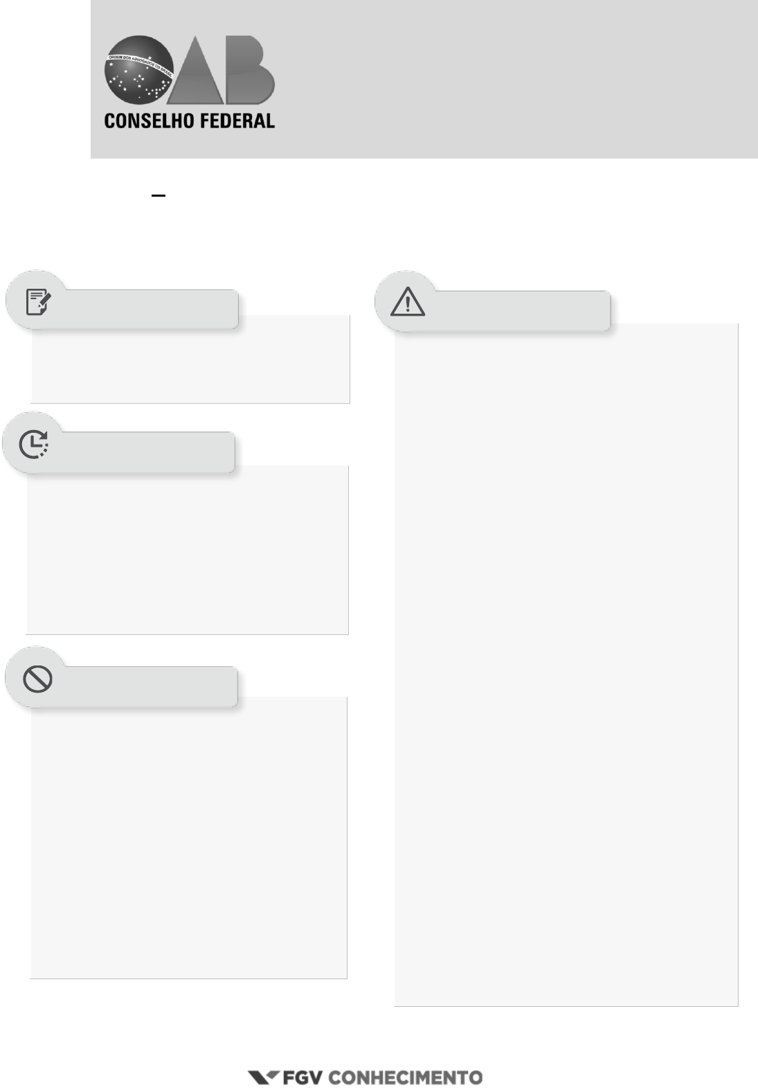 “Qualquer semelhança nominal e/ou situacional presente nos enunciados das questões é mera coincidência” Ordem dos Advogados do Brasil 43O EXAME DE ORDEM UNIFICADO TIPO 1 – BRANCA • Além deste caderno contendo 80 (oitenta) questões objetivas e o questionário de percepção sobre a prova com 10 (dez) itens, você receberá do fiscal de sala a folha destinada às respostas das questões objetivas. • • Verifique se o tipo/cor de prova corresponde ao registrado em sua folha de respostas. Caso contrário, informe imediatamente o fiscal da sala para o devido registro na ata de aplicação. A ausência de registro deste fato acarretará a correção da prova conforme o tipo/cor constante na folha de respostas, não cabendo reclamações posteriores nesse sentido. • Confira seus dados pessoais, especialmente nome, número de inscrição e documento de identidade e leia atentamente as instruções para preencher a folha de respostas. • Assinale seu nome, no espaço reservado, com caneta esferográfica transparente de cor azul ou preta. • Em hipótese alguma haverá substituição da folha de respostas por erro do examinando. • Reserve tempo suficiente para o preenchimento da sua folha de respostas. Para fins de avaliação, serão levadas em consideração apenas as marcações realizadas na folha de respostas. • A FGV realizará identificação datiloscópica de todos os examinandos. A identificação datiloscópica compreenderá a coleta das impressões digitais dos examinandos em formulário próprio. • Ao terminar a prova, você deverá, obrigatoriamente, entregar a folha de respostas devidamente preenchida e assinada ao fiscal da sala. O examinando que descumprir a regra de entrega de tal documento será eliminado. • Os 3 (três) últimos examinandos de cada sala só poderão sair juntos, após entregarem ao fiscal de aplicação os documentos que serão utilizados na correção das provas. Caso algum desses examinandos insista em sair do local de aplicação antes de autorizado pelo fiscal de aplicação, deverá assinar termo desistindo do exame e, caso se negue, será lavrado Termo de Ocorrência, testemunhado pelos 2 (dois) outros examinandos, pelo fiscal de aplicação da sala e pelo coordenador da unidade de provas. • Esses 3 (três) examinandos, caso queiram, poderão acompanhar o procedimento de conferência da documentação da sala de aplicação, que será realizado pelo coordenador da unidade, na coordenação do local de provas. • 5 (cinco) horas é o tempo disponível para a realização da prova, já incluindo o tempo para a marcação da folha de respostas da prova objetiva. • 2 (duas) horas após o início da prova será possível retirar-se da sala, sem levar o caderno de prova. • 1 (uma) hora antes do término do período de prova será possível retirar-se da sala levando o caderno de questões. • Qualquer tipo de comunicação entre os examinandos. • Levantar da cadeira sem a devida autorização do fiscal de sala. • Portar aparelhos eletrônicos, tais como bipe, walkman, agenda eletrônica, notebook, netbook, palmtop, receptor, gravador, telefone celular, máquina fotográfica, protetor auricular, MP3, MP4, controle de alarme de carro, pendrive, fones de ouvido, Ipad, Ipod, Iphone, etc., bem como relógio de qualquer espécie, óculos escuros ou quaisquer acessórios de chapelaria, tais como chapéu, boné, gorro etc., e, ainda, lápis, lapiseira, borracha e/ou corretivo de qualquer espécie. • Usar o sanitário ao término da prova, após deixar a sala. SUA PROVA TEMPO NÃO SERÁ PERMITIDO INFORMAÇÕES GERAIS 43o EXAME DO ORDEM UNIFICADO Tipo Branca – Página 3 1 O advogado Antônio comenta em matérias veiculadas em página da internet, consistente em sítio eletrônico especializado em publicar artigos acadêmicos e jurídicos, novas leis que são sancionadas e faz explicações de fácil compreensão de conceitos e normas jurídicas. De acordo com o disposto no Código de Ética e Disciplina da OAB, assinale a afirmativa correta. (A) É autorizado que Antônio responda às consultas jurídicas com habitualidade na página mencionada para promoção pessoal. (B) É vedado que Antônio mencione seu e-mail e telefone na mencionada página, assim como o nome do escritório onde trabalha. (C) Antônio não poderá fornecer, nas matérias que publica, seus meios de contato, tais como endereço e telefone, mas é permitida a referência a e-mail. (D) Não é vedado que Antônio, ao comentar a atuação de colegas advogados em tais feitos, cite casos emblemáticos para a explicação de tais normas e conceitos. 2 Paulo Afrânio foi representado ao Tribunal de Ética e Disciplina do Conselho Seccional do Estado Alfa pela prática da infração disciplinar de violar, sem justa causa, sigilo profissional. Com o recebimento da representação, o Presidente designou relator, a quem competiu instruir o processo e oferecer parecer preliminar submetido ao Tribunal de Ética e Disciplina. Por se tratar de infração leve, o relator dispensou as etapas de defesa prévia e razões finais, garantindo ao representado apenas a defesa oral. Ao final, o relator ofereceu parecer preliminar no sentido da aplicação da pena de censura, submetido ao Tribunal de Ética e Disciplina que, acolhendo a proposta, aplicou a referida sanção ao advogado Paulo Afrânio. Sobre o processo disciplinar no âmbito da OAB, assinale a afirmativa correta. (A) O procedimento adotado pelo relator foi correto, porque a legislação prevê que a defesa oral, por ser mais ampla e contundente, substitui a etapa de defesa prévia e a apresentação de razões finais. (B) Nos casos de parecer preliminar do relator recomendando a aplicação de pena de censura, o Presidente do Conselho Seccional pode, desde logo, diante da baixa gravidade da pena aplicada, homologar o parecer, aplicando essa sanção. (C) A condução do processo disciplinar pelo relator foi ilegal, 