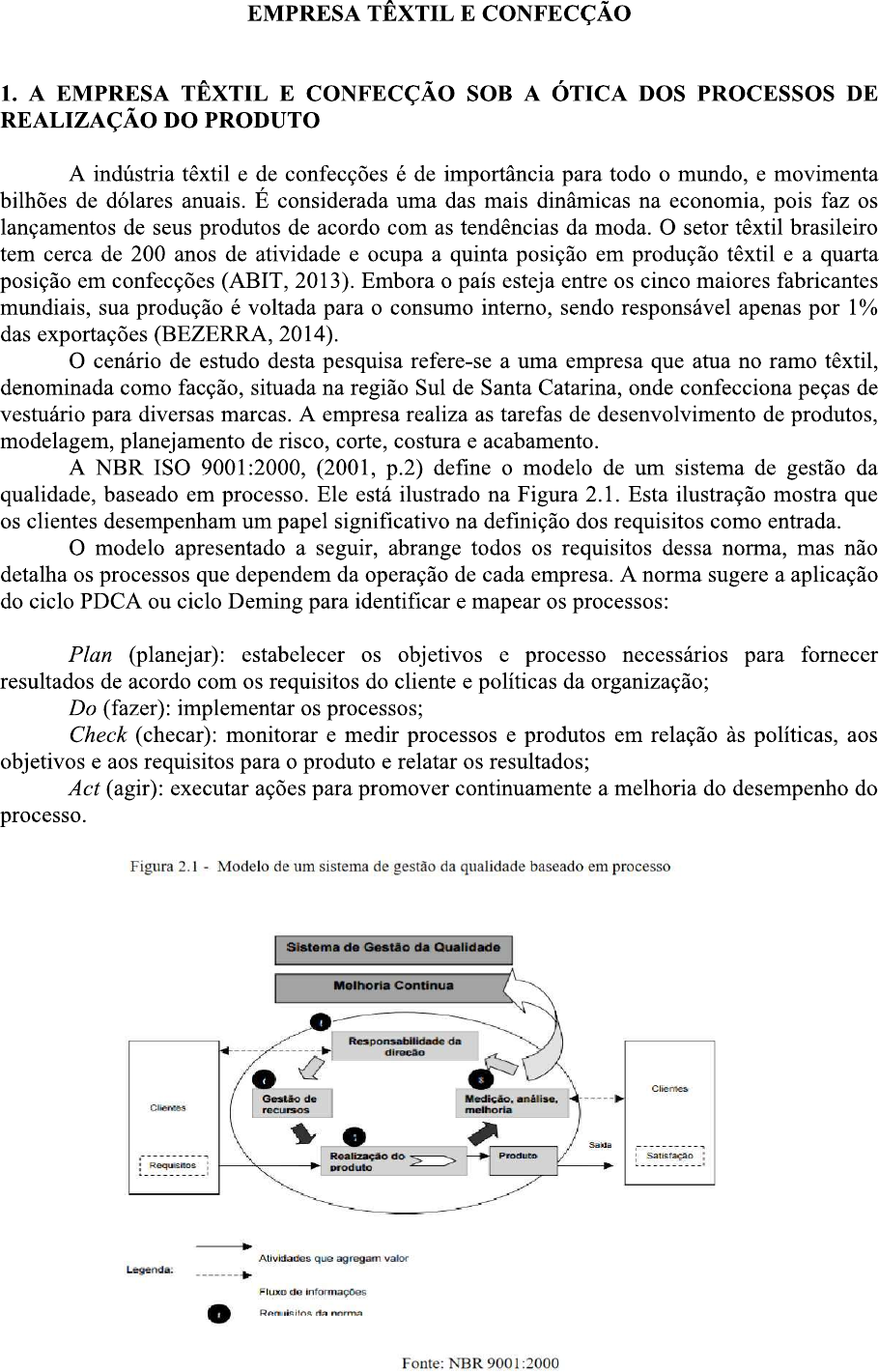 EMPRESA TÊXTIL E CONFECÇÃO 1. A EMPRESA TÊXTIL E CONFECÇÃO SOB A ÓTICA DOS PROCESSOS DE REALIZAÇÃO DO PRODUTO A indústria têxtil e de confecções é de importância para todo o mundo, e movimenta bilhões de dólares anuais. É considerada uma das mais dinâmicas na economia, pois faz os lançamentos de seus produtos de acordo com as tendências da moda. O setor têxtil brasileiro tem cerca de 200 anos de atividade e ocupa a quinta posição em produção têxtil e a quarta posição em confecções (ABIT, 2013). Embora o país esteja entre os cinco maiores fabricantes mundiais, sua produção é voltada para o consumo interno, sendo responsável apenas por 1% das exportações (BEZERRA, 2014). O cenário de estudo desta pesquisa refere-se a uma empresa que atua no ramo têxtil, denominada como situada na região Sul de Santa Catarina, onde confecciona peças de vestuário para diversas marcas. A empresa realiza as tarefas de desenvolvimento de produtos, modelagem, planejamento de risco, corte, costura e acabamento. A NBR ISO 9001:2000, (2001, p.2) define o modelo de um sistema de gestão da qualidade, baseado em processo. Ele está ilustrado na Figura 2.1. Esta ilustração mostra que os clientes desempenham um papel significativo na definição dos requisitos como entrada. O modelo apresentado a seguir, abrange todos os requisitos dessa norma, mas não detalha os processos que dependem da operação de cada empresa. A norma sugere a aplicação do ciclo PDCA ou ciclo Deming para identificar e mapear os processos: Plan (planejar): estabelecer os objetivos e processo necessários para fornecer resultados de acordo com os requisitos do cliente e políticas da organização; Do (fazer): implementar os processos; Check (checar): monitorar e medir processos e produtos em relação às políticas, aos objetivos e aos requisitos para o produto e relatar os resultados; Act (agir): executar ações para promover continuamente a melhoria do desempenho do processo. Figura 2.1 Modelo de um sistema de gestão da qualidade baseado em processo Sistema de Gestão da Qualidade Melhoria Continua Responsabilidade da direção Clientes Gestão de Medição, análise, Clientes recursos melhoria : Saida Realização do Produto Satisfação Requisitos produto Atividades que agregam valor Legenda: Fluxo de informações Requisitos da norma Fonte: NBR 9001:2000A utilização do Ciclo PDCA envolve várias possibilidades, podendo ser utilizado para o estabelecimento de metas de melhoria provindas da alta administração, ou também de pessoas ligadas diretamente ao setor operacional, com o objetivo de coordenar esforços de melhoria contínua, enfatizando que cada programa de melhoria deve começar com um planejamento cuidadoso (definir uma meta), resultar em ações efetivas, em comprovação da eficácia das ações para, enfim, obter os resultados da melhoria, podendo ser reutilizado a cada melhoria vislumbrada. SEÇÃO 7 DA ISO 9001:2000 REALIZAÇÃO DO PRODUTO Essa seção estabelece os requisitos para os processos de realização do produto, sendo que os processos produtivos da Fiscalização e Elaboração dos relatórios Anuais são identificados e planejados de modo a assegurar que todas as atividades sejam realizadas e verificadas sob condições controladas, abrangendo a determinação dos Objetivos da Qualidade e requisitos para os produtos, bem como a definição dos métodos de trabalho e dos critérios de execução necessários para garantir os requisitos especificados no SGQ descrito no Manual da Qualidade. IMPLEMENTAÇÃO DE UM SISTEMA DE GESTÃO DA QUALIDADE (ISO 9001:2000) ETAPAS DESAFIOS Elaborar um diagnóstico de 1° Formar um grupo de trabalho multidisciplinar, para várias áreas funcionais de serviço / nesta fase, elaborar / desenhar um modelo normativo área. para todas as áreas (do serviço) onde a norma de referência possa ser aplicável. Elaborar um plano de trabalho, 2° Assumir todas as responsabilidades partilhadas com a classificando as ações a atividade diária, perante um determinado prazo. desenvolver, como prioritárias e normais. Eleger responsáveis dentro do grupo para cada uma das ações. Estipular prazos para o seu completo cumprimento. Estruturar e implementar 3° Questionar a organização existente. procedimentos com os modelos Quebrar o "status-quo" dominante adequados à organização. Ter o cuidados de não mudar o que está correto ( a implementação do sistema só faz sentido, se acrescentar valor ao sistema existente desde que funcional4ª Fazer uma avaliação do modelo 4° Convidar elementos externos ao grupo, para criticar elaborado, desenhado e os modelos implementados, e principalmente para implementado analisar a normativa do procedimento e respectivo conteúdo, bem como a sua adaptabilidade à atividade diária do serviço / área. Aceitar discutir todas as propostas de melhoria daqui resultantes. Elaborar um plano para 5° Aceitar e assumir que os procedimentos implementar as propostas de anteriormente definidos e implementados, estavam melhoria entretanto aceites pelo incorretos, ou necessitavam realmente de melhorias grupo. Conseguir manter o dinamismo e entusiasmo Implementar ações corretivas ao necessários por parte dos participantes, para a modelo. implementação do sistema de gestão da qualidade. Elaborar e estruturar o plano de 6° Interiorizar e assimilar este processo como dinâmico, melhoria a efetuar. em melhoria constante. Cumpre-se assim uma metodologia "PDCA" Plan-do Etapas 1 e 2 (diagnóstico e plano de ação) check-act Etapa 3 (manual de procedimentos) (Planejar, Fazer, Etapa 4 (auditorias) Verificar e Agir) Etapa 5 (ações preventivas) Etapa 6 (plano de melhorias) De qualquer forma, a implementação de um sistema da qualidade consiste em: 1. Documentar e normalizar todos os processos internos 2. Efetuar a avaliação periódica de fornecedores 3. Fazer inspeções e ensaios na recepção e fabricação 4. Contr