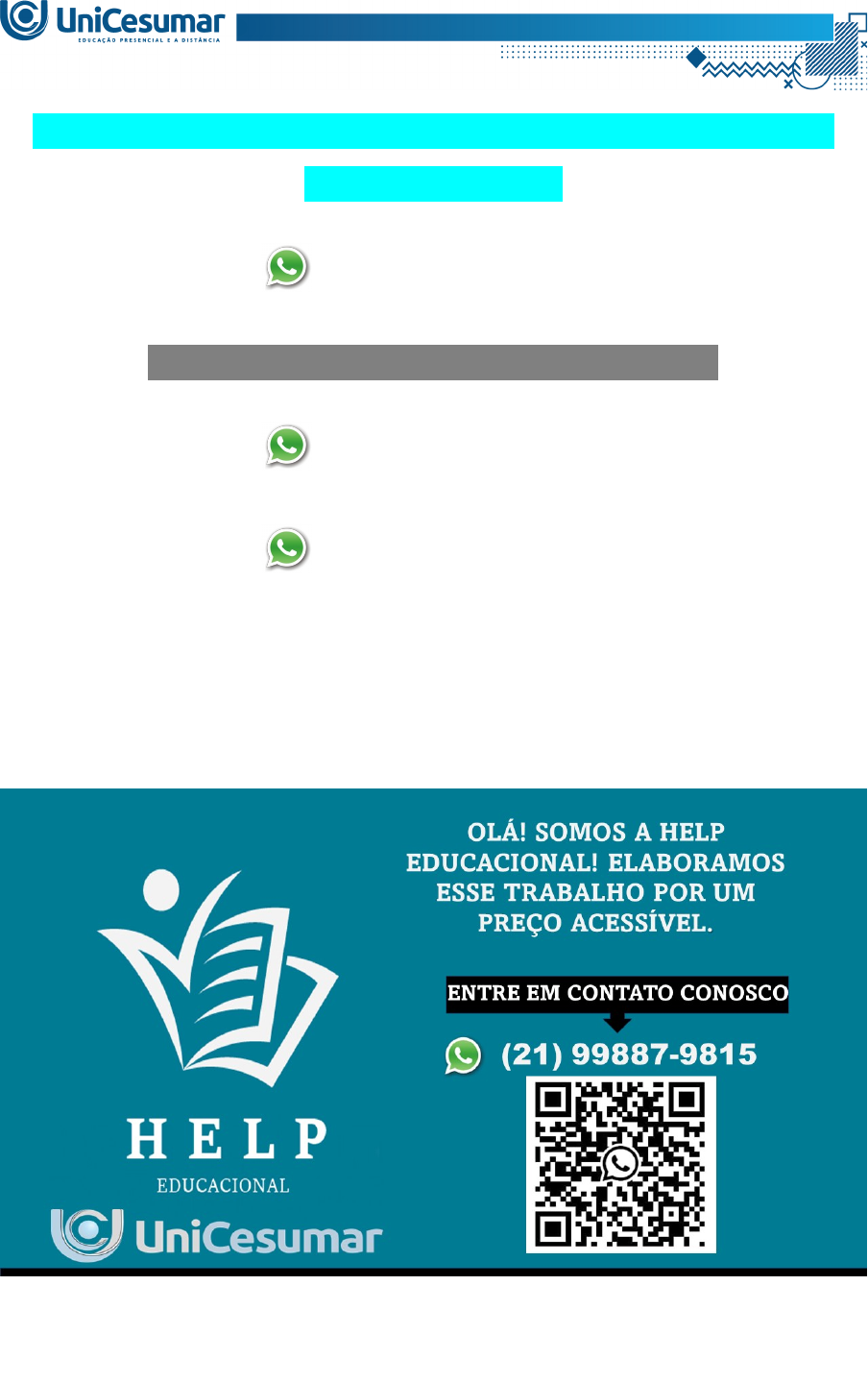 ATIVIDADE 1 – ENF – TRABALHO DE CONCLUSÃO DE CURSO - 53_2025 (21) 99887-9815 ASSESSORIA NOS SEUS TRABALHOS (21) 99887-9815 (21) 99887-9815 Caro(a) aluno(a), seja bem-vindo(a) à Atividade de Estudo 1 da disciplina de Trabalho de Conclusão de Curso (TCC). O TCC é componente curricular obrigatório do curso de Enfermagem e um dos requisitos para a obtenção do título de Bacharel. Consiste em um trabalho acadêmico de sistematização do conhecimento construído ao longo da formação, permitindo ao futuro profissional demonstrar habilidades de análise crítica, produção científica, domínio técnico e ética. Nesta Atividade 1, o acadêmico deverá elaborar a primeira parte do manuscrito científico, denominada estruturação, com base no tema escolhido (dentro das áreas e linhas de pesquisa disponibilizadas pela instituição) e conforme as orientações repassadas nas aulas 1 a 4. Seguindo exatamente as orientações e formatação do TEMPLATE DO TRABALHO DE CONCLUSÃO DE CURSO – MODELO EXPLICATIVO e MANUAL DE ORIENTAÇÕES PARA PESQUISA E PRODUÇÃO DE TCC. A entrega deverá contemplar todos os itens abaixo: Título Autoria do trabalho Objetivo geral da pesquisa Palavras-chave (3 descritores retirados dos Descritores em Ciências da Saúde) Introdução ORIENTAÇÕES INICIAIS: Leia todos os materiais disponibilizados no ambiente da disciplina. Utilize obrigatoriamente TEMPLATE AE1 oficial da Atividade 1, disponível no Material da Disciplina. O uso do template é obrigatório e ele será a folha de resposta para a entrega da atividade. Respeite as orientações de formatação descritas no TEMPLATE DO TRABALHO DE CONCLUSÃO DE CURSO – MODELO EXPLICATIVO e MANUAL DE ORIENTAÇÕES PARA PESQUISA E PRODUÇÃO DE TCC. O título pode ser provisório nesta etapa e será revisado na segunda atividade. A qualidade da escrita será considerada na avaliação: evite textos confusos, copiados ou com erros conceituais. A atividade é individual ou em dupla. Casos de cópias entre colegas ou plágio resultarão em nota zero. ORIENTAÇÕES FINAIS: O arquivo deve ser enviado exclusivamente pelo ambiente Studeo, no campo “Atividade de Estudo 1”, no formato PDF. Qualquer outro meio de envio não será considerado. A IES não se responsabiliza por arquivos corrompidos, em branco, errados ou fora do prazo de envio. Atente-se para data limite de envio. COMO ENVIAR O SEU ARQUIVO: Ao final do enunciado desta Atividade de Estudo 1, no Studeo, tem uma caixa de envio de arquivo. Basta clicar e selecionar sua atividade, ou arrastar o arquivo até ela Antes de clicar em “Finalizar”, certifique-se de que o arquivo anexado é o correto, pois uma vez finalizado você não poderá mais modificar o arquivo. Sugerimos que você clique no link gerado da sua atividade e faça o download para conferir OLÁ! SOMOS A HELP EDUCACIONAL! ELABORAMOS ESSE TRABALHO POR UM PREÇO ACESSÍVEL. ENTRE EM CONTATO CONOSCO (21) 99887-9815 image1.png image2.png image3.png