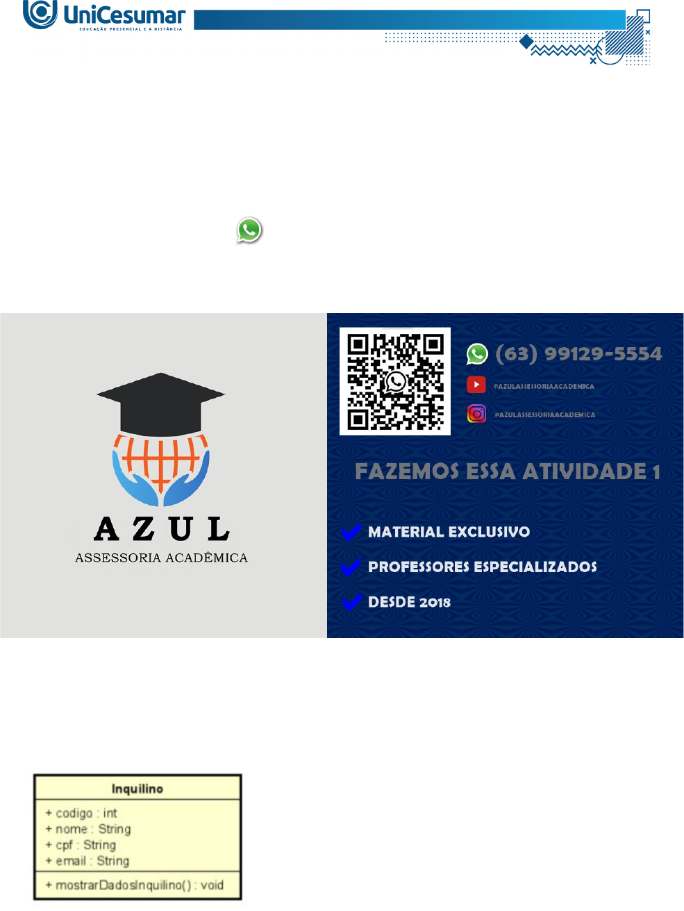 Olá, aluno(a)! Está com dificuldade ou sem tempo para elaborar essa atividade? Iremos te ajudar! Entre em contato (63) 99129-5554 ATIVIDADE 1 – ADSIS - PROGRAMAÇÃO III - 53_2025 Você como analista de sistema recebeu a modelagem de uma classe Inquilino como demonstrada abaixo que é utilizado em um sistema de locação: Entretanto, a programação orientada à objetos traz conceitos como abstração, encapsulamento, herança e polimorfismo, conceitos esses que justificam a sua utilização para a criação de um código de qualidade. Sabendo disso, identifique qual o conceito da Orientação à Objetos não está sendo aplicado de forma correta nesta modelagem justificando sua resposta. Após a definição e descrição, descreva também as modificações necessárias para que a classe aplique os conceitos corretamente. IMPORTANTE: - Acesse o link com um vídeo tutorial para ajudá-lo nesse processo de criação e desenvolvimento. O acesso deverá ser realizado em: Arquivos >> Material da Disciplina, ou no respectivo fórum. - Lembre-se que evidências de cópias de materiais, incluindo de outros acadêmicos, sem devidas referências, serão inquestionavelmente zeradas. As citações e referências, mesmo que do livro da disciplina, devem ser realizadas conforme normas da Instituição de Ensino. - Não são permitidas correções parciais no decorrer do módulo, ou seja, o famoso: “professor, veja se minha atividade está certa?”. Isso invalida seu processo avaliativo. Lembre-se que a interpretação da atividade também faz parte da avaliação. - Procure sanar suas dúvidas junto à mediação em tempo hábil sobre o conteúdo exigido na atividade, de modo que consiga realizar sua participação. - Sua resposta deve ser inserida diretamente no quadro disponível no campo da Atividade de Estudo 1 (não é permitido anexar formulário). - Procure elaborar sua resposta em um editor de textos, existem vários grátis e que funcionam diretamente no navegador, como o Google Docs, depois cole no campo da atividade. - Atenção ao prazo de entrega! Evite envio de atividade em cima do prazo. Você pode ter algum problema com internet, computador, software etc. Os prazos não serão flexibilizados, mesmo em caso de comprovação. image1.png image2.png image3.png image4.png