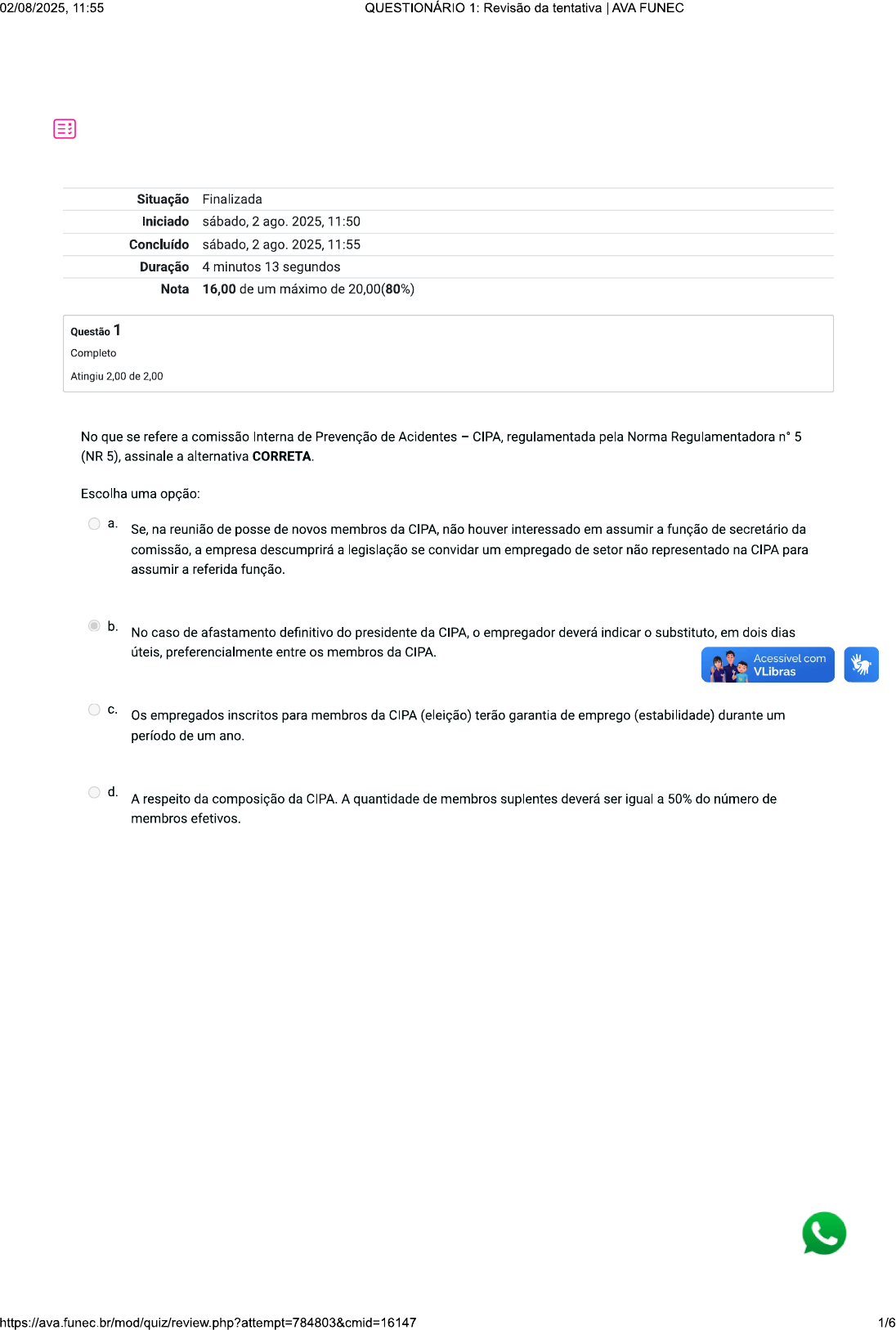 02/08/2025, 11:55 QUESTIONÁRIO 1: Revisão da tentativa AVA FUNEC Situação Finalizada Iniciado sábado, 2 ago. 2025, 11:50 Concluído sábado, 2 ago. 2025, 11:55 Duração 4 minutos 13 segundos Nota 16,00 de um máximo de 20,00(80%) Questão 1 Completo Atingiu 2,00 de 2,00 No que se refere a comissão Interna de Prevenção de Acidentes CIPA, regulamentada pela Norma Regulamentadora n° 5 (NR 5), assinale a alternativa CORRETA. Escolha uma opção: a. Se, na reunião de posse de novos membros da CIPA, não houver interessado em assumir a função de secretário da comissão, a empresa descumprirá a legislação se convidar um empregado de setor não representado na CIPA para assumir a referida função. b. No caso de afastamento definitivo do presidente da CIPA, o empregador deverá indicar o substituto, em dois dias úteis, preferencialmente entre os membros da CIPA. Acessível com VLibras Os empregados inscritos para membros da CIPA (eleição) terão garantia de emprego (estabilidade) durante um período de um ano. d. A respeito da composição da CIPA. A quantidade de membros suplentes deverá ser igual a 50% do número de membros efetivos. 1/602/08/2025, 11:55 QUESTIONÁRIO 1: Revisão da tentativa AVA FUNEC Questão 2 Completo Atingiu 2,00 de 2,00 De acordo com Norma Regulamentadora NR 03 (Embargo e Interdição) elaborada pelo Ministério do Trabalho e Emprego, analise as afirmativas abaixo: I. Embargo e interdição são medidas de urgência adotadas a partir da constatação de condição ou situação de trabalho que caracterize grave e iminente risco ao trabalhador. II. embargo e a interdição são medidas de proteção emergencial à segurança e à saúde do trabalhador, não se caracterizando como medidas punitivas. III. Durante a paralisação do serviço, em decorrência da interdição ou do embargo, os trabalhadores receberão 1/3 dos salários como bonificação. Assinale a alternativa correta. Escolha uma opção: a. Apenas as afirmativas I e III estão corretas b. Apenas as afirmativas II e III estão corretas Apenas a afirmativa está correta d. Apenas as afirmativas e estão corretas Acessível com VLibras Questão 3 Completo Atingiu 2,00 de 2,00 A NR 1 estabelece que as medidas de prevenção, ouvidos os trabalhadores, sejam adotadas considerando uma determinada ordem de prioridade, que é: Escolha uma opção: a. medidas administrativas para redução dos fatores de risco, eliminação dos fatores de risco, utilização de medidas individuais de proteção e ampliação da percepção de risco a partir da adoção de medidas de proteção coletiva. b. eliminação dos fatores de risco, minimização e controle dos fatores de risco, com adoção de medidas de proteção coletiva, medidas administrativas ou de organização do trabalho para minimização dos fatores de risco e adoção de medidas de proteção individual. eliminação dos fatores de risco, redução dos fatores de risco, com medidas individuais de proteção, medidas administrativas para aumentar os fatores de risco e EPIs (equipamentos de proteção individual). d. EPIs (equipamentos de proteção individual), medidas administrativas para redução dos fatores de risco, eliminação dos fatores de risco e minimização e controle dos fatores de risco, com a adoção de medidas de proteção coletiva e individuais de proteção. 2/602/08/2025, 11:55 QUESTIONÁRIO 1: Revisão da tentativa AVA FUNEC Questão 4 Completo Atingiu 2,00 de 2,00 trabalhador, ao receber o EPI, fica sob sua responsabilidade: Escolha uma opção: a. substituir quando for danificado ou extraviado b. sua guarda e conservação comunicar ao MTE qualquer irregularidade observada d. higienização e manutenção periódica Questão 5 Completo Atingiu 2,00 de 2,00 Na NR-3 consta que o auditor fiscal do trabalho deverá considerar dois parâmetros durante a caracterizaç Acessível com iminente risco. São eles: VLibras Escolha uma opção: a. o número de trabalhadores expostos e quantos trabalhadores já se acidentaram nas condições observadas. b. o número de acidentes com afastamento em relação ao total de horas trabalhadas e o número de trabalhadores expostos. qual a consequência se um evento não desejado ocorrer e qual a probabilidade desta consequência ocorrer. d. quantas multas a empresa já recebeu pelo mesmo motivo e quais medidas de controle foram implementadas. 3/602/08/2025, 11:55 QUESTIONÁRIO 1: Revisão da tentativa AVA FUNEC Questão 6 Completo Atingiu 2,00 de 2,00 No que se refere as ATRIBUIÇÕES da comissão Interna de Prevenção de Acidentes CIPA, regulamentada pela Norma Regulamentadora no 5 (NR 5), assinale a alternativa ERRADA. Escolha uma opção: a. Realizar, periodicamente, verificações nos ambientes e condições de trabalho visando a identificação de situações que venham a trazer riscos para a segurança e saúde dos trabalhadores. b. Participar da implementação e do controle da qualidade das medidas de prevenção necessárias, bem como da avaliação das prioridades de ação nos locais de trabalho. Elaborar plano de trabalho que possibilite a ação preventiva na solução de problemas de segurança e saúde no trabalho, exceto nas áreas não insalubres. d. Identificar os riscos do processo de trabalho e elaborar o mapa de riscos, com a participação do maior número de trabalhadores, com assessoria do SESMT, onde houver. Questão 7 Completo Atingiu 0,00 de 2,00 Acessível com VLibras Em relação à NR-03, que trata de embargo e interdição, assinale a alternativa correta. Escolha uma opção: a. Durante a paralisação do serviço, em decorrência da interdição ou do embargo, os trabalhadores receberão o equivalente a um salário-mínimo. b. São passíveis de embargo ou interdição, a obra, a atividade, a máquina ou equipamento, o setor de serviço, o estabelecimento, com a brevidade que a ocorrência exigir, sempre que o Auditor-Fiscal do Trabalho constatar a existên