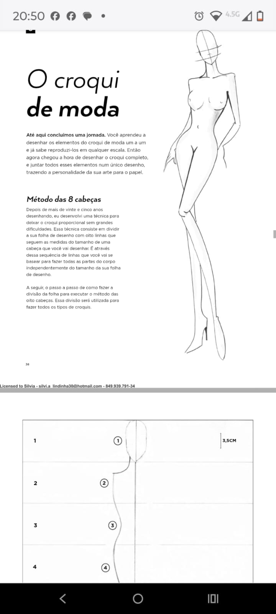 20:50 f L 4.5G croqui de moda Até aqui concluímos uma jornada. Você aprendeu a desenhar elementos do croqui de moda um a um e já sabe reproduzi-los em qualquer escala. Então agora chegou a hora de desenhar O croqui completo, e juntar todos esses elementos num único desenho, trazendo a personalidade da sua arte para O papel. Método das 8 cabeças Depois de mais de vinte e cinco anos desenhando, eu desenvolvi uma técnica para deixar croqui proporcional sem grandes dificuldades. Essa técnica consiste em dividir a sua folha de desenho com oito linhas que seguem as medidas do tamanho de uma cabeça que você vai desenhar. através dessa sequência de linhas que você vai se basear para fazer todas as partes do corpo independentemente do tamanho da sua folha de A seguir, O passo a passo de como fazer a divisão da folha para executar método das oito Essa divisão será utilizada para fazer todos os tipos de croquis. 38 Licensed to Silvia silvi.a lindinha30@hotmail.com 849.939.791-34 1 1 3,5CM 2 2 3 3 4 4