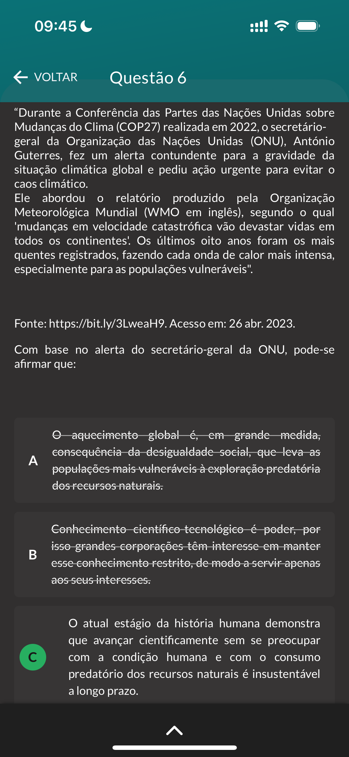 09:45 VOLTAR Questão 6 "Durante a Conferência das Partes das Nações Unidas sobre Mudanças do Clima (COP27) realizada em 2022, secretário- geral da Organização das Nações Unidas (ONU), António Guterres, fez um alerta contundente para a gravidade da situação climática global e pediu ação urgente para evitar caos climático. Ele abordou relatório produzido pela Organização Meteorológica Mundial (WMO em inglês), segundo qual 'mudanças em velocidade catastrófica vão devastar vidas em todos os continentes'. Os últimos oito anos foram os mais quentes registrados, fazendo cada onda de calor mais intensa, especialmente para as populações vulneráveis". Fonte: Acesso em: 26 abr. 2023. Com base no alerta do secretário-geral da ONU, pode-se afirmar que: aquecimento global é, em grande medida, consequência da desigualdade social, que leva as populações mais vulneráveis à exploração predatória dos recursos naturais. Conhecimento científico tecnológico é poder, por isso grandes corporações têm interesse em manter B esse conhecimento restrito, de modo a servir apenas aos seus interesses. O atual estágio da história humana demonstra que avançar cientificamente sem se preocupar com a condição humana e com consumo predatório dos recursos naturais é insustentável a longo prazo.