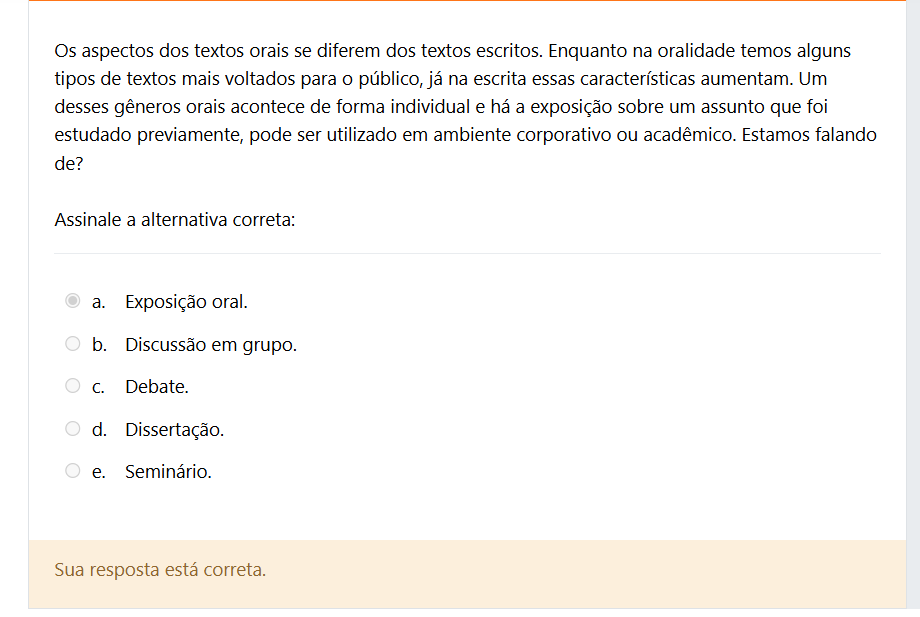 Os aspectos dos textos orais se diferem dos textos escritos. Enquanto na oralidade temos alguns tipos de textos mais voltados para público, já na escrita essas características aumentam. Um desses gêneros orais acontece de forma individual e há a exposição sobre um assunto que foi estudado previamente, pode ser utilizado em ambiente corporativo ou acadêmico. Estamos falando de? Assinale a alternativa correta: a. Exposição oral. b. Discussão em grupo. C. Debate. d. Dissertação. e. Seminário. Sua resposta está correta.