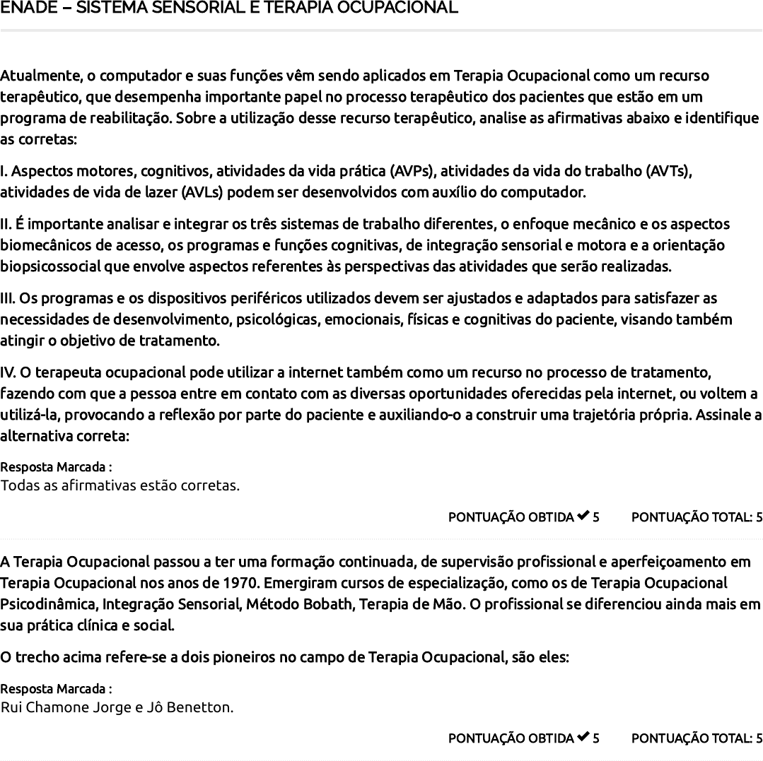 ENADE – SISTEMA SENSORIAL E TERAPIA OCUPACIONAL PONTUAÇÃO TOTAL: 5PONTUAÇÃO OBTIDA 5 Atualmente, o computador e suas funções vêm sendo aplicados em Terapia Ocupacional como um recurso terapêutico, que desempenha importante papel no processo terapêutico dos pacientes que estão em um programa de reabilitação. Sobre a utilização desse recurso terapêutico, analise as afirmativas abaixo e identifique as corretas: I. Aspectos motores, cognitivos, atividades da vida prática (AVPs), atividades da vida do trabalho (AVTs), atividades de vida de lazer (AVLs) podem ser desenvolvidos com auxílio do computador. II. É importante analisar e integrar os três sistemas de trabalho diferentes, o enfoque mecânico e os aspectos biomecânicos de acesso, os programas e funções cognitivas, de integração sensorial e motora e a orientação biopsicossocial que envolve aspectos referentes às perspectivas das atividades que serão realizadas. III. Os programas e os dispositivos periféricos utilizados devem ser ajustados e adaptados para satisfazer as necessidades de desenvolvimento, psicológicas, emocionais, físicas e cognitivas do paciente, visando também atingir o objetivo de tratamento. IV. O terapeuta ocupacional pode utilizar a internet também como um recurso no processo de tratamento, fazendo com que a pessoa entre em contato com as diversas oportunidades oferecidas pela internet, ou voltem a utilizá-la, provocando a reflexão por parte do paciente e auxiliando-o a construir uma trajetória própria. Assinale a alternativa correta: Resposta Marcada : Todas as afirmativas estão corretas. PONTUAÇÃO TOTAL: 5PONTUAÇÃO OBTIDA 5 A Terapia Ocupacional passou a ter uma formação continuada, de supervisão profissional e aperfeiçoamento em Terapia Ocupacional nos anos de 1970. Emergiram cursos de especialização, como os de Terapia Ocupacional Psicodinâmica, Integração Sensorial, Método Bobath, Terapia de Mão. O profissional se diferenciou ainda mais em sua prática clínica e social. O trecho acima refere-se a dois pioneiros no campo de Terapia Ocupacional, são eles: Resposta Marcada : Rui Chamone Jorge e Jô Benetton. 20 / 20 PONTUAÇÃO TOTAL: 5PONTUAÇÃO OBTIDA 5 A integração sensorial é um processo neurológico que organiza a sensação do nosso corpo e do ambiente, tornando possível a utilização do corpo dentro do contexto ambiental. No que se refere à terapia de integração sensorial, o terapeuta ocupacional deve Resposta Marcada : considerar que os objetivos dos procedimentos da integração sensorial irão variar de acordo com o tipo de disfunção diagnosticada e com as diferenças individuais que fazem de cada indivíduo um ser único. PONTUAÇÃO TOTAL: 5PONTUAÇÃO OBTIDA 5 Leia os textos a seguir. Texto I Marine Le Pen, líder da Frente Nacional (partido francês de extrema-direita) disse “que a França deveria abandonar imediatamente o Tratado de Schengen”, que mantêm as fronteiras abertas entre 26 países da União Europeia (UE). Markus Söder, líder da ala extrema-direita do partido alemão União Democrata Cristã, escreveu em seu Twitter que “os ataques mudam tudo e nós [Alemanha] não podemos mais permitir toda e qualquer imigração ilegal (sic) e descontrolada em nosso território”. Na Polônia, um país que tem se tornado cada vez mais reacionário, o líder do partido conservador Lei e Justiça (que chegou ao poder em eleições em outubro), Konrad Szymanski, disse que a “Europa precisa revisar profundamente a política de acolhida de refugiados”. Anunciou, ainda, que o país não acolherá novas pessoas solicitantes de asilo. Fonte: Disponível em: Acesso em: 09 jun. 2018. Texto II “Tomaria as mesmas decisões importantes de 2015 da mesma forma”, disse Merkel. “Foi uma situação extraordinária e tomei a minha decisão com base no que pensei ser correto do ponto de vista político e humanitário”, defendeu a chanceler, acrescentando que aquele tipo de “situações extraordinárias” acontece de vez em quando na história de um país. “O chefe do governo tem de agir e eu agi”. Fonte: Disponível em: Acesso em: 09 jun. 2018. Os textos acima referem-se Resposta Marcada : à questão dos refugiados e como a Alemanha, diferentemente de outros países e visões políticas extremas, abriu suas fronteiras para recebê-los. Total de Pontos