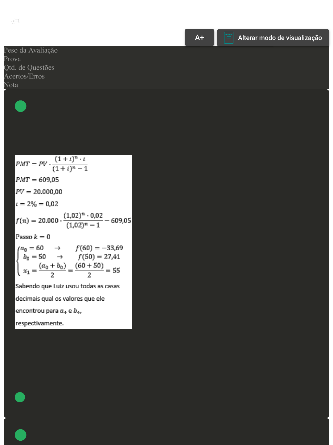 Prova Impressa GABARITO | Avaliação II - Individual (Cod.:1527463) Peso da Avaliação 2,00 Prova 103057212 Qtd. de Questões 10 Acertos/Erros 10/0 Nota 10,00 Ao estudar matemática financeira, o professor de Luiz comentou que para determinar o prazo em um financiamento no sistema Price é necessário utilizar um método numérico. O professor de Luiz passou o seguinte problema: suponha que um financiamento no sistema Price no valor de R$ 20.000,00 está aplicado a uma taxa de 2% ao mês e o valor de cada parcela seja de R$ 609,05, determine o prazo desse financiamento. Luiz, lembrando o que seu professor falou em sala, resolveu usar o Método da Bissecção para encontrar o prazo. Luiz fez as seguintes anotações: A 55 e 52,5. B 53,75 e 54,0625. C 52,5 e 53,75. D 53,75 e 54,375. No universo da Matemática, tudo que estudamos tem uma razão e aplicabilidade. Da teoria à 1 2 Avaliação II - Individual https://ava2.uniasselvi.com.br/subject/grades-and-tests/answer-book/e... 1 of 6 04/08/2025, 19:10 prática, os logaritmos são trabalhados em diversas áreas do conhecimento. O trabalho com uma função logarítmica tem como objetivo facilitar os cálculos, bem como ampliar os conhecimentos em assuntos específicos, como: a) na Química, quando o trabalho envolve radioatividade, para determinar o tempo de desintegração de uma substância radioativa é utilizada a fórmula: Q=qo.e^(-r-t). Nesta fórmula, Q representa a massa da substância, qº a massa inicial, r a taxa de redução da radioatividade e a variável t o tempo. Equações com essa tipologia podem ser resolvidas com o auxílio da teoria dos logaritmos; b) no ano de 1935, os sismólogos Charles Francis Richter e Beno Gutenberg desenvolveram uma escala para quantificar o nível de energia liberada por um sismo. A escala Richter, que também é conhecida por escala de magnitude local, é uma função logarítmica. Assim, é possível quantificar em Joules a quantidade de energia liberada por um movimento tectônico; c) na Medicina, quando é ministrado um tratamento, o paciente recebe o medicamento, que entra na corrente sanguínea, que passa por órgãos como fígado e rins. Neste caso, é possível obter o tempo necessário para que a quantidade desse medicamento presente no corpo do paciente seja menor ou maior que uma determinada quantidade, e para isso é necessário trabalhar com uma equação logarítmica. Neste contexto, trabalhando com uma margem de erro menor ou igual a (0,1), calcule o valor aproximado da função: f(x) = x.log(x+1) - 2, sabendo que a função tem apenas uma raiz real, que está contida no intervalo. A A função tem sua raiz real em 3,25. B A função tem sua raiz real em 3,3. C A função tem sua raiz real em 3,2. D A função tem sua raiz real em 3,5. Avaliação II - Individual https://ava2.uniasselvi.com.br/subject/grades-and-tests/answer-book/e... 2 of 6 04/08/2025, 19:10 Existem vários métodos que determinam as raízes de uma função, dentre elas alguns necessitam de pelo menos um ponto suficientemente máximo para iniciar o processo de resolução. No entanto, o método do Algoritmo Quociente-Diferença não necessita desta informação. Com base nesse método, analise as sentenças a seguir: I- Podemos aplicá-lo desde que conheçamos um ponto próximo da raiz. II- Este método permite encontrarmos todas as raízes de um polinômio simultaneamente. III- Podemos aplicá-lo para qualquer tipo do polinômio. IV- Este método permite encontrarmos inclusive raízes complexas. Assinale a alternativa CORRETA: A As sentenças I e III estão corretas. B As sentenças III e IV estão corretas. C As sentenças II e IV estão corretas. D As sentenças I e II estão corretas. Consideremos uma função f e um intervalo [a, b] para o qual f é contínua em todos os pontos do intervalo e f(a)·f(b) 0, o critério de parada seja satisfeito?Assinale a alternativa CORRETA: A Método da bissecção. B Método da Gauss. C Método da ordem de convergências. D Método simples. Método iterativo clássico que data do final do século XVIII. Técnicas iterativas são raramente utilizadas para solucionar sistemas lineares de pequenas dimensões, já que o tempo requerido para obter um mínimo de precisão ultrapassa o requerido pelas técnicas diretas como a eliminação gaussiana. Contudo, para sistemas grandes, com grande porcentagem de entradas de zero, essas técnicas aparecem como alternativas mais eficientes. Sistemas esparsos de grande porte frequentemente surgem na análise de circuitos, na solução numérica de problemas de valor de limite e equações diferenciais parciais. De que método estamos falando? A Método de bissecção. 3 4 5 Avaliação II - Individual https://ava2.uniasselvi.com.br/subject/grades-and-tests/answer-book/e... 3 of 6 04/08/2025, 19:10 B Método de Jacobi. C Método de Gauss. D Método de Newton. Quando conhecemos os valores de uma função f aplicada em dois pontos distintos, podemos aproximá-la por um polinômio de grau 1 que coincida com f exatamente nestes dois pontos. A este processo chamamos interpolação linear.Neste contexto, considerando a função f(x) = a0 + a1 x, definida pelos pontos (2, -1) e (4, -3), qual o valor de f(-2)? A f(-2) =3 B f(-2) = -3 C f(-2) = 0 D f(-2) = 2 E f(-2) = -2 Quando conhecemos os valores de uma função f aplicada em dois pontos distintos, podemos aproximá-la por um polinômio de grau 1 que coincida com f exatamente nestes dois pontos. A este processo chamamos interpolação linear.Neste contexto, considerando a função f(x) = a0 + a1 x, definida pelos pontos (1, -1/3) e (3, -7/3), qual o valor de f(-1)? A f(-1) = 4/3 B f(-1) = 2 C f(-1) = 11/3 D f(-1)= 5/3 E f(-1) = 2/3 Os métodos de Jacobi e Gauss-Seidel são métodos que encontram uma solução aproximada da solução de um sistema linear. Quando não temos mais um sistema linear e sim um sistema não linear devemos fazer uso de outros métodos para encontrar uma solução aproxi
