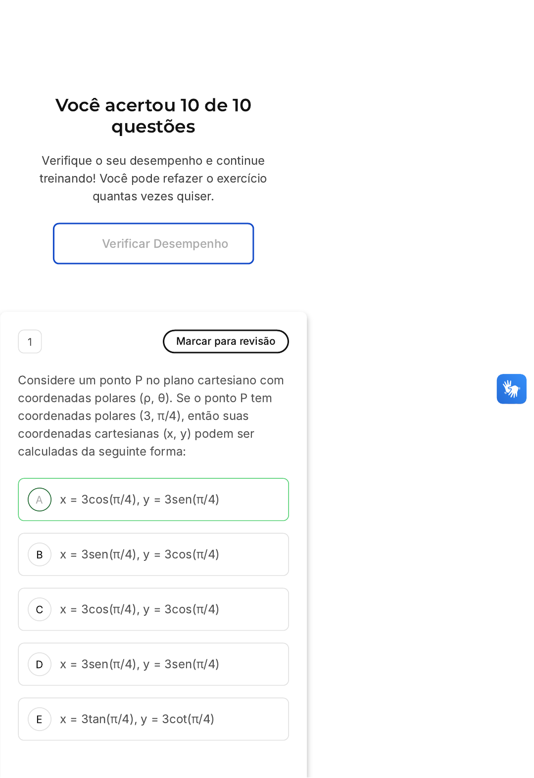 05/08/25, 01:58 estacio.saladeavaliacoes.com.br/exercicio/6890ef6a7c9b235dfbd34298/gabarito/ https://estacio.saladeavaliacoes.com.br/exercicio/6890ef6a7c9b235dfbd34298/gabarito/ 1/12 Você acertou 10 de 10 questões Verifique o seu desempenho e continue treinando! Você pode refazer o exercício quantas vezes quiser. Verificar Desempenho A B C D E 1 Marcar para revisão Considere um ponto P no plano cartesiano com coordenadas polares (ρ, θ). Se o ponto P tem coordenadas polares �3, π/4), então suas coordenadas cartesianas (x, y) podem ser calculadas da seguinte forma: x = 3cos(π/4), y = 3sen(π/4) x = 3sen(π/4), y = 3cos(π/4) x = 3cos(π/4), y = 3cos(π/4) x = 3sen(π/4), y = 3sen(π/4) x = 3tan(π/4), y = 3cot(π/4) 05/08/25, 01:58 estacio.saladeavaliacoes.com.br/exercicio/6890ef6a7c9b235dfbd34298/gabarito/ https://estacio.saladeavaliacoes.com.br/exercicio/6890ef6a7c9b235dfbd34298/gabarito/ 2/12 Resposta correta Parabéns, você selecionou a alternativa correta. Confira o gabarito comentado! Gabarito Comentado Nas coordenadas polares, a distância do ponto à origem é representada por e o ângulo que a reta faz com o eixo polar é representado por . No caso em questão, as coordenadas polares do pontc são , o que significa que a distância do ponto à origem é ăngulo é . Para converter essas coordenadas polares em coordenadas cartesianas , utilizamos as seguintes fórmulas: Substituindo e , obtemos: P p OP θ P (3, π/4) 3eo θ π/4 (x, y) x = ρ cos(θ) y = ρ sin(θ) ρ = 3 θ = π/4 x = 3 cos(π/4) = 3(√2/2) = 3√2/2 y = 3 sin(π/4) = 3(√2/2) = 3√2/2 2 Marcar para revisão Levando-se em consideração uma função vetorial F(t) = (f(t), g(t), h(t)), em que f(t), g(t) e h(t) são funções componentes dependendo do parâmetro t. Ao calcular a derivada de F(t) em um ponto específico, o vetor resultante será: 05/08/25, 01:58 estacio.saladeavaliacoes.com.br/exercicio/6890ef6a7c9b235dfbd34298/gabarito/ https://estacio.saladeavaliacoes.com.br/exercicio/6890ef6a7c9b235dfbd34298/gabarito/ 3/12 A B C D E Perpendicular à trajetória definida pela função vetorial Paralelo à trajetória definida pela função vetorial Normal à trajetória definida pela função vetorial Diagonal à trajetória definida pela função vetorial Ortogonal à trajetória definida pela função vetorial Resposta correta Parabéns, você selecionou a alternativa correta. Confira o gabarito comentado! Gabarito Comentado A derivada de uma função vetorial F(t) representa um vetor que é tangente à trajetória definida pela função vetorial. O vetor tangente à curva de F(t) é o vetor que descreve a direção e o sentido da curva no ponto analisado. Geometricamente, esse vetor será paralelo à trajetória definida pela função vetorial. As outras alternativas não descrevem corretamente a relação entre a derivada da função vetorial e a tangente à curva. Questão 4 de 10 1 2 3 4 5 6 7 8 9 10 Lista de exercícios Funções… Sair 05/08/25, 01:58 estacio.saladeavaliacoes.com.br/exercicio/6890ef6a7c9b235dfbd34298/gabarito/ https://estacio.saladeavaliacoes.com.br/exercicio/6890ef6a7c9b235dfbd34298/gabarito/ 4/12 A B C D E 3 Marcar para revisão Qual é a equação polar da curva definida pela função , com u>0?→G (u) = ⟨2u, 2u⟩ ρ = 2 ρ = θ θ = π 4 ρ = 1 + senθ ρ = cosθ Resposta correta Parabéns, você selecionou a alternativa correta. Confira o gabarito comentado! Gabarito Comentado A equação polar da curva definida pela função é . Isso ocorre porque a função dada é uma linha reta que passa pela origem com inclinação de 45 graus (ou radianos) em relação ao eixo x. Em coordenadas polares, essa inclinação é representada pelo ângulo . →G (u) = ⟨2u, 2u⟩ θ = π 4 π 4 θ Corretas �10� Em branco �0� 6 7 8 9 10 05/08/25, 01:58 estacio.saladeavaliacoes.com.br/exercicio/6890ef6a7c9b235dfbd34298/gabarito/ https://estacio.saladeavaliacoes.com.br/exercicio/6890ef6a7c9b235dfbd34298/gabarito/ 5/12 A B C D E 4 Marcar para revisão Considere uma curva parametrizada no espaço tridimensional. Se um vetor V é tal que o seu produto escalar com o vetor tangente à curva é igual a zero, então: O vetor V será paralelo à curva O vetor V será tangente à curva O vetor V será antiparalelo à curva O vetor V será normal à curva O vetor V será colinear à curva Resposta correta Parabéns, você selecionou a alternativa correta. Confira o gabarito comentado! Gabarito Comentado Se um vetor V tem produto escalar igual a zero com o vetor tangente à curva, então o vetor V será normal à curva. O produto escalar entre dois vetores é zero quando eles são perpendiculares entre si, o que implica que o vetor V é ortogonal ao vetor tangente à curva. As outras alternativas não representam corretamente a relação entre o vetor V e a curva. 05/08/25, 01:58 estacio.saladeavaliacoes.com.br/exercicio/6890ef6a7c9b235dfbd34298/gabarito/ https://estacio.saladeavaliacoes.com.br/exercicio/6890ef6a7c9b235dfbd34298/gabarito/ 6/12 A B C D E 5 Marcar para revisão Um avião está se movendo no espaço em uma trajetória curvilínea. Para descrever a posição do avião ao longo do tempo, é mais adequado utilizar: Uma equação escalar Uma equação linear Uma equação exponencial Uma equação paramétrica em vetores Uma equação cossenoidal Resposta correta Parabéns, você selecionou a alternativa correta. Confira o gabarito comentado! Gabarito Comentado Ao descrever a trajetória curvilínea de um avião, é necessário considerar não apenas as coordenadas espaciais (x, y, z), mas também o tempo como um parâmetro. Isso ocorre porque uma equação paramétrica permite descrever a posição do avião em termos de parâmetros variáveis, como o tempo, e utilizar vetores para representar a direção e o sentido do movimento em cada instante. As outras alternativas não são 05/08/25, 01:58 estacio.saladeavaliacoes.com.br/exercicio/6890ef6a7c9b235dfbd34298/gabarito/ htt