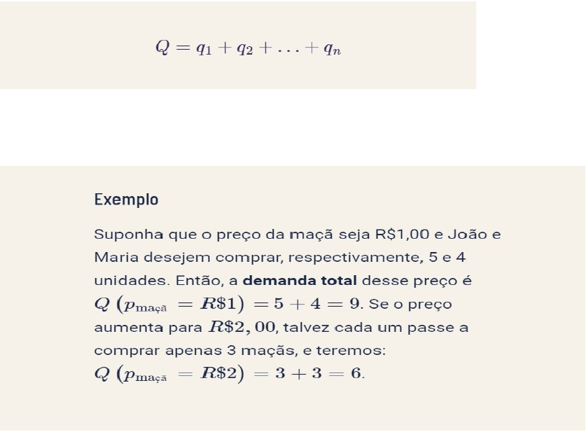 Curva de demanda agregada Você sabe o que é curva de demanda individual e agregada? Confira agora o conceito de cada uma delas! Curva de demanda individual: Mostra quanto um consumidor está disposto a pagar para obter um bem ou serviço, ou quantas unidades irá adquirir para cada preço. Curva de demanda agregada: Representa a quantidade total que o conjunto de consumidores de uma economia irá adquirir para cada preço. Supondo que em uma certa economia existam N indivíduos. A curva de demanda agregada pelo bem X será o somatório de todas as curvas de demanda individuais por aquele bem: Em que q1, q2, ..., qn são as demandas individuais de cada um dos N consumidores. A demanda de cada indivíduo para cada bem depende dos preços e da renda individual. Assim, a demanda agregada depende dos preços e também da distribuição de renda. Para simplificarmos, costumamos olhar para a demanda agregada como a demanda de um consumidor representativo, que tem sua renda igual à soma de todas as rendas individuais. Podemos notar que a curva de demanda agregada tem inclinação negativa, ou seja, quanto maior o preço, menor a quantidade demandada pelos consumidores, tudo o mais sendo constante. No geral, as curvas de demanda possuem inclinação negativa, com algumas exceções. Elasticidade-preço da demanda É interessante ter uma medida da sensibilidade da demanda a mudanças no preço e na renda, que também é conhecida como elasticidade. A primeira delas é a elasticidade-preço da demanda (denotada por 𝜖 ): é apenas a mudança percentual da quantidade dividida pela mudança percentual no preço. Representamos a variação da quantidade por Δ𝑄 e, portanto, a variação percentual é a razão Δ𝑄/𝑄 (análoga para o preço). Podemos escrever a expressão da elasticidade-preço e manipulá-la ligeiramente: Ou seja, a "inclinação da curva" é apenas o nome da razão entre a variação da quantidade (Δ𝑄) e a variação do preço ( Δ𝑝): se o preço aumenta em uma unidade (Δ𝑝=1), a inclinação informa simplesmente quanto muda na quantidade demandada. o exemplo das maçãs, temos: Δ𝑝=1 (o preço aumentou de R$1,00 para R$2,00), Δ𝑄 a quantidade demandada total diminuiu de 9 para 6 maçãs), para valores iniciais 𝑝=1 e 𝑄=9. Substituindo na fórmula acima, obtemos uma elasticidade igual a 1/3 (interprete esse número a partir da definição de elasticidade). O sinal da elasticidade da demanda é, em geral, negativo, e por isso nos referimos comumente ao seu valor absoluto, de forma a permitir comparações mais simples - ou seja, ignoramos o sinal, supostamente negativo, salvo menção explícita em contrário. O gráfico, a seguir, apresenta a elasticidade da curva de demanda linear. Como podemos observar, em uma curva de demanda linear, a elasticidade da demanda varia conforme a quantidade e o preço. Seja a curva de demanda linear igual a q = a - bp, em que a e b são parâmetros quaisquer. A inclinação dessa curva é, portanto, -b. Utilizando a fórmula da elasticidade apresentada, temos: quando 𝑝=0, a elasticidade é 0 (zero). Quando 𝑞=0, a elasticidade é infinita. Para encontrarmos o valor de 𝑝 para que a elasticidade seja, em valor absoluto, igual a 1, podemos resolver a equação abaixo para 𝑝. Como pudemos observar na última imagem, a elasticidade é igual a 1 em valor absoluto no ponto médio. Podemos classificar um bem em: Elástico Quando sua elasticidade-preço for maior do que 1 em módulo. Um bem elástico é bastante sensível a variações no preço, e um aumento de 1% faz a quantidade reduzir em mais do que 1% (são bens dos quais os consumidores têm facilidade para abrir mão). Inelástico Quando sua elasticidade for menor do que 1 em valor absoluto. Uma curva de demanda inelástica é pouco sensível a variações no preço, e um aumento de 1% ocasionará uma redução de menos de 1% na quantidade. Elasticidade unitária Quando sua elasticidade for igual a |1|. Uma curva de demanda com elasticidade unitária é aquela em que a variação de 1% no preço leva a uma variação de 1% na quantidade demandada. Elasticidade renda da demanda Além da elasticidade-preço, temos a elasticidade-renda da demanda, que mede o quanto a quantidade demandada reage a variações da renda. Sua equação é análoga à de elasticidade preço da demanda, sendo nada mais do que a razão entre as variações percentuais da quantidade (Q) e da renda (m): A partir da elasticidade-renda, podemos classificar os bens em: Normais Cuja demanda cresce devido ao aumento da renda, e cuja elasticidade-renda é positiva. Exemplos comuns de bens normais são produtos de qualidade (como carne de primeira), que o consumidor quer adquirir em maior quantidade quando sua renda aumenta. Inferiores Cuja demanda diminui devido ao aumento da renda, e cuja elasticidade-renda é negativa. Bens de baixa qualidade (como carne de segunda), por sua vez, são frequentemente inferiores, porque os consumidores os abandonam à medida que a renda aumenta. Os bens são classificados com base na elasticidade-renda, que mede como a demanda por um bem muda em resposta a variações na renda. Bens com elasticidade-renda maior que 1 são considerados bens de luxo, pois sua demanda aumenta mais de 1% para cada 1% de aumento na renda. Já os bens com elasticidade-renda entre 0 e 1 são classificados como bens de necessidade, como remédios, cuja demanda não dobra mesmo que a renda dobre. Muitas vezes, a elasticidade-renda de bens é próxima de 1. Receita e elasticidade Receita é o quanto se ganha com a venda do bem, ou seja, é a quantidade vendida multiplicada pelo preço do bem. Quando o preço do bem varia, a quantidade também variará, ocasionando mudanças na receita. Se o preço da batata aumenta, sua quantidade demandada irá reduzir. O que acontecerá com a receita da venda das batatas? Isso dependerá da elasticidade-preço da batata. Seja a receita de vendas igual