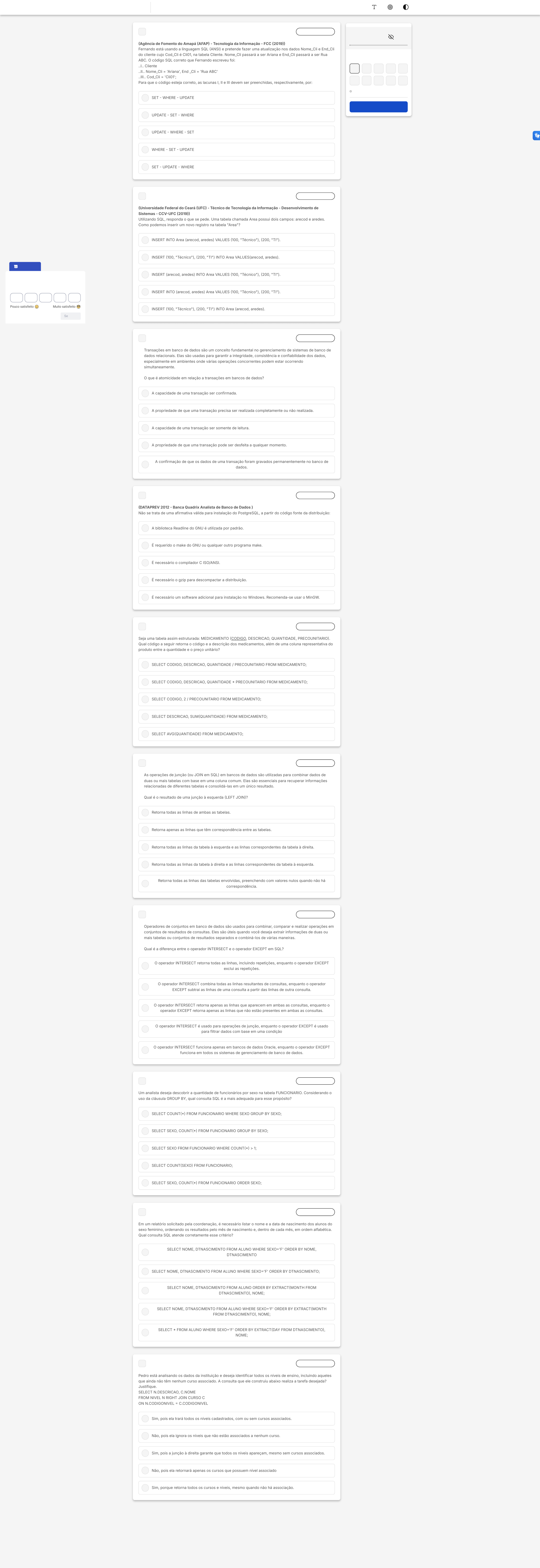 A B C D E A B C D E A B C D E A B C D E A B C D E A B C D E A B C D E A B C D E A B C D E A B C D E 1 Marcar para revisão �Agência de Fomento do Amapá �AFAP� - Tecnologia da Informação - FCC �2019�� Fernando está usando a linguagem SQL �ANSI) e pretende fazer uma atualização nos dados Nome_Cli e End_Cli do cliente cujo Cod_Cli é Cli01, na tabela Cliente. Nome_Cli passará a ser Ariana e End_Cli passará a ser Rua ABC. O código SQL correto que Fernando escreveu foi: ..I.. Cliente ..II.. Nome_Cli = 'Ariana', End _Cli = 'Rua ABC' ..III.. Cod_Cli = 'Cli01'; Para que o código esteja correto, as lacunas I, II e III devem ser preenchidas, respectivamente, por: SET � WHERE � UPDATE UPDATE � SET � WHERE UPDATE � WHERE � SET WHERE � SET � UPDATE SET � UPDATE � WHERE 2 Marcar para revisão �Universidade Federal do Ceará �UFC� - Técnico de Tecnologia da Informação - Desenvolvimento de Sistemas - CCV�UFC �2019�� Utilizando SQL, responda o que se pede. Uma tabela chamada Area possui dois campos: arecod e aredes. Como podemos inserir um novo registro na tabela "Area"? INSERT INTO Area (arecod, aredes) VALUES �100, "Técnico"), �200, "TI"). INSERT �100, "Técnico"), �200, "TI") INTO Area VALUES(arecod, aredes). INSERT (arecod, aredes) INTO Area VALUES �100, "Técnico"), �200, "TI"). INSERT INTO (arecod, aredes) Area VALUES �100, "Técnico"), �200, "TI"). INSERT �100, "Técnico"), �200, "TI") INTO Area (arecod, aredes). 3 Marcar para revisão Transações em banco de dados são um conceito fundamental no gerenciamento de sistemas de banco de dados relacionais. Elas são usadas para garantir a integridade, consistência e confiabilidade dos dados, especialmente em ambientes onde várias operações concorrentes podem estar ocorrendo simultaneamente. O que é atomicidade em relação a transações em bancos de dados? A capacidade de uma transação ser confirmada. A propriedade de que uma transação precisa ser realizada completamente ou não realizada. A capacidade de uma transação ser somente de leitura. A propriedade de que uma transação pode ser desfeita a qualquer momento. A confirmação de que os dados de uma transação foram gravados permanentemente no banco de dados. 4 Marcar para revisão �DATAPREV 2012 � Banca Quadrix Analista de Banco de Dados ) Não se trata de uma afirmativa válida para instalação do PostgreSQL, a partir do código fonte da distribuição: A biblioteca Readline do GNU é utilizada por padrão. É requerido o make do GNU ou qualquer outro programa make. É necessário o compilador C ISO/ANSI. É necessário o gzip para descompactar a distribuição. É necessário um software adicional para instalação no Windows. Recomenda-se usar o MinGW. 5 Marcar para revisão Seja uma tabela assim estruturada: MEDICAMENTO �CODIGO, DESCRICAO, QUANTIDADE, PRECOUNITARIO�. Qual código a seguir retorna o código e a descrição dos medicamentos, além de uma coluna representativa do produto entre a quantidade e o preço unitário? SELECT CODIGO, DESCRICAO, QUANTIDADE / PRECOUNITARIO FROM MEDICAMENTO; SELECT CODIGO, DESCRICAO, QUANTIDADE � PRECOUNITARIO FROM MEDICAMENTO; SELECT CODIGO, 2 / PRECOUNITARIO FROM MEDICAMENTO; SELECT DESCRICAO, SUM�QUANTIDADE� FROM MEDICAMENTO; SELECT AVG�QUANTIDADE� FROM MEDICAMENTO; 6 Marcar para revisão As operações de junção (ou JOIN em SQL) em bancos de dados são utilizadas para combinar dados de duas ou mais tabelas com base em uma coluna comum. Elas são essenciais para recuperar informações relacionadas de diferentes tabelas e consolidá-las em um único resultado. Qual é o resultado de uma junção à esquerda �LEFT JOIN�? Retorna todas as linhas de ambas as tabelas. Retorna apenas as linhas que têm correspondência entre as tabelas. Retorna todas as linhas da tabela à esquerda e as linhas correspondentes da tabela à direita. Retorna todas as linhas da tabela à direita e as linhas correspondentes da tabela à esquerda. Retorna todas as linhas das tabelas envolvidas, preenchendo com valores nulos quando não há correspondência. 7 Marcar para revisão Operadores de conjuntos em banco de dados são usados para combinar, comparar e realizar operações em conjuntos de resultados de consultas. Eles são úteis quando você deseja extrair informações de duas ou mais tabelas ou conjuntos de resultados separados e combiná-los de várias maneiras. Qual é a diferença entre o operador INTERSECT e o operador EXCEPT em SQL? O operador INTERSECT retorna todas as linhas, incluindo repetições, enquanto o operador EXCEPT exclui as repetições. O operador INTERSECT combina todas as linhas resultantes de consultas, enquanto o operador EXCEPT subtrai as linhas de uma consulta a partir das linhas de outra consulta. O operador INTERSECT retorna apenas as linhas que aparecem em ambas as consultas, enquanto o operador EXCEPT retorna apenas as linhas que não estão presentes em ambas as consultas. O operador INTERSECT é usado para operações de junção, enquanto o operador EXCEPT é usado para filtrar dados com base em uma condição O operador INTERSECT funciona apenas em bancos de dados Oracle, enquanto o operador EXCEPT funciona em todos os sistemas de gerenciamento de banco de dados. 8 Marcar para revisão Um analista deseja descobrir a quantidade de funcionários por sexo na tabela FUNCIONARIO. Considerando o uso da cláusula GROUP BY, qual consulta SQL é a mais adequada para esse propósito? SELECT COUNT��� FROM FUNCIONARIO WHERE SEXO GROUP BY SEXO; SELECT SEXO, COUNT��� FROM FUNCIONARIO GROUP BY SEXO; SELECT SEXO FROM FUNCIONARIO WHERE COUNT��� > 1; SELECT COUNT�SEXO� FROM FUNCIONARIO; SELECT SEXO, COUNT��� FROM FUNCIONARIO ORDER SEXO; 9 Marcar para revisão Em um relatório solicitado pela coordenação, é necessário listar o nome e a data de nascimento dos alunos do sexo feminino, ordenando os resultado