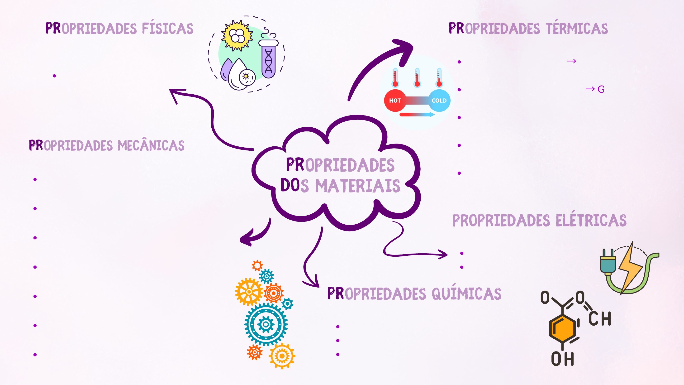 Como o material se comporta sob forças. Resistência Mecânica: Suporta força sem romper. Ex: Concreto em pontes. Dureza: Resiste a riscos ou deformações. Ex: Diamante (muito duro). Fragilidade: Quebra facilmente sem deformar. Ex: Vidro. Elasticidade: Volta à forma original após deformar. Ex: Borracha. Plasticidade: Deforma e mantém a forma. Ex: Massa de modelar. Maleabilidade: Forma lâminas finas. Ex: Alumínio. Ductilidade: Forma fios finos. Ex: Cobre. Propriedades ElétricasPropriedades Elétricas Reação do material ao calor. Ponto de Fusão: Sólido → Líquido. Ex: Gelo derretendo a 0°C. Ponto de Ebulição: Líquido → Gás. Ex: Água fervendo a 100°C. Dilatação Térmica: Expansão com calor. Ex: Trilhos de trem no sol. Contração Térmica: Encolhimento com frio. Ex: Metal encolhe no inverno. Condutividade Térmica: Conduz calor. Ex: Panelas de ferro ou alumínio. Características observáveis sem alterar a composição. Exemplo: Cor, densidade, brilho, ponto de fusão. PropriedadesPropriedades dos Materiaisdos Materiais Propriedades TérmicasPropriedades Térmicas Propriedades MecânicasPropriedades Mecânicas Propriedades FísicasPropriedades Físicas Condução de eletricidade. Exemplo: Condutores: Cobre, alumínio. Isolantes: Plástico, borracha. Propriedades QuímicasPropriedades Químicas Comportamento em reações químicas. Exemplos: Oxidação: Ferro enferrujando. Corrosão: Ação de ácidos nos metais. Combustão: Madeira queimando.