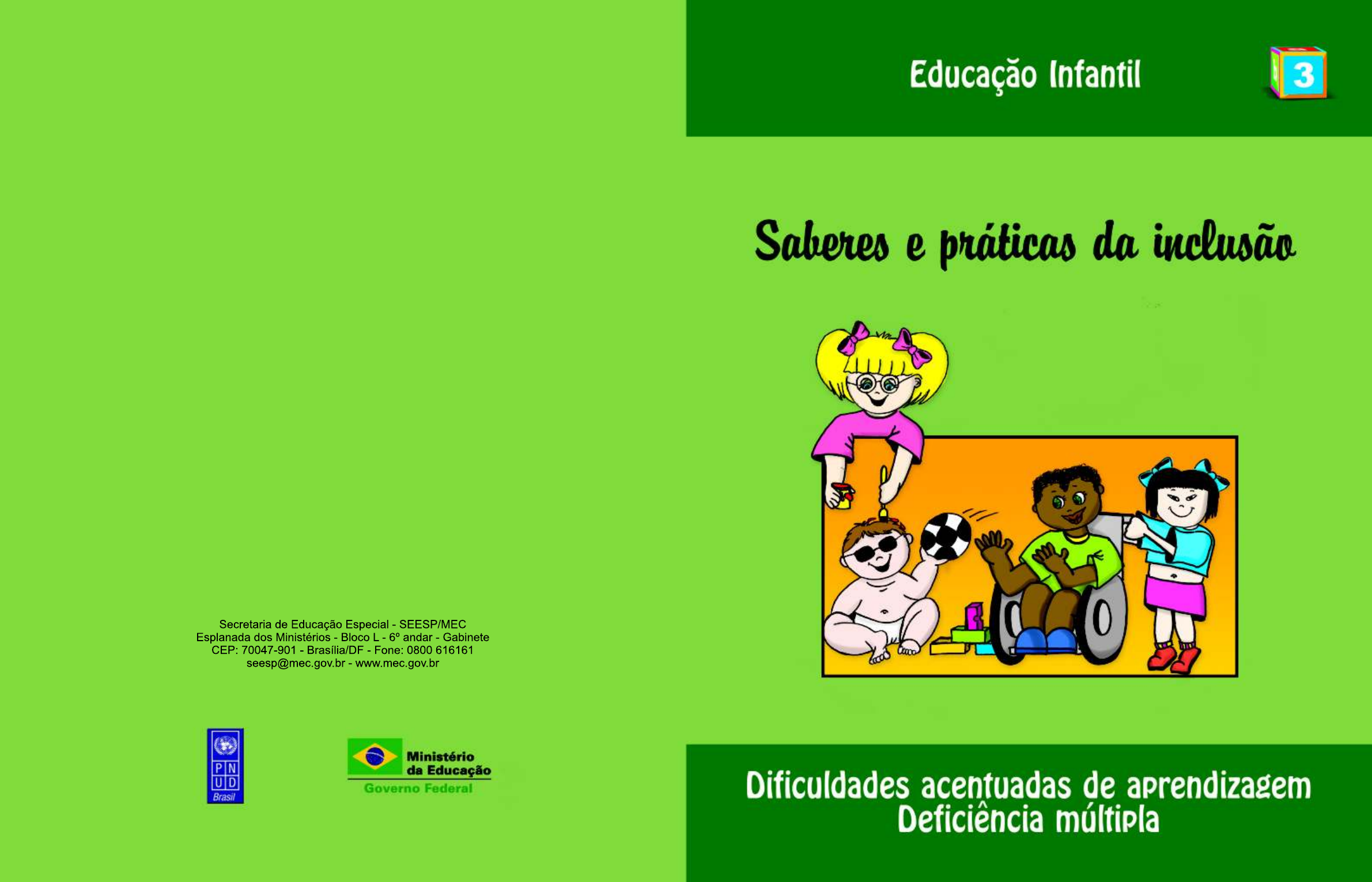 Presidente da República Luiz Inácio Lula da Silva Ministro da Educação Fernando Haddad Secretário Executivo José Henrique Paim Fernandes Secretária de Educação Especial Claudia Pereira Dutra MINISTÉRIO DA EDUCAÇÃO SECRETARIA DE EDUCAÇÃO ESPECIAL Brasília 2006 Educação Infantil Dificuldades acentuadas de aprendizagem Deficiência múltipla Saberes e práticas da inclusão Educação infantil : saberes e práticas da inclusão : dificuldades acentuadas de aprendizagem : deficiência múltipla. [4. ed.] / elaboração profª Ana Maria de Godói – Associação de Assistência à Criança Deficiente – AACD... [et. al.]. – Brasília : MEC, Secretaria de Educação Especial, 2006. 58 p. : il. 1. Educação infantil. 2. Pessoas com deficiências múltiplas. 3. Atendimento especializado. 4. Educação inclusiva. 5. Adaptação curricular. I. Godói, Ana Maria de. II. Brasil. Secretaria de Educação Especial. CDU 376.014.53 CDU 376 FICHA TÉCNICA Coordenação Geral • Profª Francisca Roseneide Furtado do Monte – MEC/SEESP • Profª Idê Borges dos Santos – MEC/SEESP Elaboração • Profª Ms. Marilda Moraes Garcia Bruno. Consultora autônoma. Revisão Técnica • Profª Francisca Roseneide Furtado do Monte – MEC/SEESP Revisão de Texto • Profª Idê Borges dos Santos - MEC/SEESP • Profª Ms. Aura Cid Lopes Flórido Ferreira de Britto – MEC/SEESP Consultores que emitiram parecer • Iracilda Rodrigues de Souza – SE/DF • Maria do Carmo M. F. de Paula – SE/DF • Maria Renata da Silva Pereira – SE/DF • Nina Maria F. Coura – SE/DF 4ª edição / 2006 Tiragem: 10.000 exemplares (08 volumes) Carta de Apresentação A educação e os cuidados na infância são amplamente reconhecidos como fatores fundamentais do desenvolvimento global da criança, o que coloca para os sistemas de ensino o desafio de organizar projetos pedagógicos que promovam a inclusão de todas as crianças. A Lei de Diretrizes e Bases da Educação Nacional impulsionou o desenvolvimento da educação e o compromisso com uma educação de qualidade, introduzindo um capítulo específico que orienta para o atendimento às necessidades educacionais especiais dos alunos, que deve ter início na educação infantil. O Ministério da Educação, dissemina nacionalmente a política de educação inclusiva e tem implementado ações que colocam como prioridade a ampliação do acesso e do atendimento educacional especializado, criando as condições necessárias para a inclusão nas escolas de ensino regular, propiciando participação e aprendizagem de todos os alunos e possibilitando avanço as demais etapas e níveis de ensino. Nesse contexto, o MEC apóia a realização de programas de formação continuada de professores e disponibiliza aos sistemas de ensino a Coleção Saberes e Práticas da Inclusão – Educação Infantil que traz temas específicos sobre o atendimento educacional de crianças com necessidades educacionais especiais, do nascimento aos seis anos de idade. São oito volumes organizados para o desenvolvimento da prática pedagógica com enfoque nas Dificuldades Acentuadas de Aprendizagem ou Limitações no Processo de Desenvolvimento; Dificuldades Acentuadas de Aprendizagem – Deficiência Múltipla; Dificuldades de Comunicação e Sinalização – Deficiência Física; Dificuldades de Comunicação e Sinalização – Surdocegueira/ Múltipla Deficiência Sensorial; Dificuldades de Comunicação e Sinalização – Surdez; Dificuldades de Comunicação e Sinalização - Deficiência Visual e Altas Habilidades/ Superdotação. Esperamos que este material contribua no desenvolvimento da formação docente a partir dos conhecimentos e temas abordados e desta forma, sejam elaborados projetos pedagógicos que contemplem conceitos, princípios e estratégias educacionais inclusivas que respondam às necessidades educacionais especiais dos alunos e propiciem seu desenvolvimento social, afetivo e cognitivo. Claudia Pereira Dutra Secretária de Educação Especial - MEC Sumário INTRODUÇÃO.................................................................................................................................. 07 1. A INCLUSÃO DE ALUNOS COM DEFICIÊNCIA MÚLTIPLA NA EDUCAÇÃO INFANTIL: ALGUMAS REFLEXÕES ..................................................................................... 09 2. CONCEITUANDO DEFICIÊNCIA MÚLTIPLA E NECESSIDADES EDUCACIONAIS ESPECIAIS ................................................................................................................................. 11 3. AS CRIANÇAS COM DEFICIÊNCIA MÚLTIPLA: DAS NECESSIDADES ÀS POSSIBILIDADES ...................................................................................................................... 13 3.1 Abrindo caminhos e construindo pontes ...................................................................... 13 3.2 Superando barreiras ........................................................................................................ 14 3.3 Uma história singular ...................................................................................................... 15 4. O PROCESSO DE DESENVOLVIMENTO E APRENDIZAGEM DAS CRIANÇAS COM DEFICIÊNCIA MÚLTIPLA ............................................................................................. 19 5. A IMPORTÂNCIA DA INTERAÇÃO E COMUNICAÇÃO NA EDUCAÇÃO E INCLUSÃO DE CRIANÇAS COM DEFICIÊNCIA MÚLTIPLA EM CRECHE E PRÉ-ESCOLA ............. 23 6. CURRÍCULO: EIXOS DA PROPOSTA PEDAGÓGICA ........................................................... 27 7. A PRÁTICA PEDAGÓGICA NA ESCOLA INCLUSIVA.......................................................... 31 8. ADAPTAÇÕES DE ACESSO AO CURRÍCULO ...................................................................... 33 8.1 Adaptações organizacionais e didático-metodológicas.............................................. 34 8.2 Adaptações avaliativ