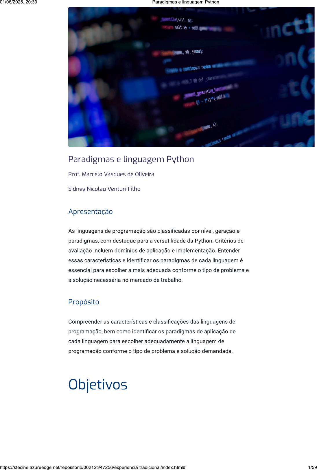 01/06/2025, 20:39 Paradigmas e linguagem Python uncti gamma): random def generating k): random Paradigmas e linguagem Python Prof. Marcelo Vasques de Oliveira Sidney Nicolau Venturi Filho Apresentação As linguagens de programação são classificadas por nível, geração e paradigmas, com destaque para a versatilidade da Python. Critérios de avaliação incluem domínios de aplicação e implementação. Entender essas características e identificar os paradigmas de cada linguagem é essencial para escolher a mais adequada conforme o tipo de problema e a solução necessária no mercado de trabalho. Propósito Compreender as características e classificações das linguagens de programação, bem como identificar os paradigmas de aplicação de cada linguagem para escolher adequadamente a linguagem de programação conforme o tipo de problema e solução demandada. Objetivos 1/5901/06/2025, 20:39 Paradigmas e linguagem Python Módulo 1 Classificando as linguagens de programação Classificar as linguagens de programação. Módulo 2 Critérios de avaliação de linguagens de programação Descrever critérios de avaliação de linguagens de programação. Módulo 3 Paradigmas de linguagens de programação Distinguir os paradigmas e suas características. Módulo 4 Métodos de implementação das linguagens Identificar métodos de implementação das linguagens. 2/5901/06/2025, 20:39 Paradigmas e linguagem Python Introdução As linguagens de programação são classificadas por nível, geração e paradigmas, destacando Python pela sua versatilidade. Critérios de avaliação incluem domínios de aplicação e implementação. Entender essas características e identificar os paradigmas de cada linguagem é essencial para escolher a mais adequada conforme o tipo de problema e a solução necessária no mercado de trabalho. Neste vídeo, apresentaremos o conteúdo, incluindo a classificação, os critérios de avaliação, os paradigmas e os métodos de implementação de linguagens de programação. Acompanhe! Para assistir a um vídeo sobre assunto, acesse a versão online deste conteúdo. Material para download Clique no botão abaixo para fazer download do conteúdo completo em formato PDF. Download material 3/5901/06/2025, 20:39 Paradigmas e linguagem Python 1 - Classificando as linguagens de programação Ao final deste módulo, você será capaz de classificar as linguagens de programação. Razões para estudarmos linguagens de programação Estudar linguagens de programação é fundamental para entender a base do desenvolvimento de software, que é imprescindível em diversas áreas da ciência e tecnologia. Conhecer diferentes linguagens e paradigmas permite selecionar a ferramenta adequada para resolver problemas específicos, aumentando a eficiência e eficácia do trabalho. Neste vídeo, falaremos sobre linguagem de programação e produtividade do programador. Abordaremos também o papel da abstração nas linguagens de programação. Confira! Para assistir a um vídeo sobre assunto, acesse a versão online deste conteúdo. Linguagem de programação e produtividade do programador 4/5901/06/2025, 20:39 Paradigmas e linguagem Python Um programa de computador, ou software, é um conjunto de instruções que orientam hardware do computador para o que deve ser feito. 0 software pode ser classificado em aplicativo ou básico. Veja a diferença entre eles. Windows11 Aplicativo Básico Visa oferecer ao usuário X Compreende programas facilidades para realizar essenciais ao uma tarefa laboral ou de funcionamento do lazer. computador. sistema operacional é principal exemplo. Uma linguagem de programação é um software básico, que permite ao programador escrever outros programas de computador, seja ela um software aplicativo ou básico. A codificação de um programa em uma linguagem de programação, chama-se programa-fonte, que ainda não pode ser entendido e executado pelo hardware do computador, pois este apenas entende a linguagem de máquina ou linguagem binária, na qual cada instrução é uma sequência de bits (0 ou 1). Uma linguagem de programação é um formalismo com um conjunto de símbolos, palavras reservadas, comandos, regras sintáticas e semânticas e outros recursos, que permitem especificar instruções de um programa. As linguagens de programação surgiram da necessidade de liberar programador dos detalhes mais íntimos das máquinas em que a programação é feita, permitindo a programação em termos mais próximos ao problema, ou em nível mais alto. A produtividade de um programador ao escrever código em uma linguagem de programação está intimamente relacionada à facilidade de aprendizado, à leitura e à escrita de programas naquela linguagem, 5/5901/06/2025, 20:39 Paradigmas e linguagem Python somada à expertise do programador no contato com ela. Isto é, quanto mais programador conhecer as propriedades superlativas daquela linguagem, melhores e mais eficientes serão os códigos escritos. Pessoa escrevendo código em computador. Segundo o cientista da computação holandês, Edsger Dijkstra: aspecto mais importante, mas também mais elusivo de qualquer ferramenta, é sua influência nos hábitos daqueles que se treinam no seu uso. Se a ferramenta é uma linguagem de programação, essa influência é, gostemos ou não, uma influência em nosso hábito de pensar. (Edsger Dijkstra) papel da abstração nas linguagens de programação Abstração é o processo de identificação das qualidades e/ou propriedades relevantes para contexto que está sendo analisado e desprezando o que seja irrelevante. Um modelo é uma abstração da realidade. Um programa de computador é um modelo, pois representa a solução de um problema em termos algorítmicos. Assim sendo, a abstração permeia toda a atividade de programação de computadores. A linguagem de máquina foi a primeira a ser criada para a prática de programação. Trata-se da linguagem nativ